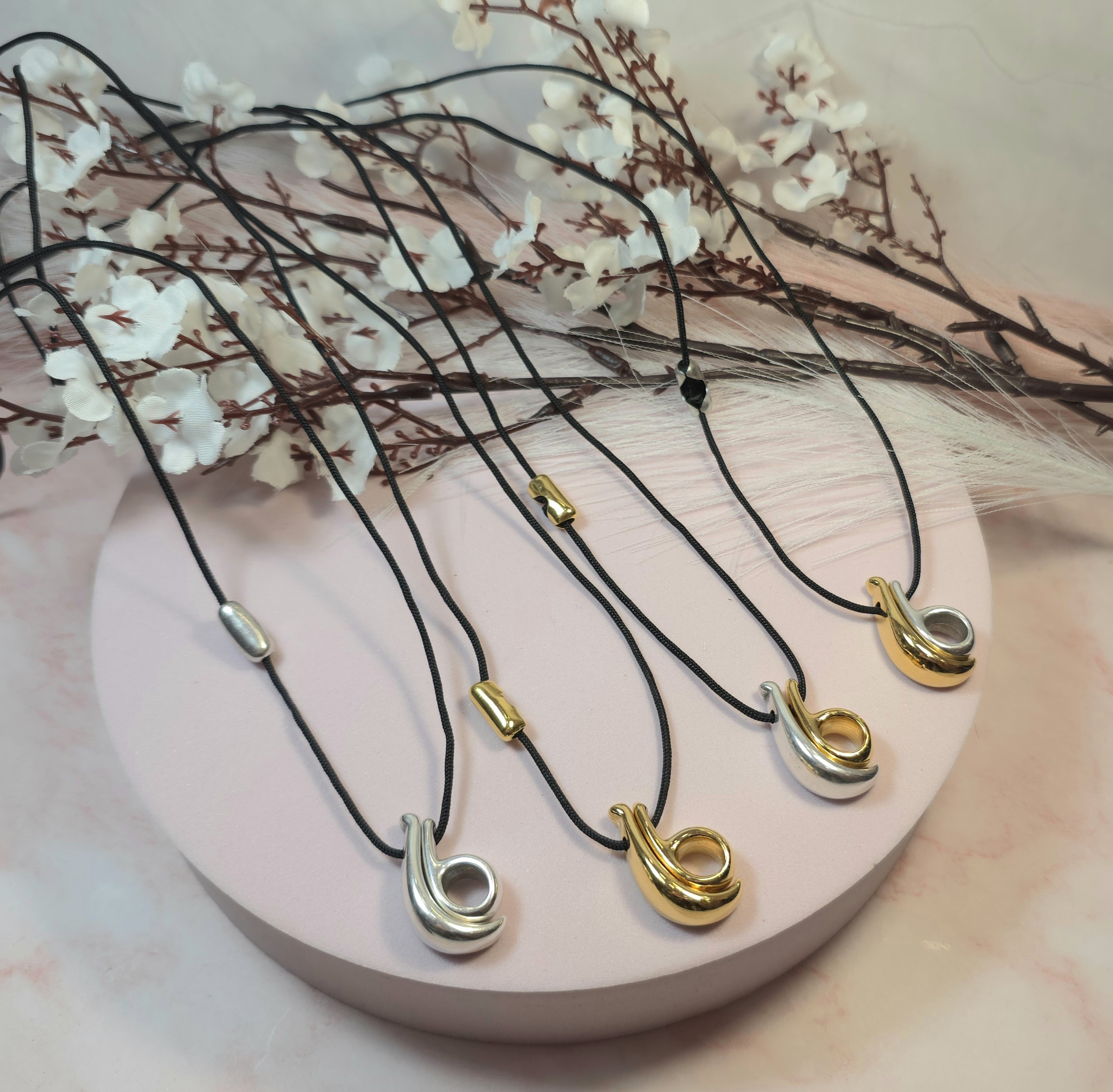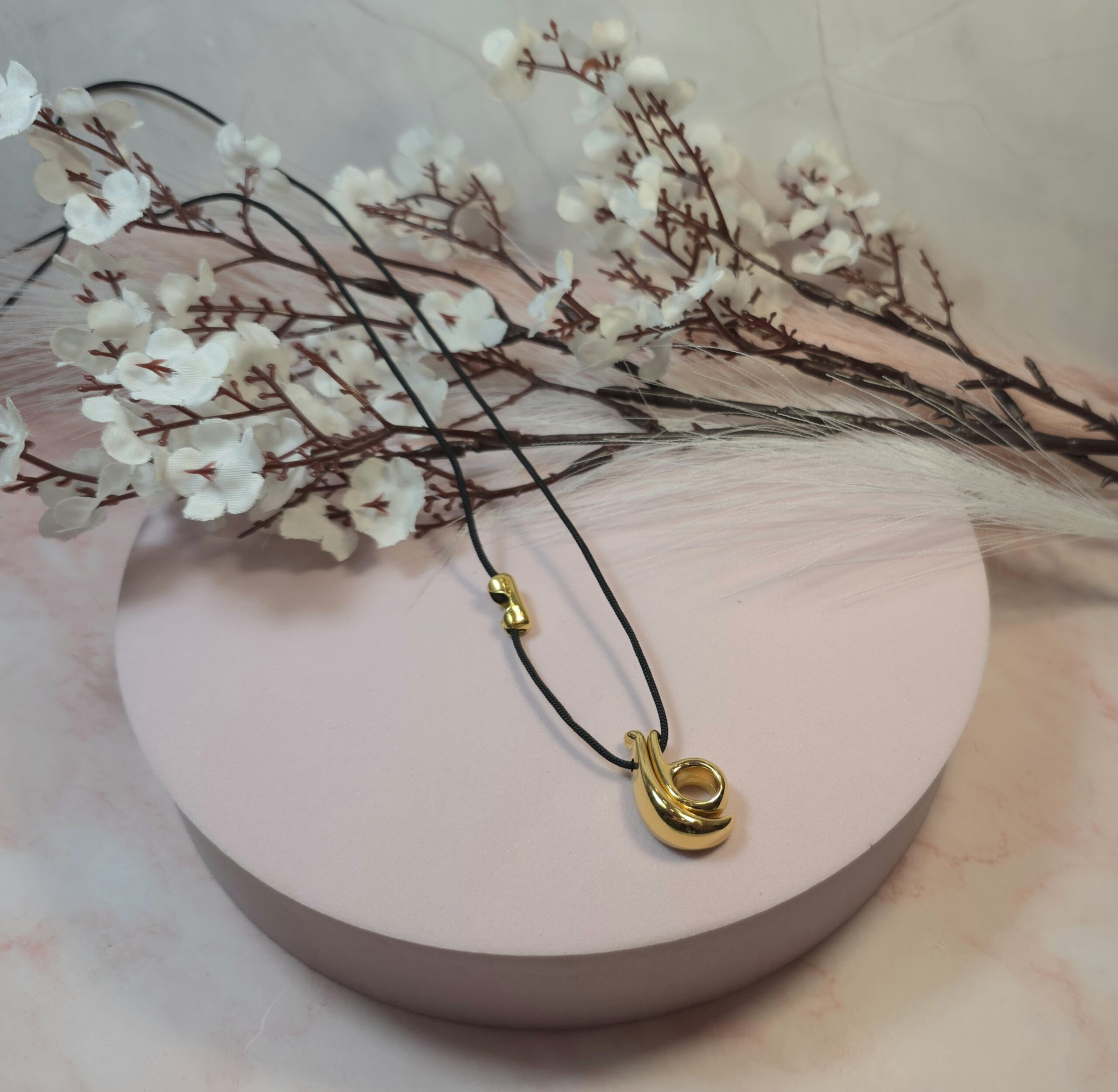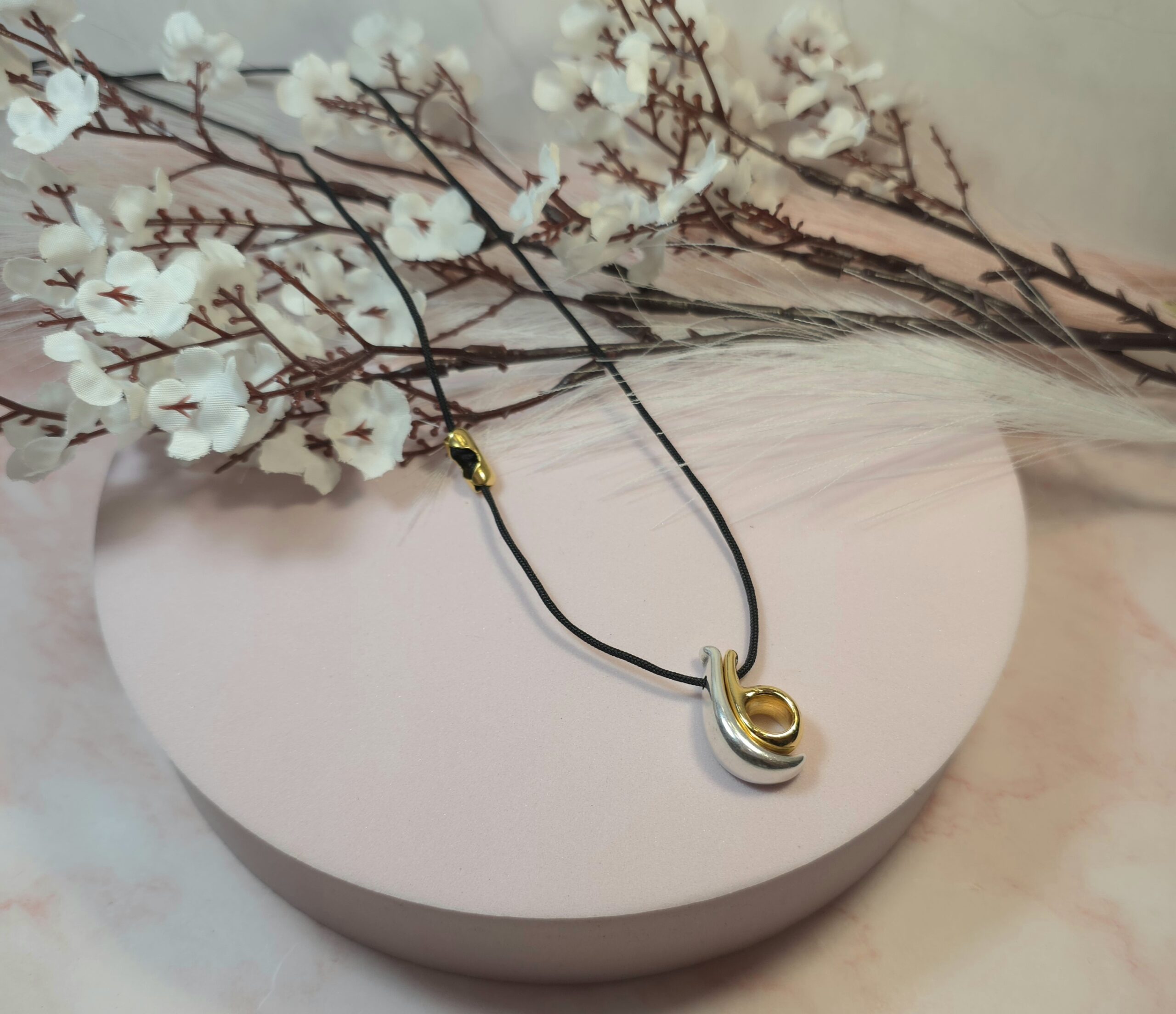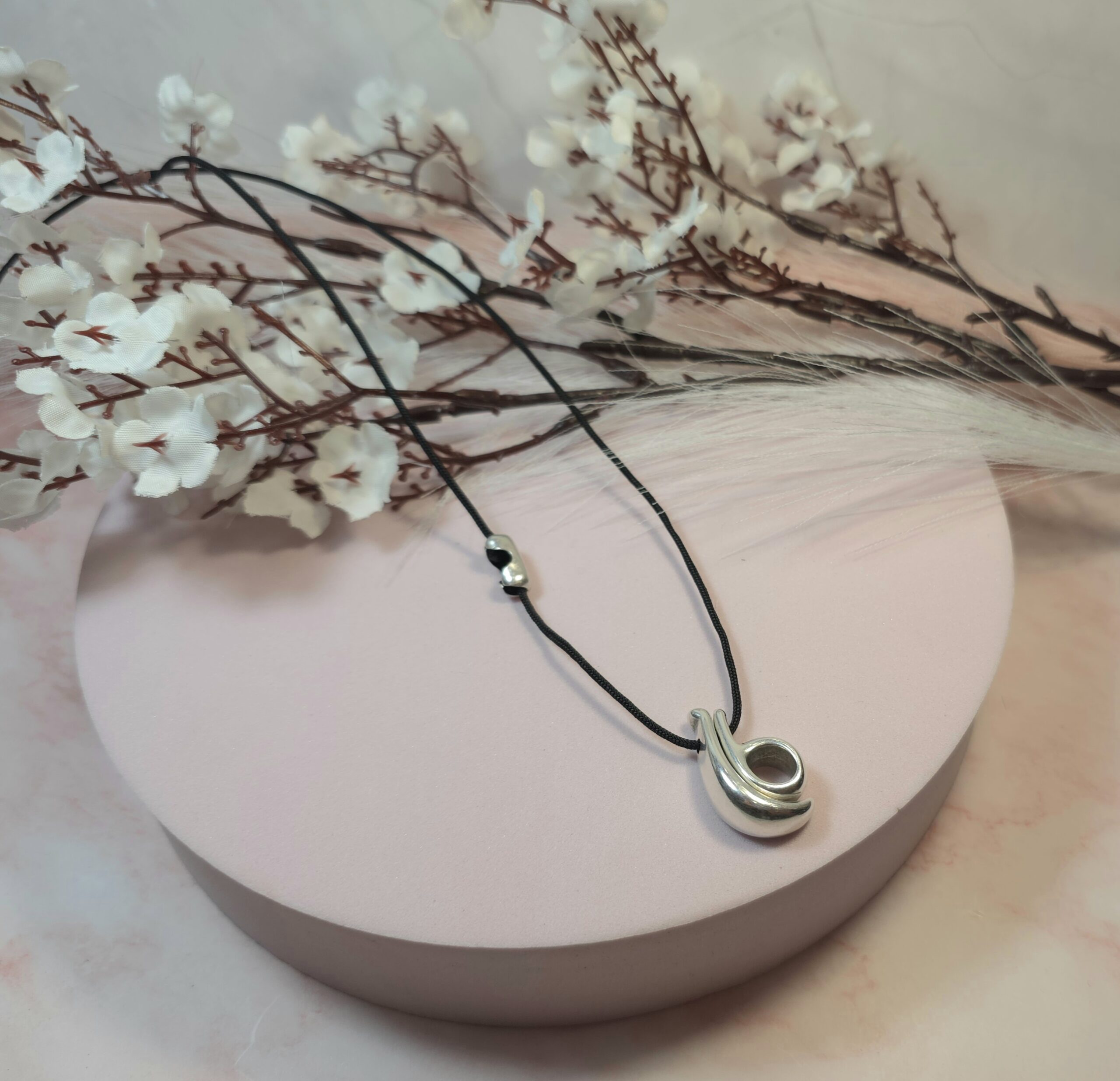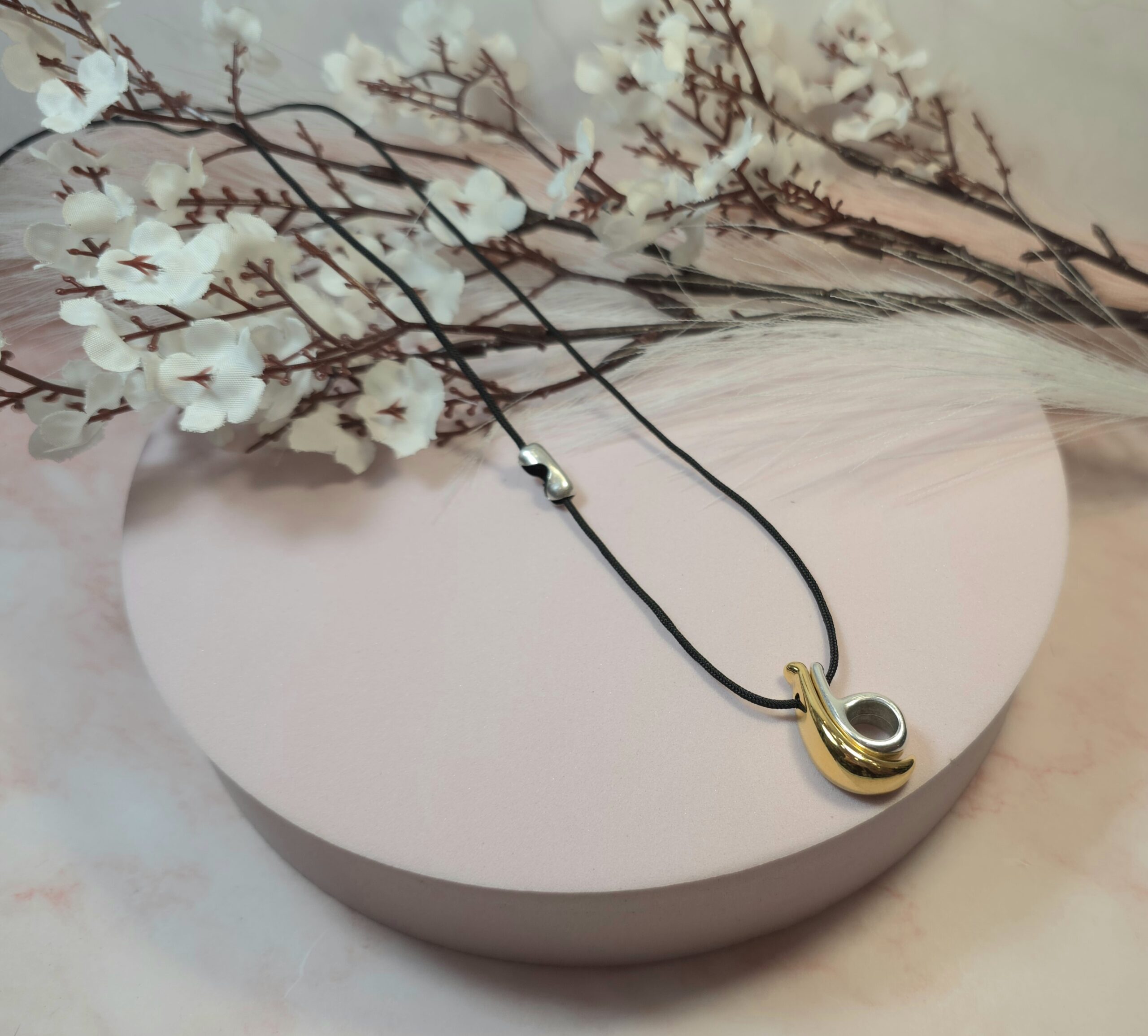 Χειροποίητο κολιέ γούρι, από μαύρο κορδόνι και επάργυρο ή επίχρυσο στοιχείο 26. Είναι υποαλλεργικό. Έχει διακοσμητικό κούμπωμα στο πλάι και μπορεί να φορεθεί και διπλό.