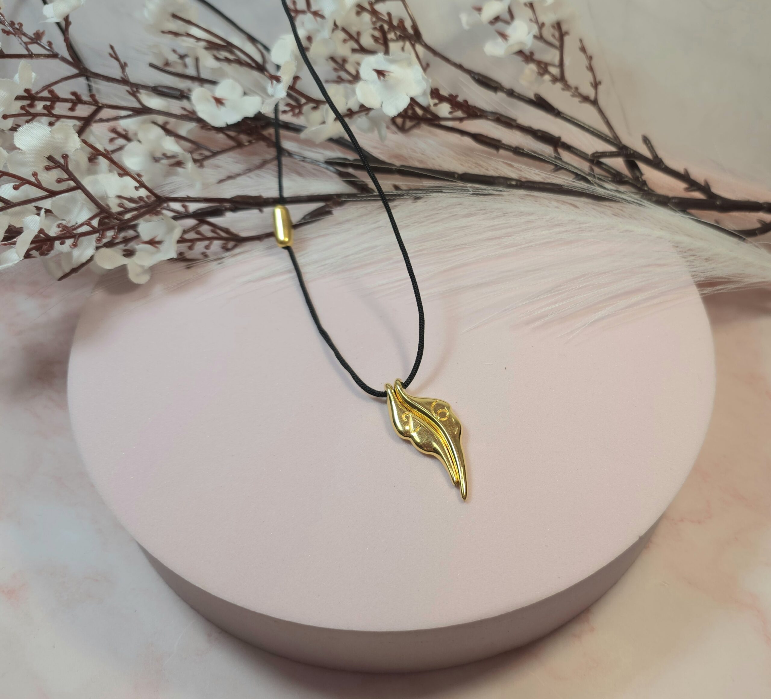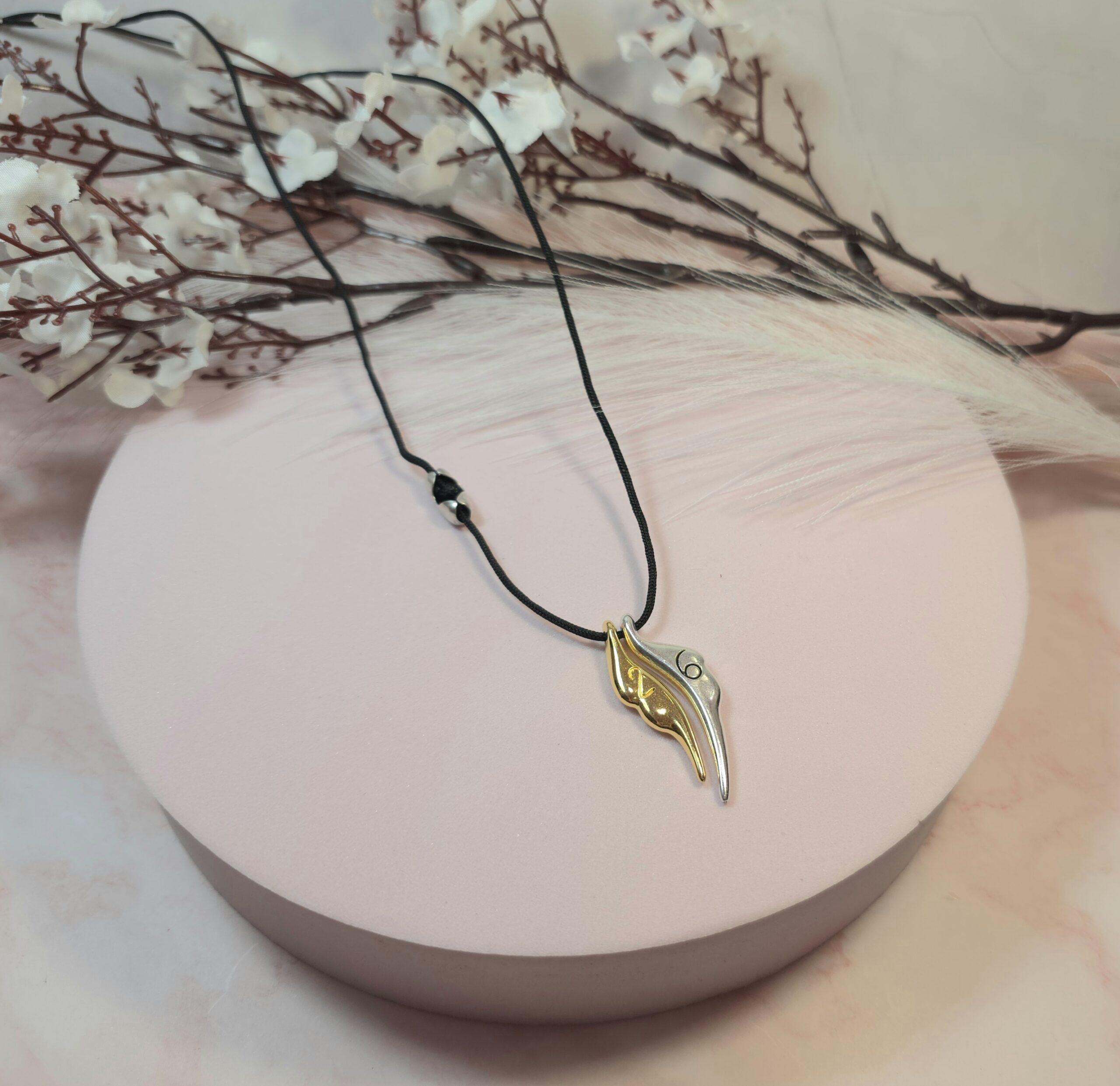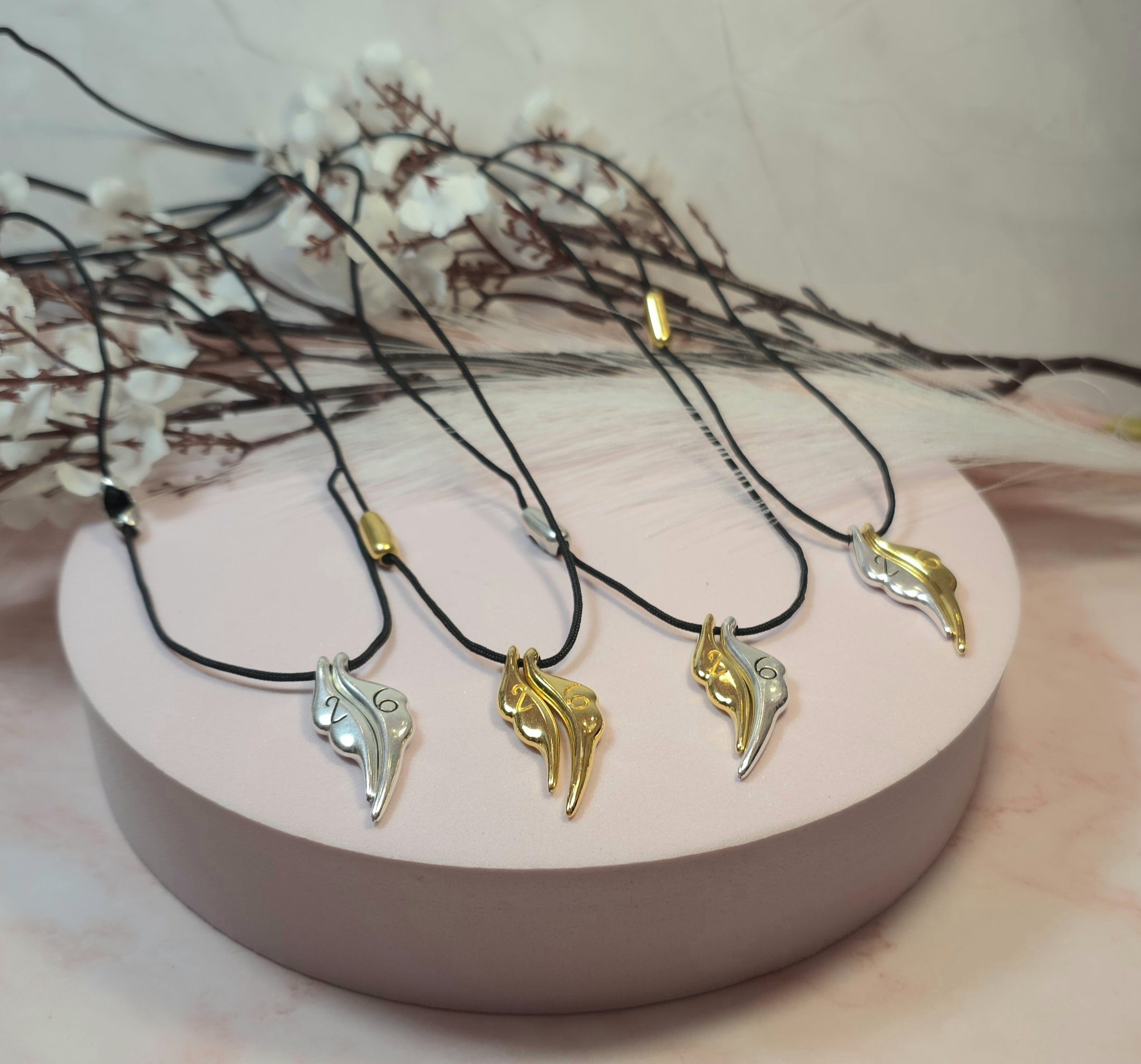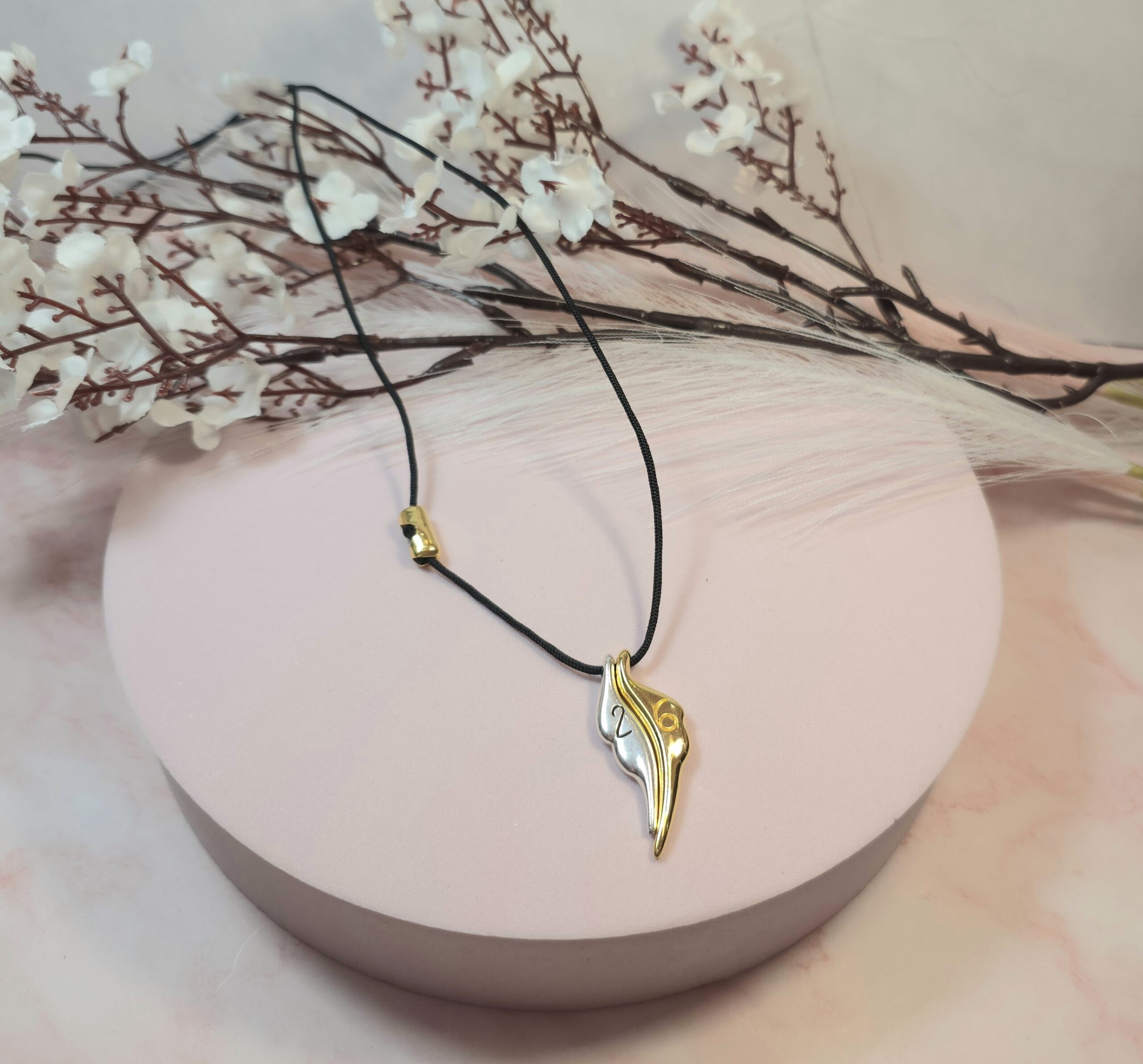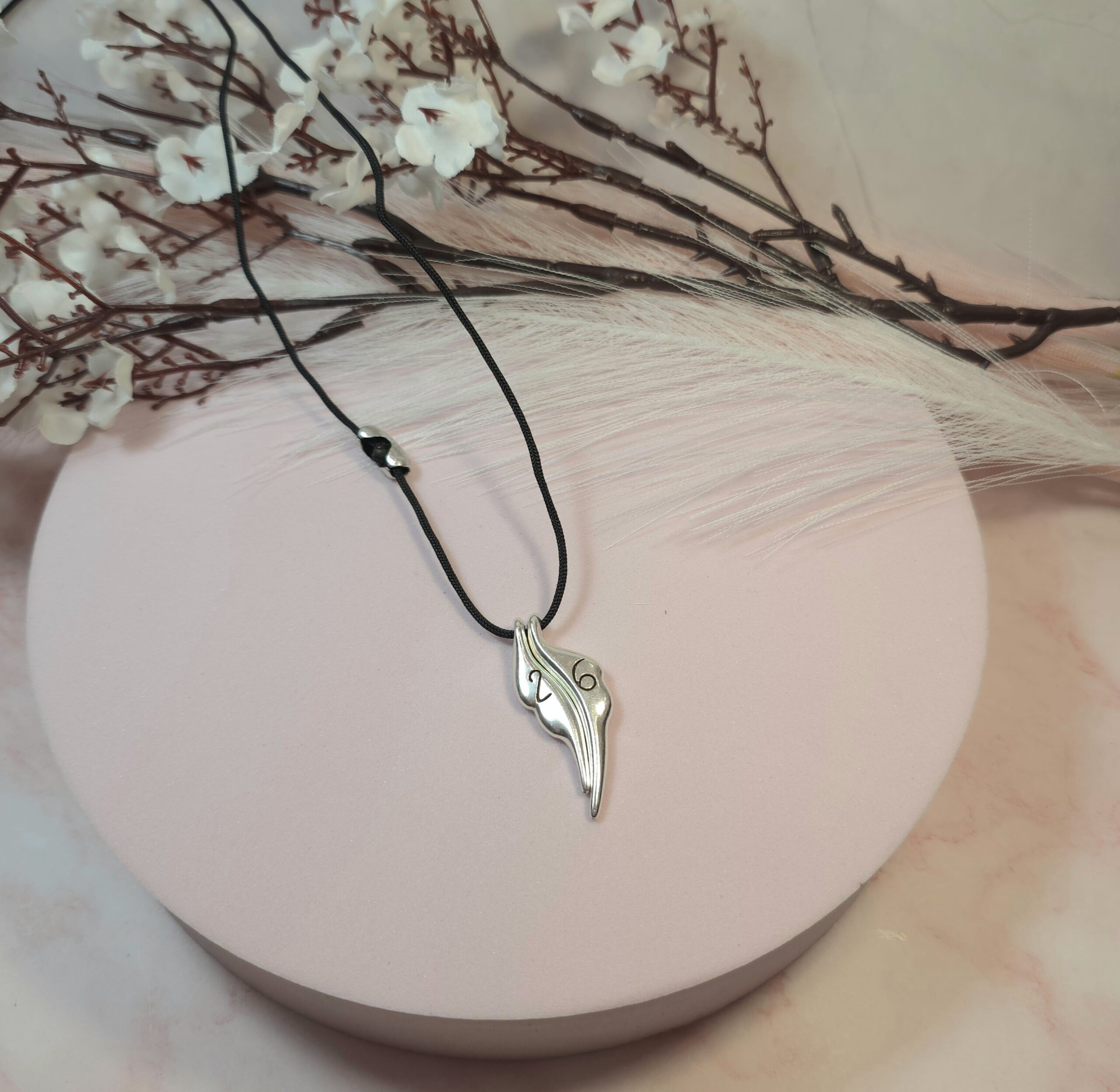 Χειροποίητο κολιέ γούρι, από μαύρο κορδόνι και επάργυρο ή επίχρυσο στοιχείο φτερά με το 26 πάνω. Είναι υποαλλεργικό. Έχει διακοσμητικό κούμπωμα στο πλάι και μπορεί να φορεθεί και διπλό.