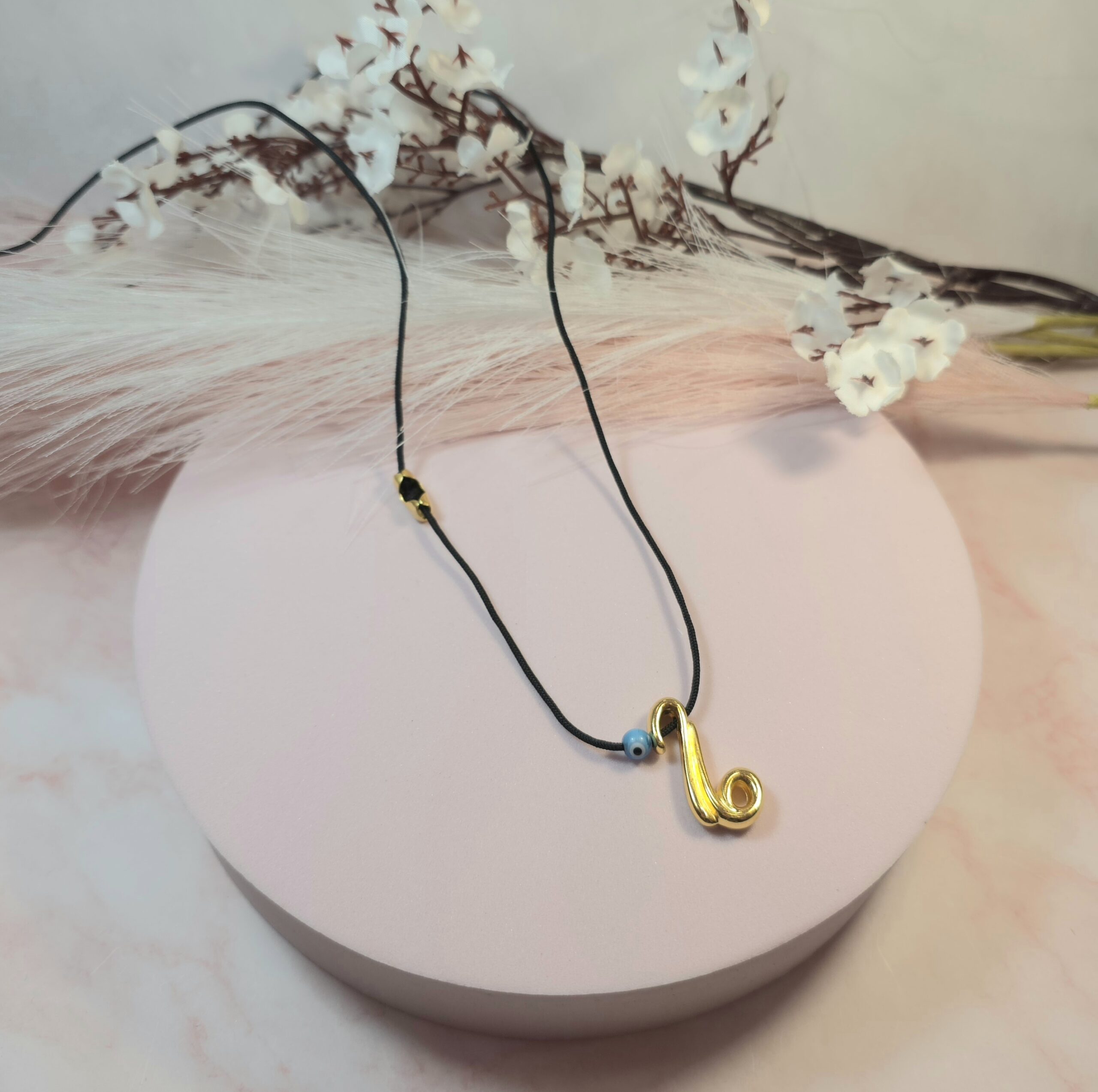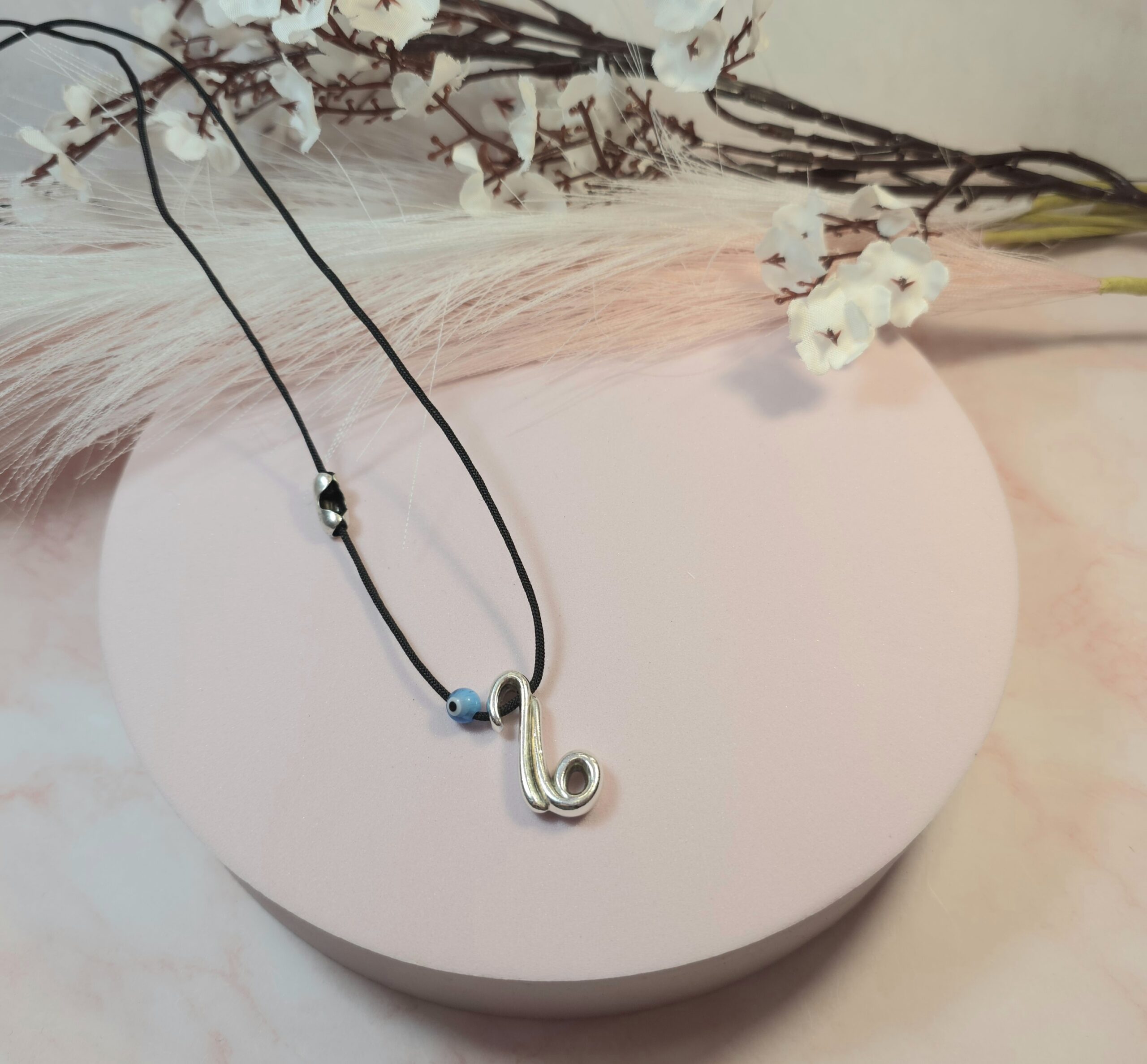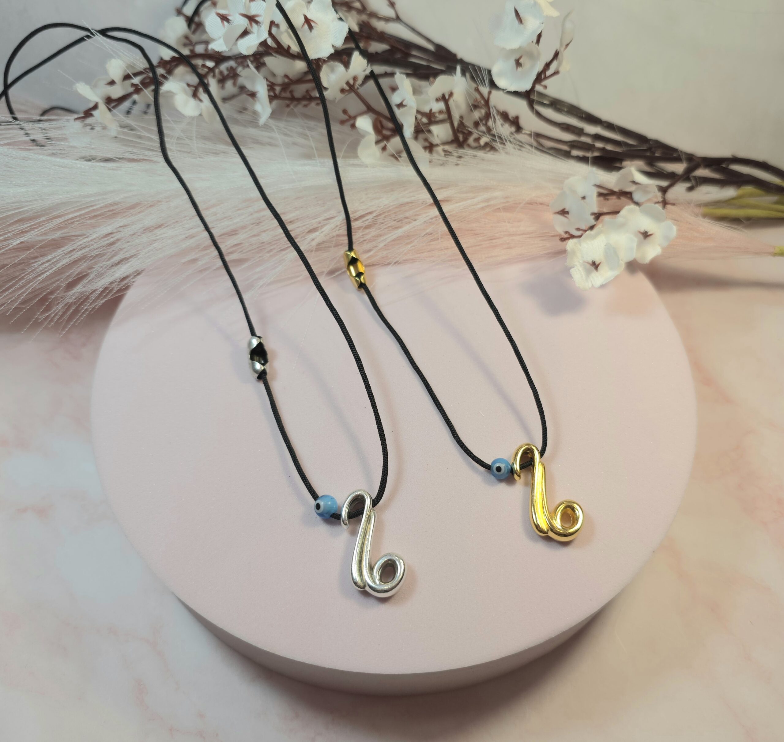 Χειροποίητο κολιέ γούρι, από μαύρο κορδόνι και επάργυρο ή επίχρυσο στοιχείο 26. Είναι υποαλλεργικό. Έχει διακοσμητικό κούμπωμα στο πλάι και μπορεί να φορεθεί και διπλό.