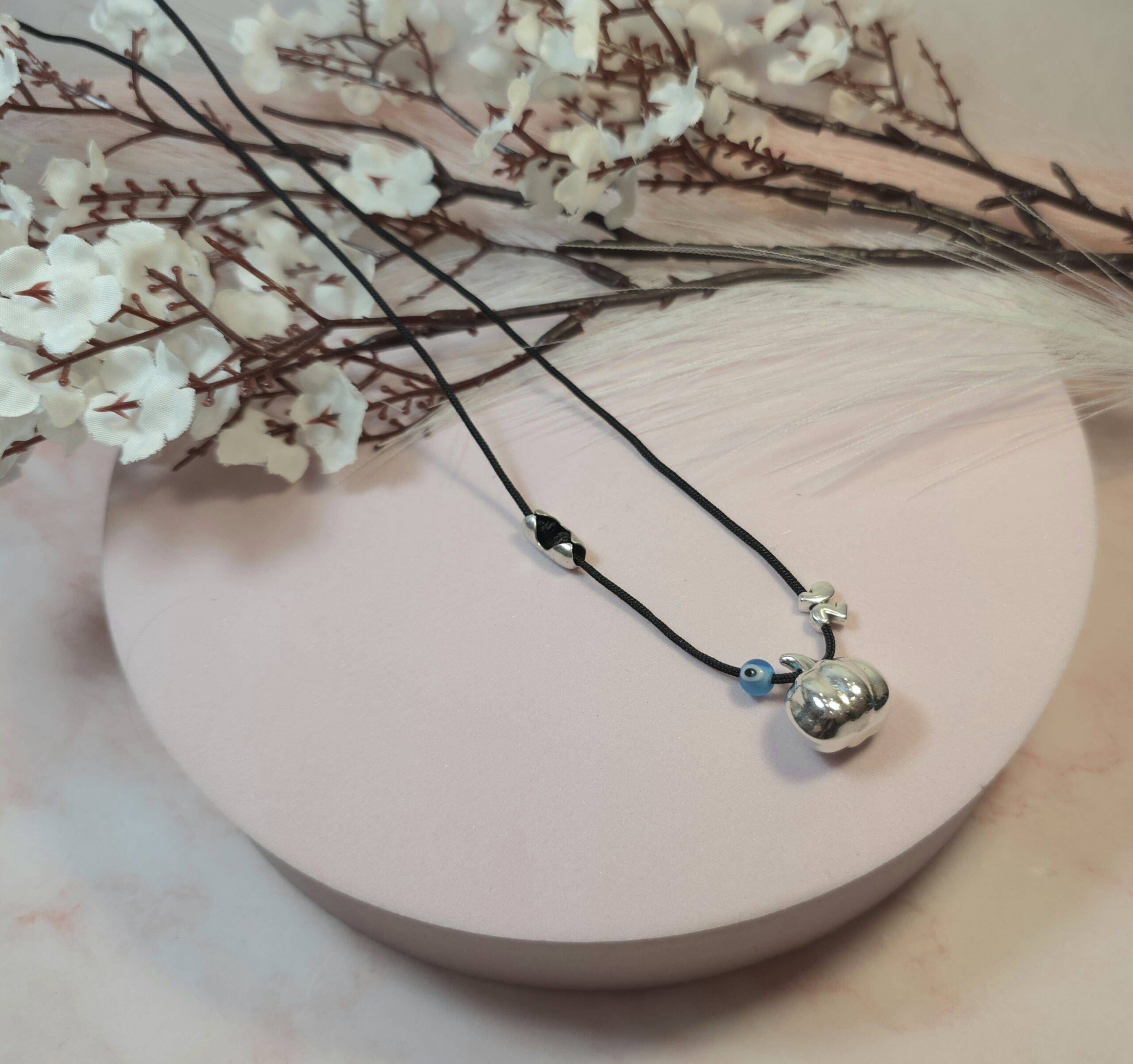 Χειροποίητο κολιέ γούρι, από μαύρο κορδόνι και επάργυρο στοιχείο κολοκύθα με ματάκι και το 26. Είναι υποαλλεργικό. Έχει διακοσμητικό κούμπωμα στο πλάι και μπορεί να φορεθεί και διπλό.