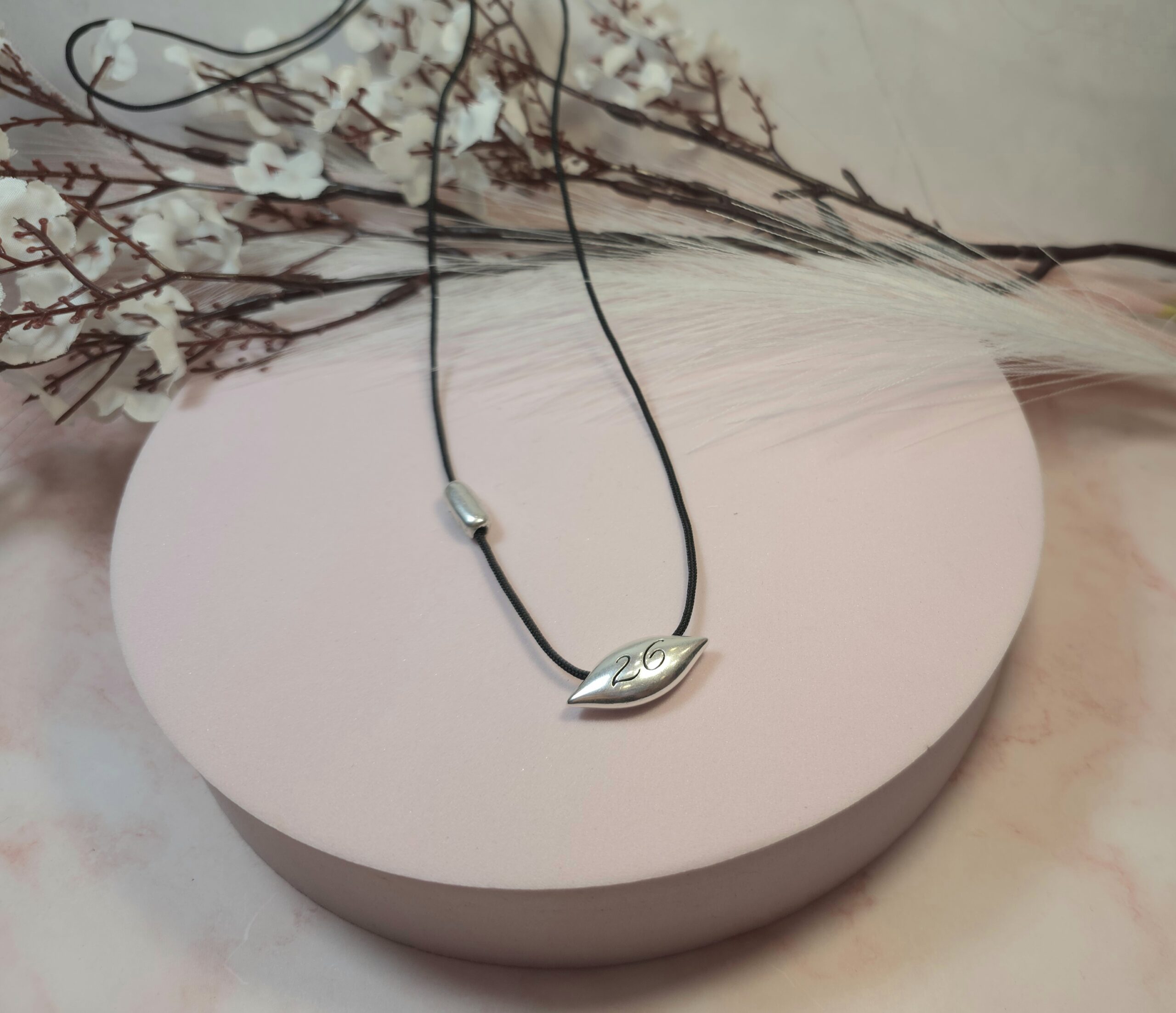 Χειροποίητο κολιέ γούρι, από μαύρο κορδόνι και επάργυρο ή επίχρυσο στοιχείο μάτι από τη μία πλευρά και το 26 από την άλλη. Είναι υποαλλεργικό. Έχει διακοσμητικό κούμπωμα στο πλάι και μπορεί να φορεθεί και διπλό.