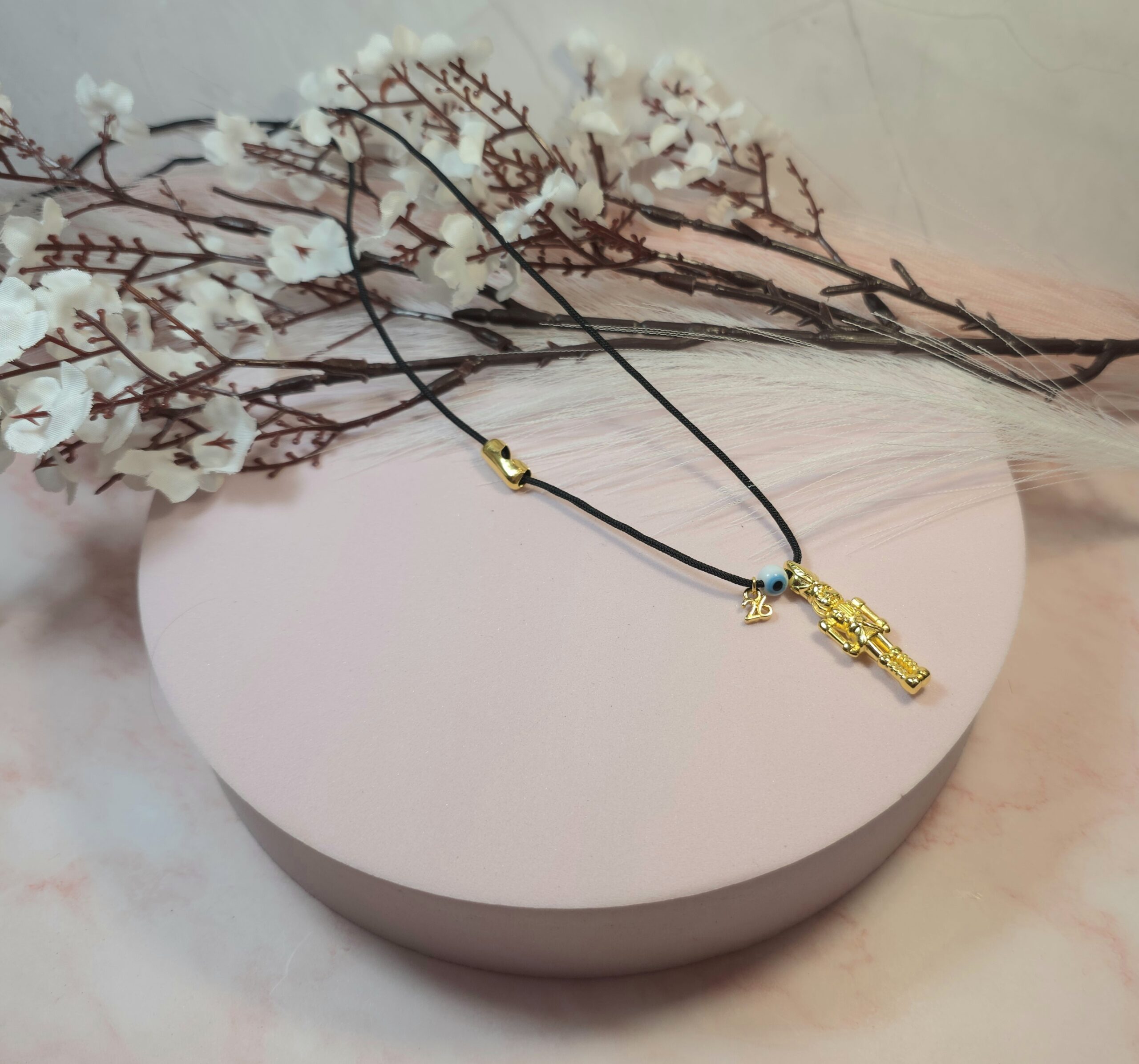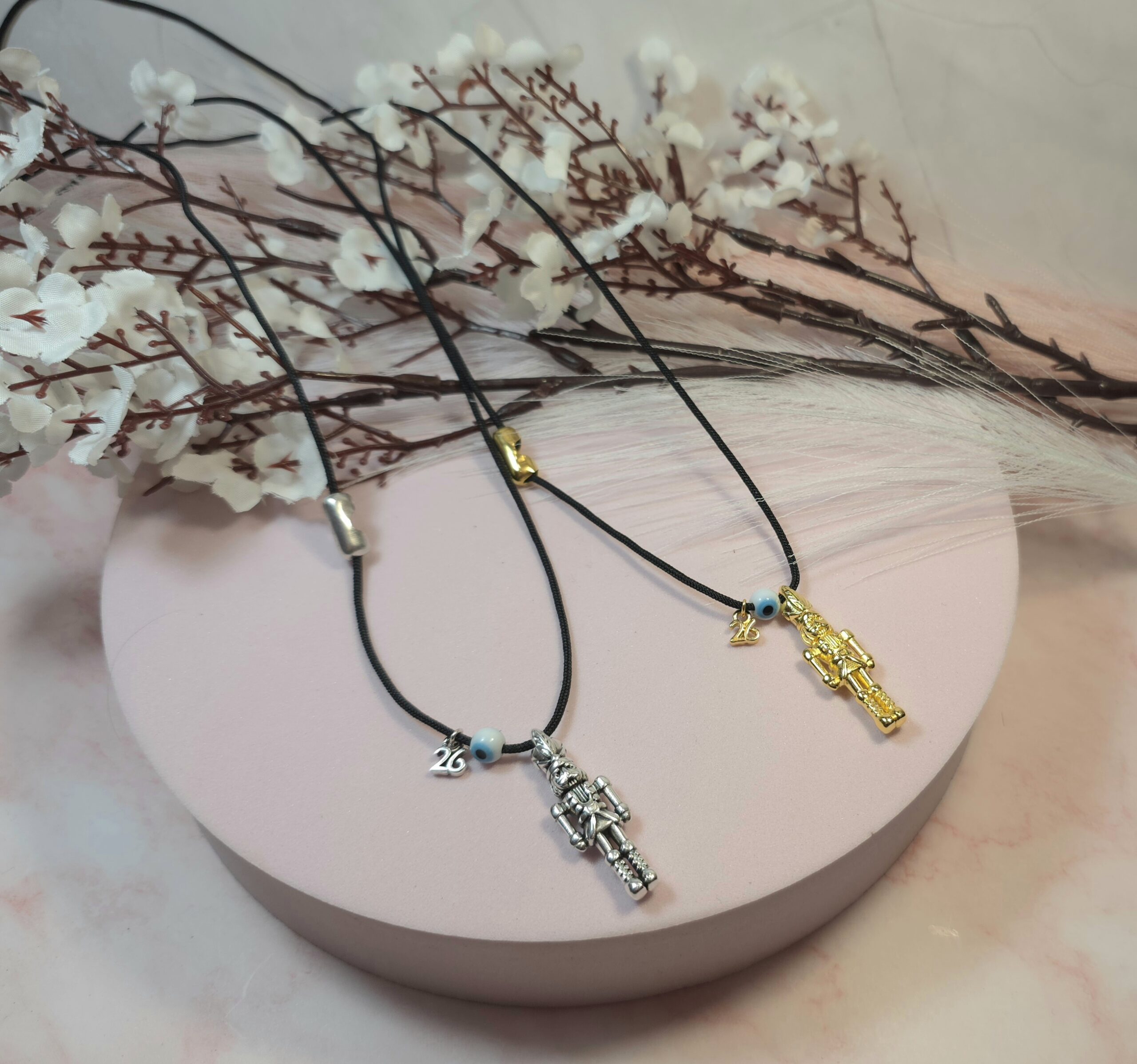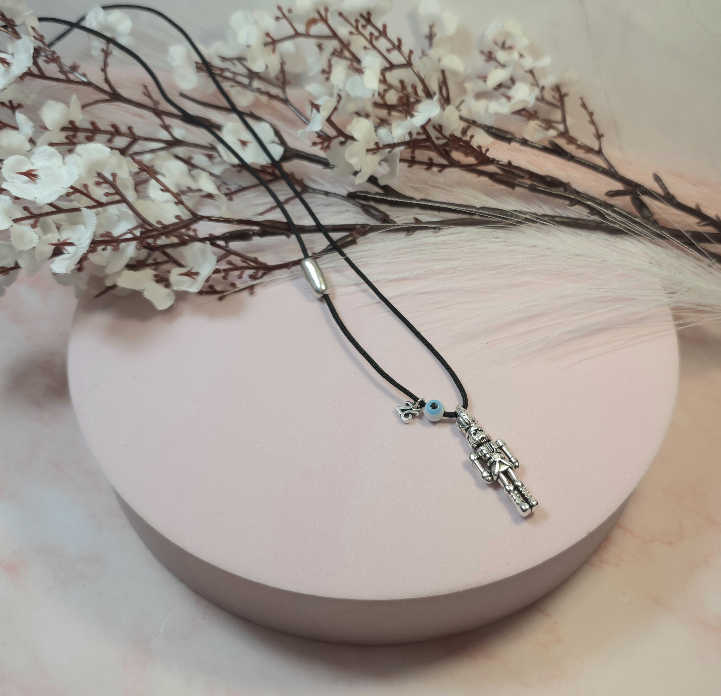 Χειροποίητο κολιέ γούρι, από μαύρο κορδόνι και επάργυρο στοιχείο μολυβένιο στρατιώτη με ματάκι και το 26. Είναι υποαλλεργικό. Έχει διακοσμητικό κούμπωμα στο πλάι και μπορεί να φορεθεί και διπλό.