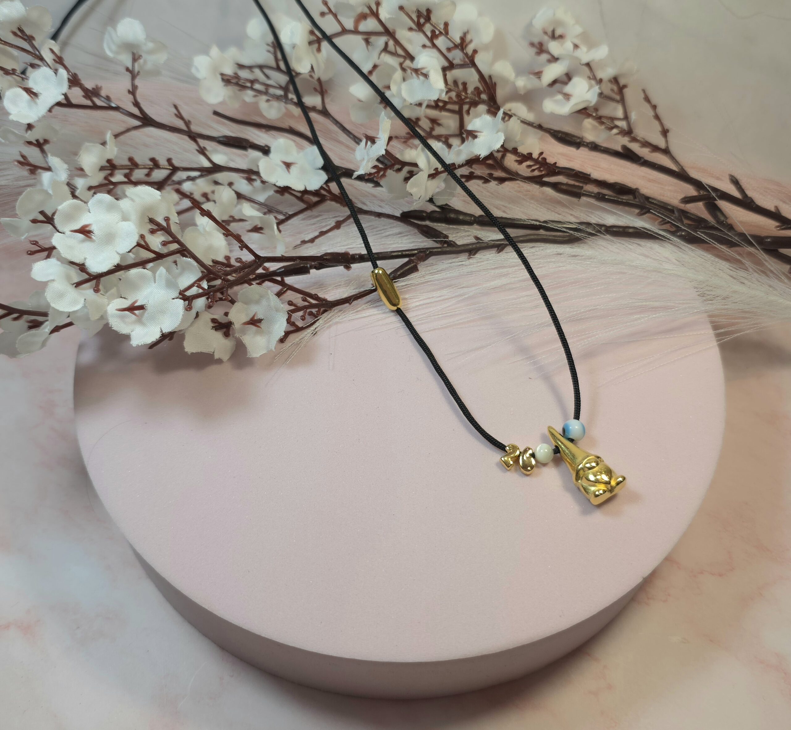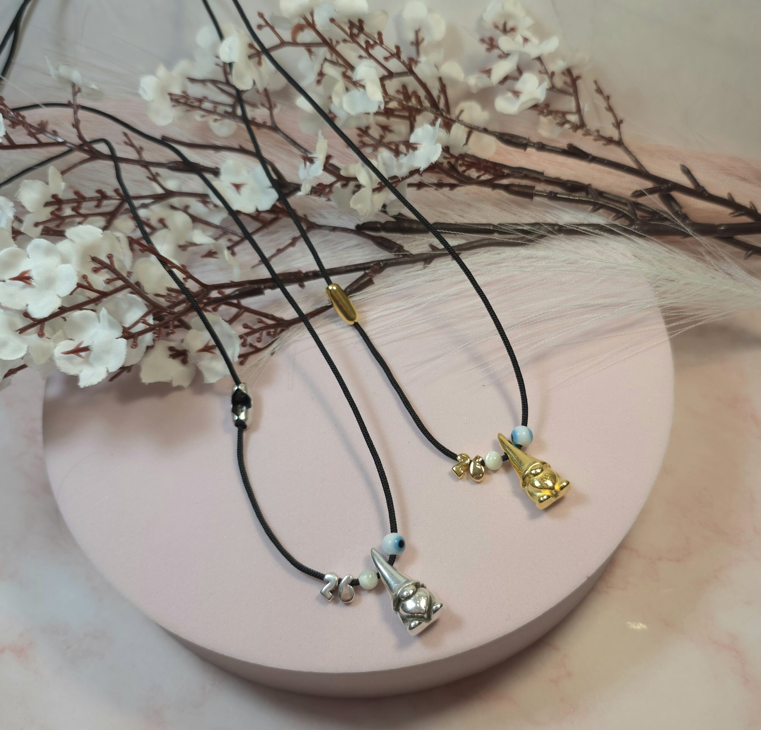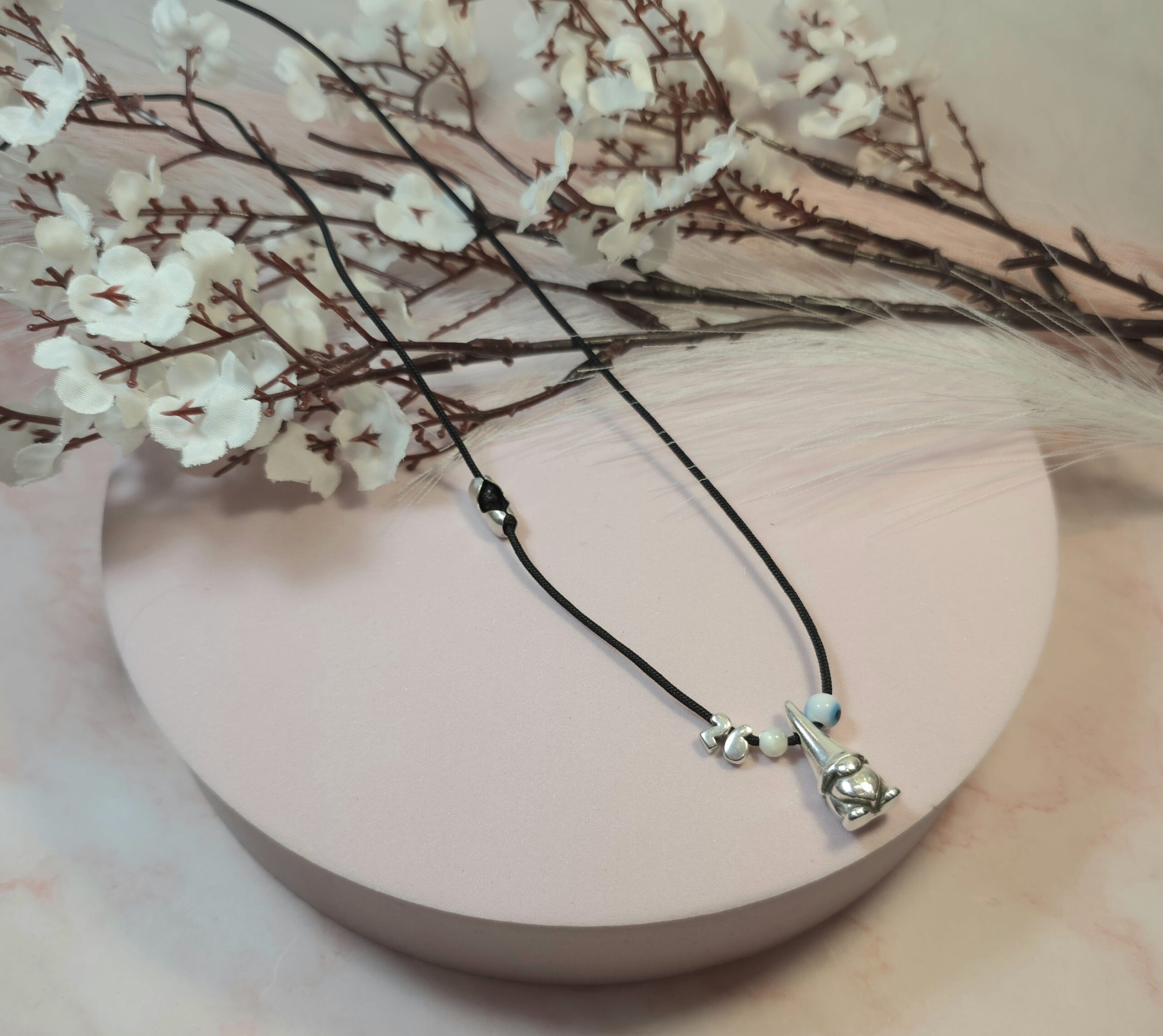 Χειροποίητο κολιέ γούρι, από μαύρο κορδόνι και επάργυρο στοιχείο νάνο με ματάκι και το 26. Είναι υποαλλεργικό. Έχει διακοσμητικό κούμπωμα στο πλάι και μπορεί να φορεθεί και διπλό.