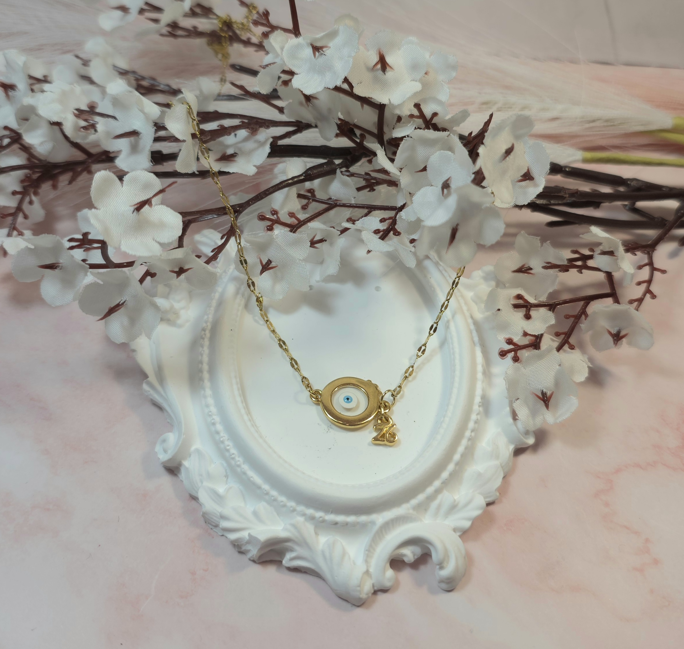 Χειροποίητο κολιέ γούρι, από ατσάλινη αλυσίδα και επίχρυσο στοιχείο ρόδι και το 26. Είναι υποαλλεργικό. Έχει αυξομείωση.