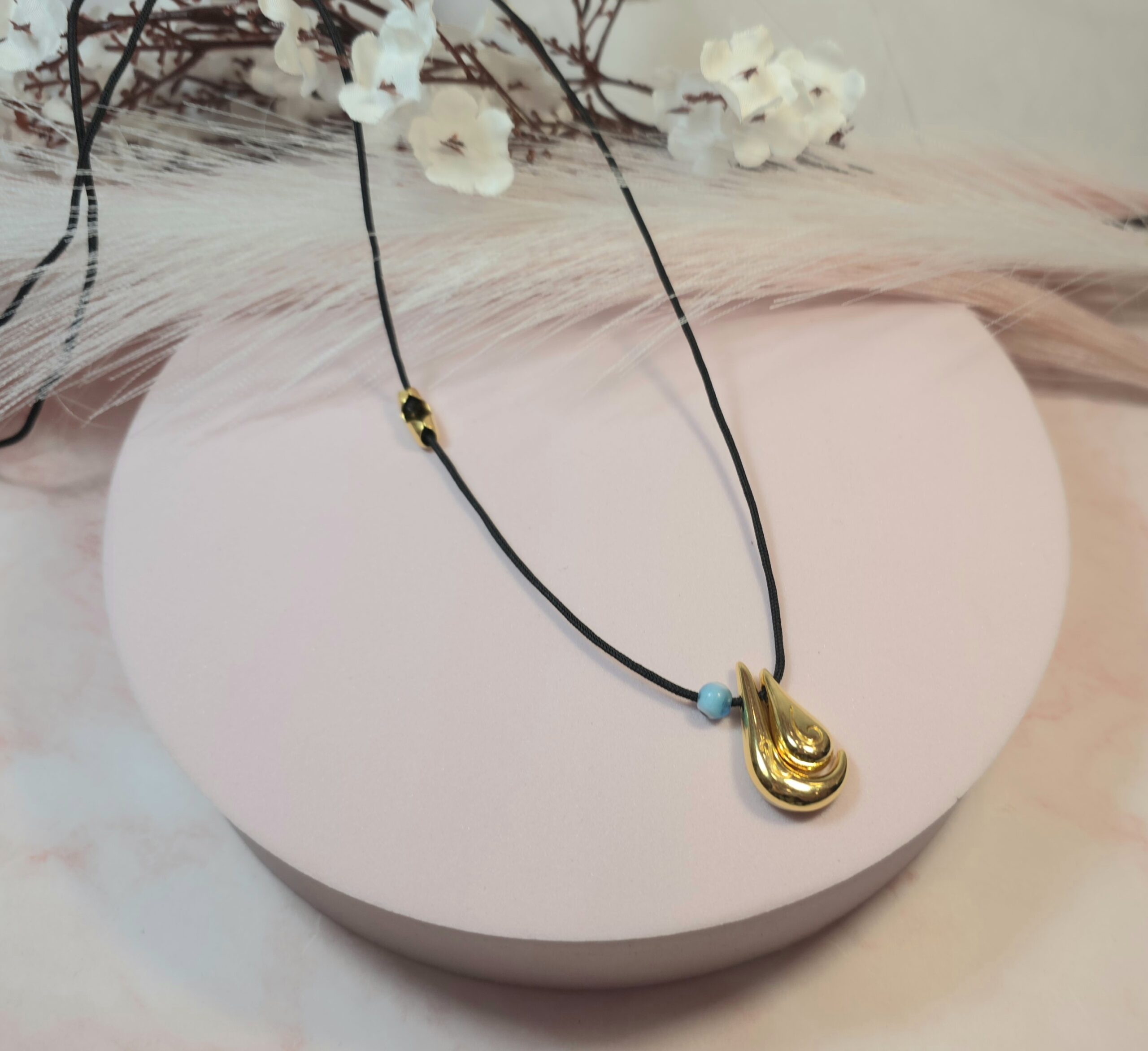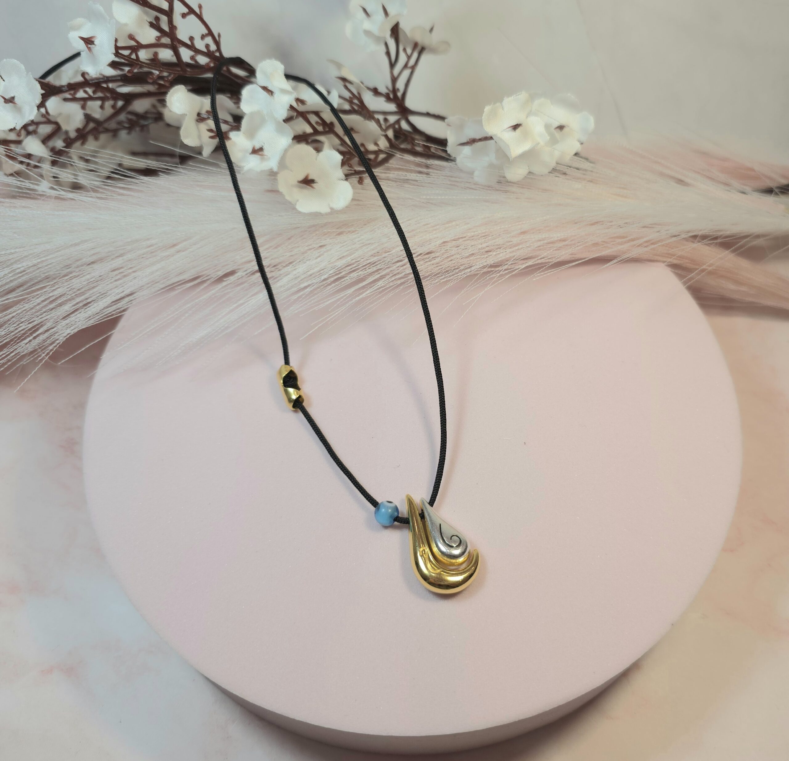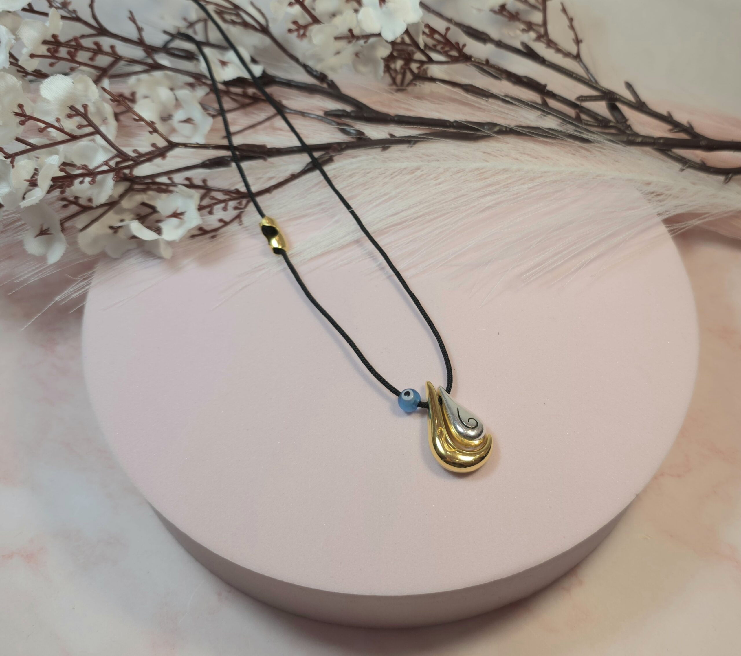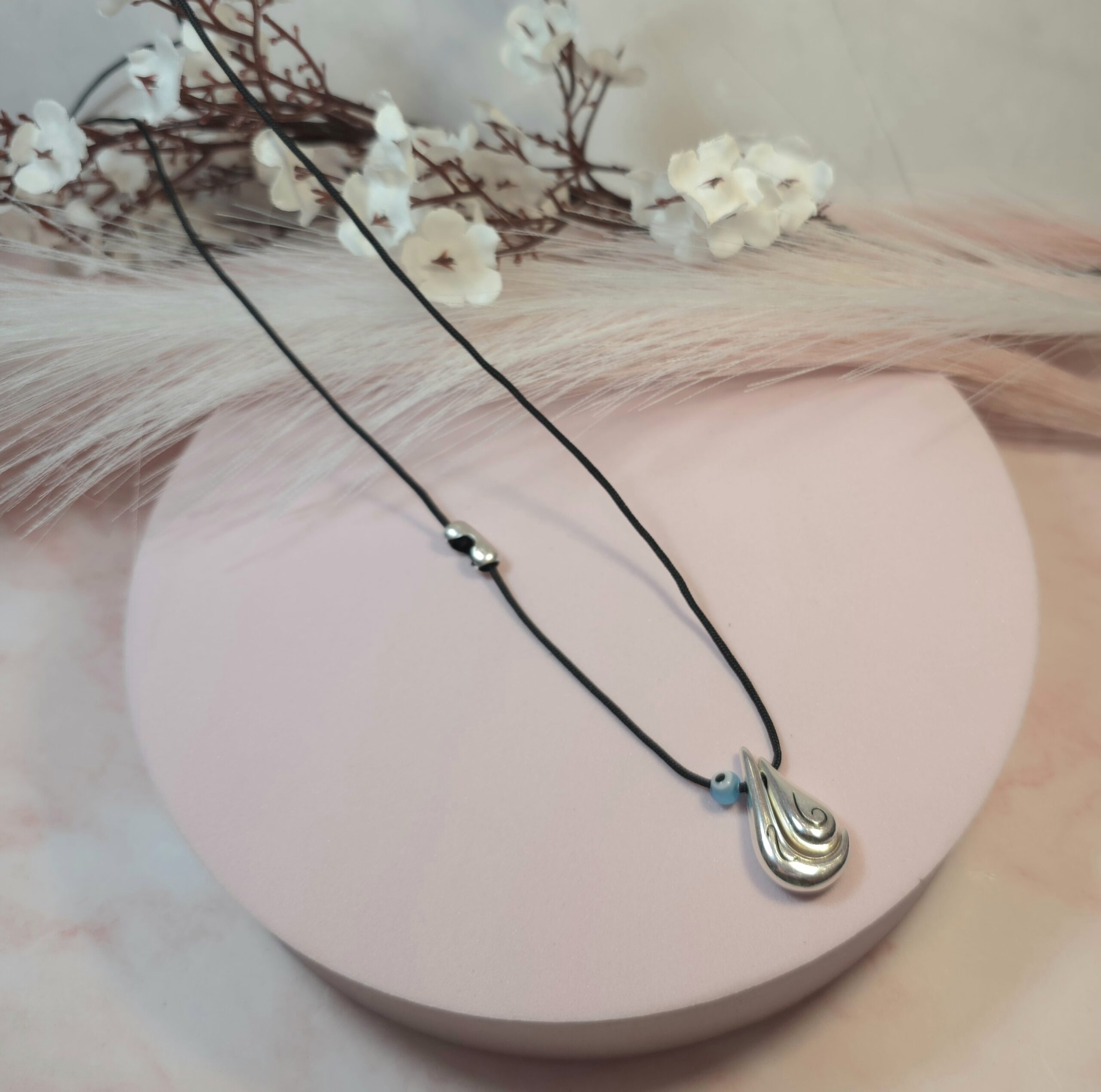 Χειροποίητο κολιέ γούρι, από μαύρο κορδόνι και επάργυρο ή επίχρυσο στοιχείο σταγόνα με το 25 πάνω. Είναι υποαλλεργικό. Έχει διακοσμητικό κούμπωμα στο πλάι και μπορεί να φορεθεί και διπλό.