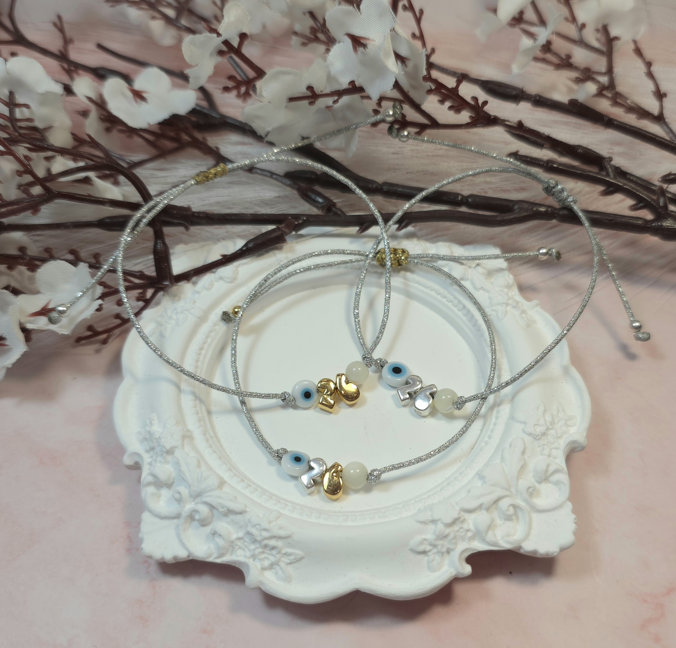 Χειροποίητο βραχιόλι γούρι, από ασημί κορδόνι με gliter και επάργυρα ή επίχρυσα στοιχεία 26 πάνω και ματάκι. Είναι υποαλλεργικό. Έχει αυξομείωση.
