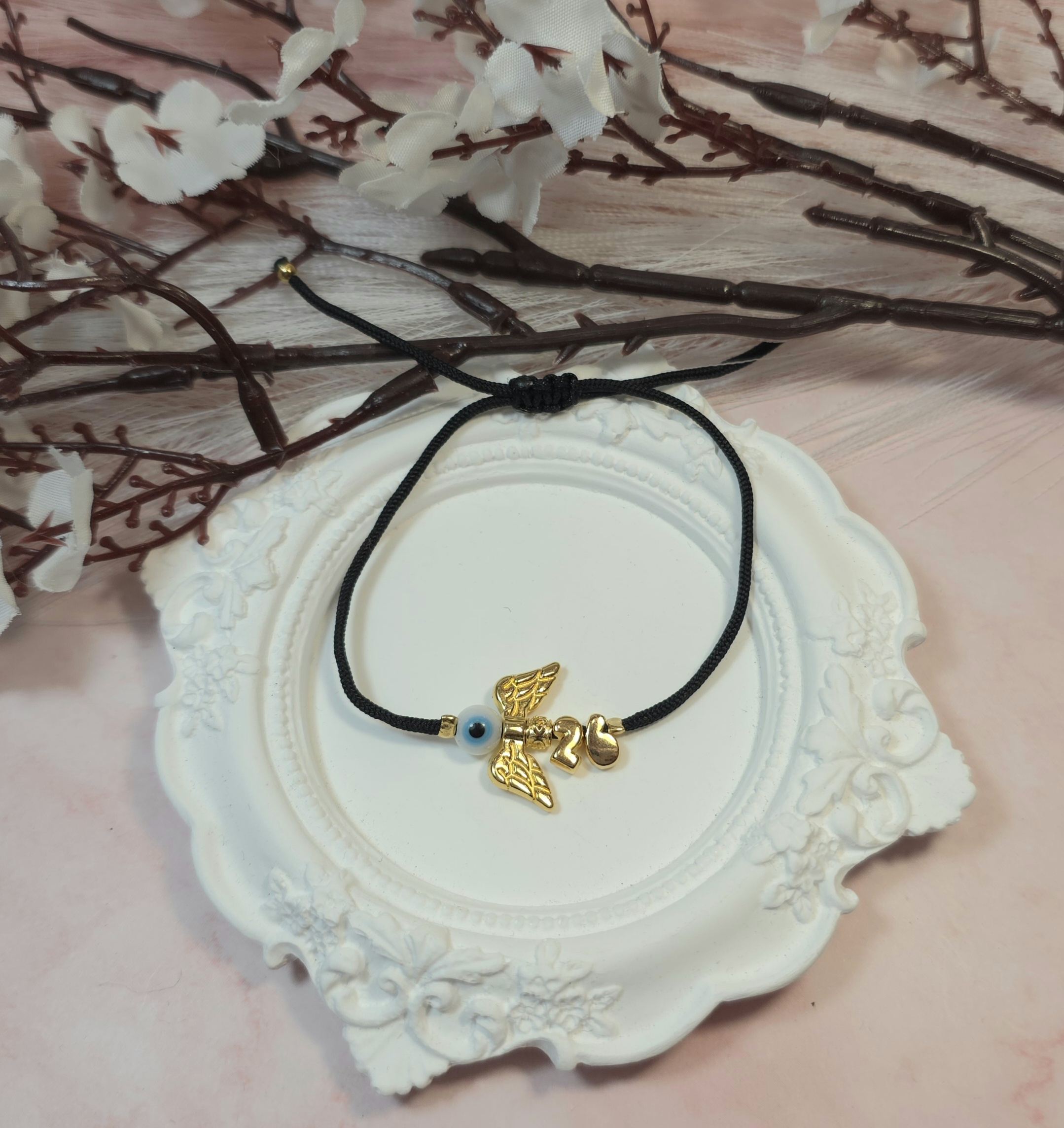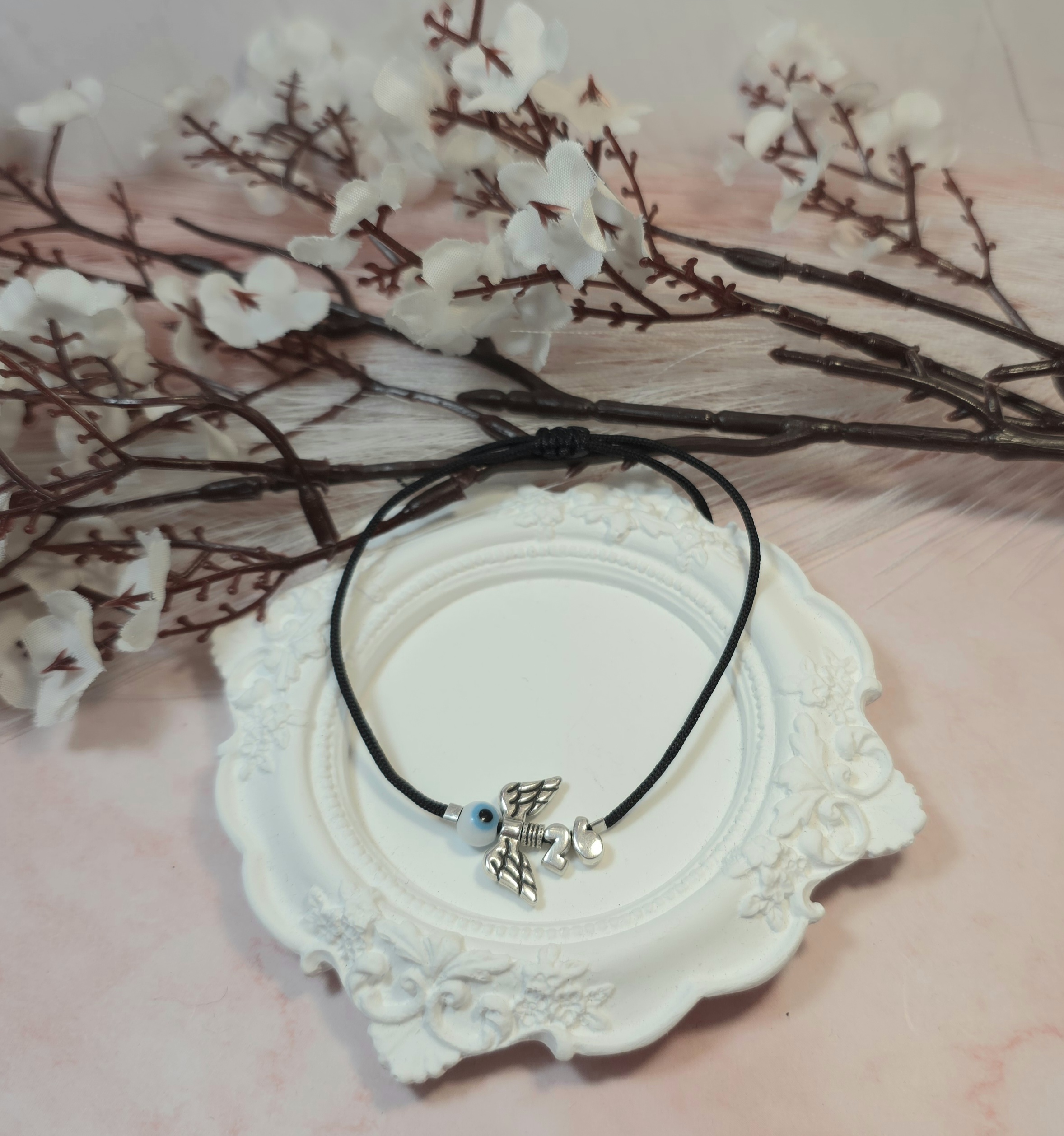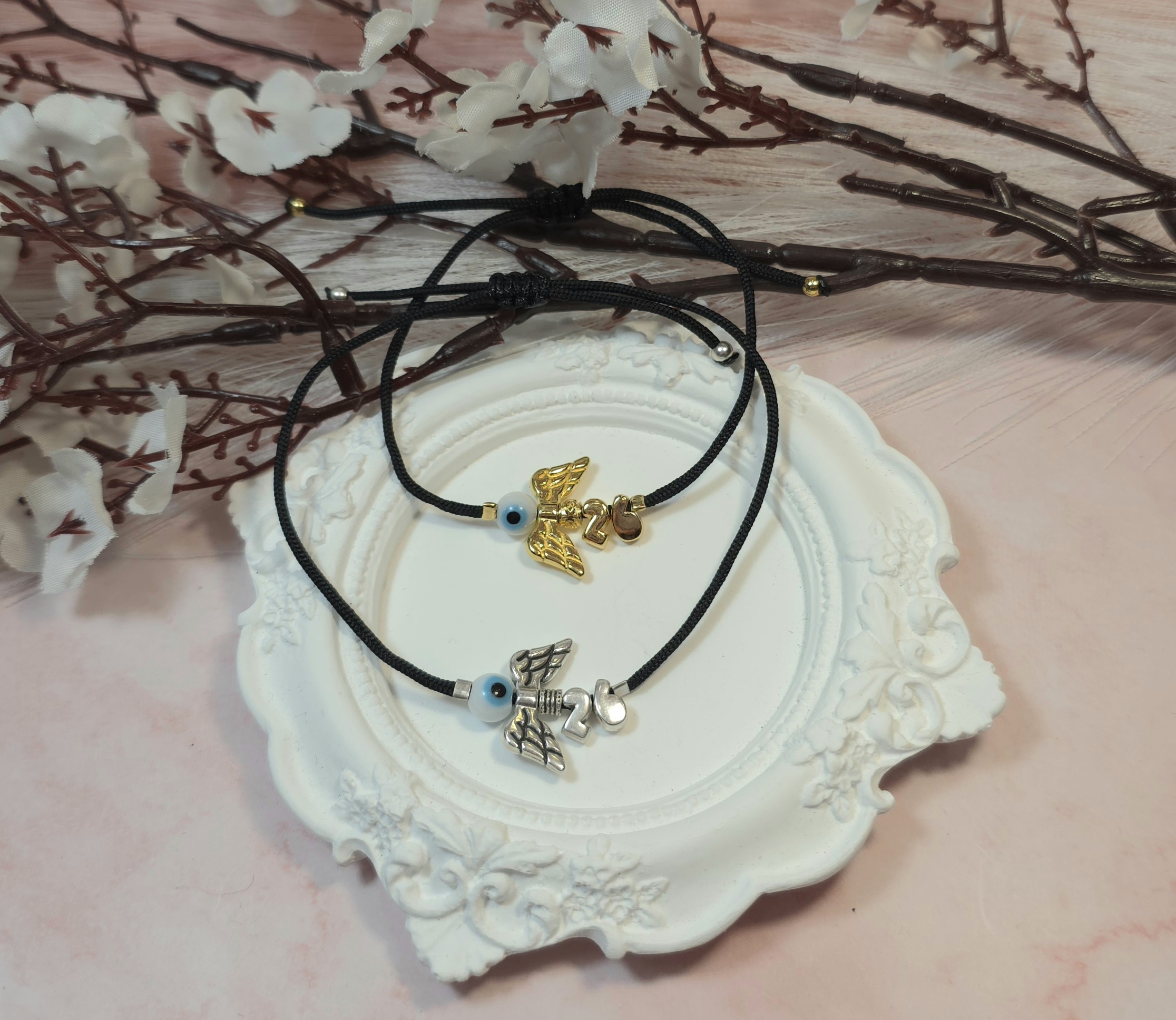 Χειροποίητο βραχιόλι γούρι, από επάργυρο ή επίχρυσο στοιχείο φτερά αγγέλου, ματάκι και το 26 πάνω. Είναι υποαλλεργικό. Έχει αυξομείωση.