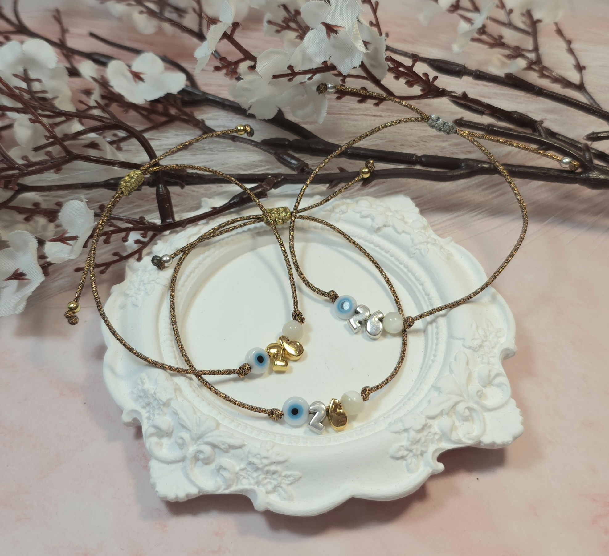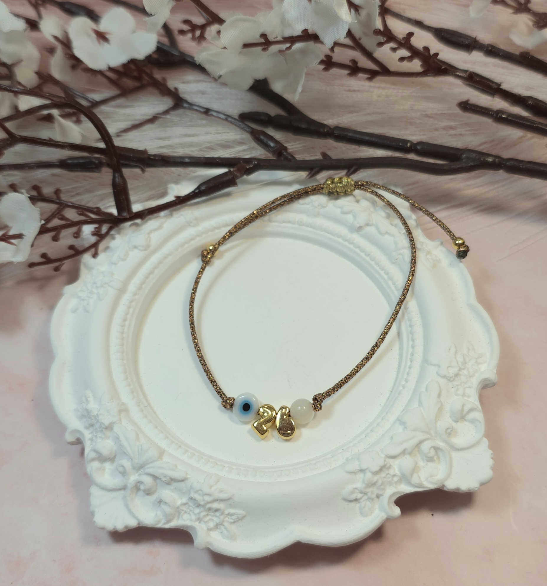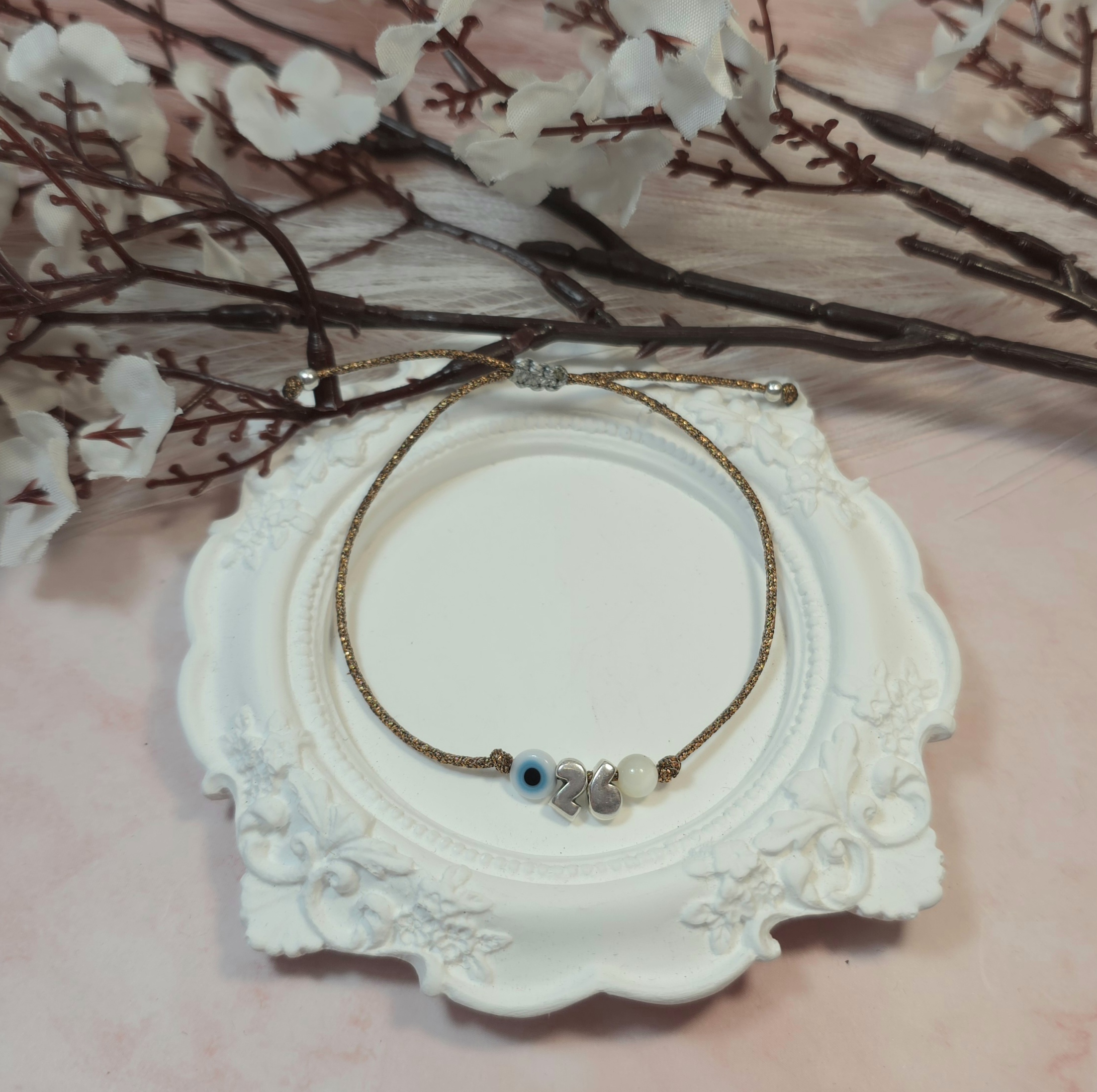 Χειροποίητο βραχιόλι γούρι, από καφέ κορδόνι με gliter και επάργυρα ή επίχρυσα στοιχεία 26 πάνω και ματάκι. Είναι υποαλλεργικό. Έχει αυξομείωση.