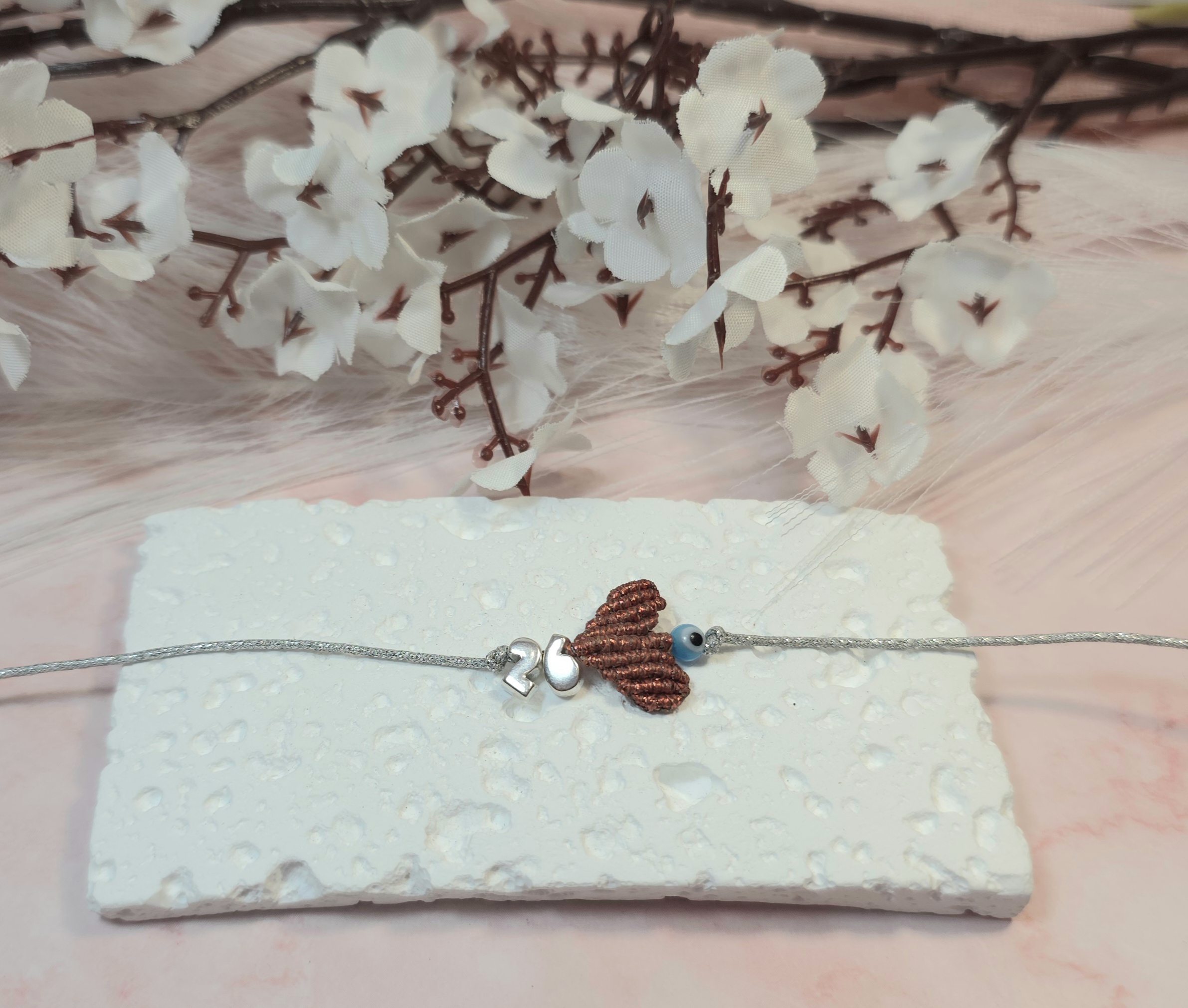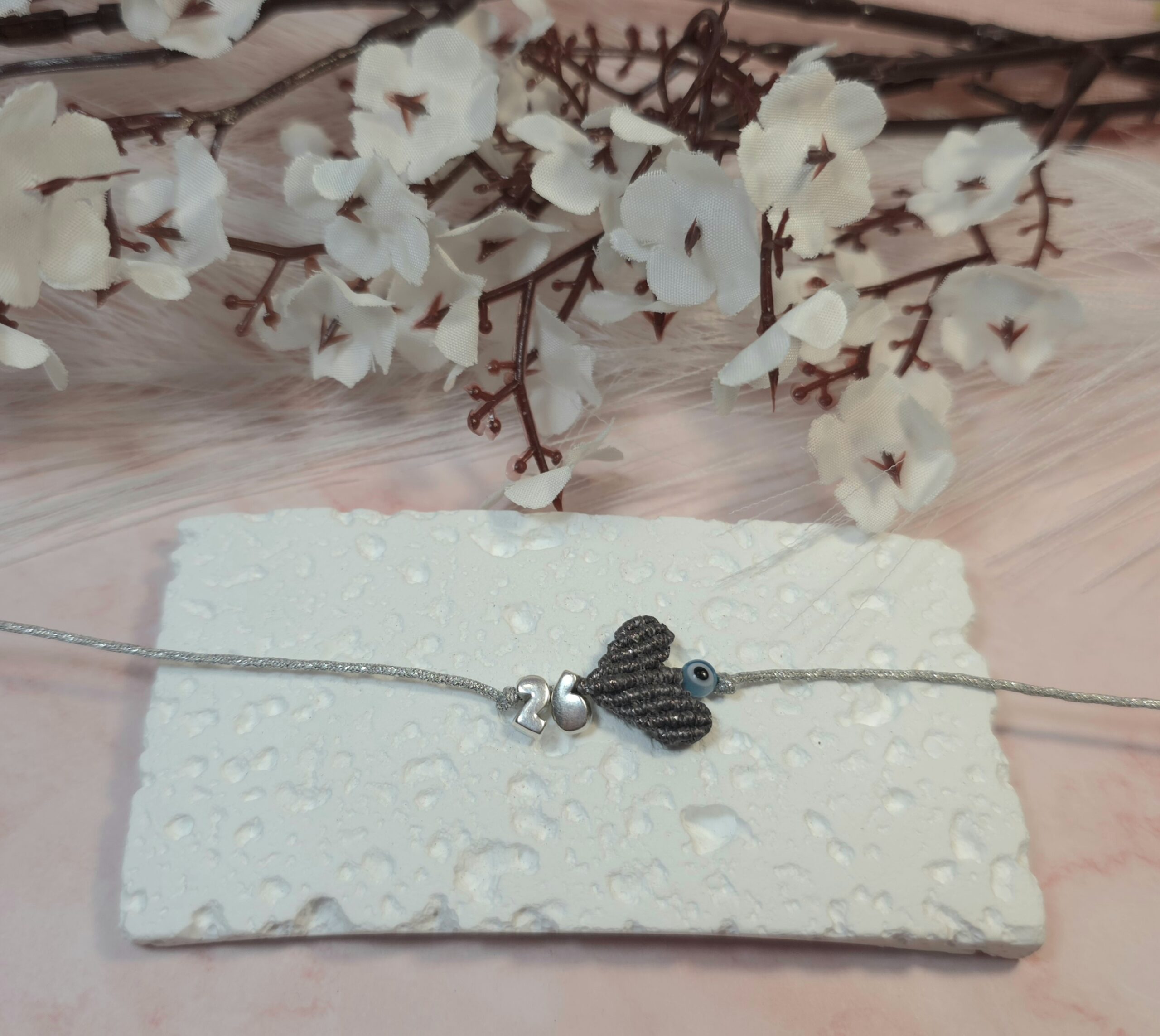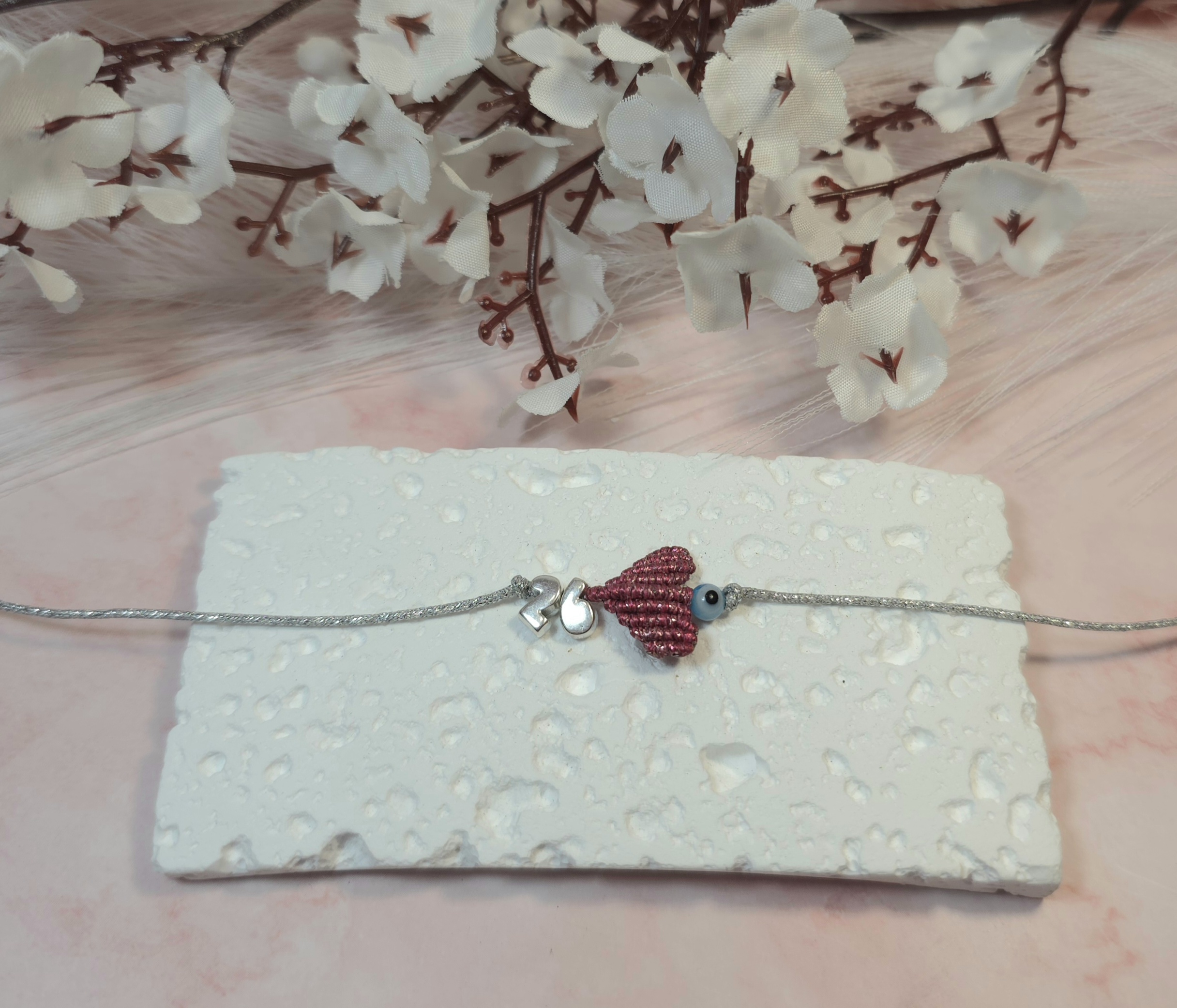 Χειροποίητο βραχιόλι γούρι, από ασημί κορδόνι με gliter, καρδιά με την τεχνική μακραμέ και επάργυρο το 26 πάνω και ματάκι. Είναι υποαλλεργικό. Έχει αυξομείωση.