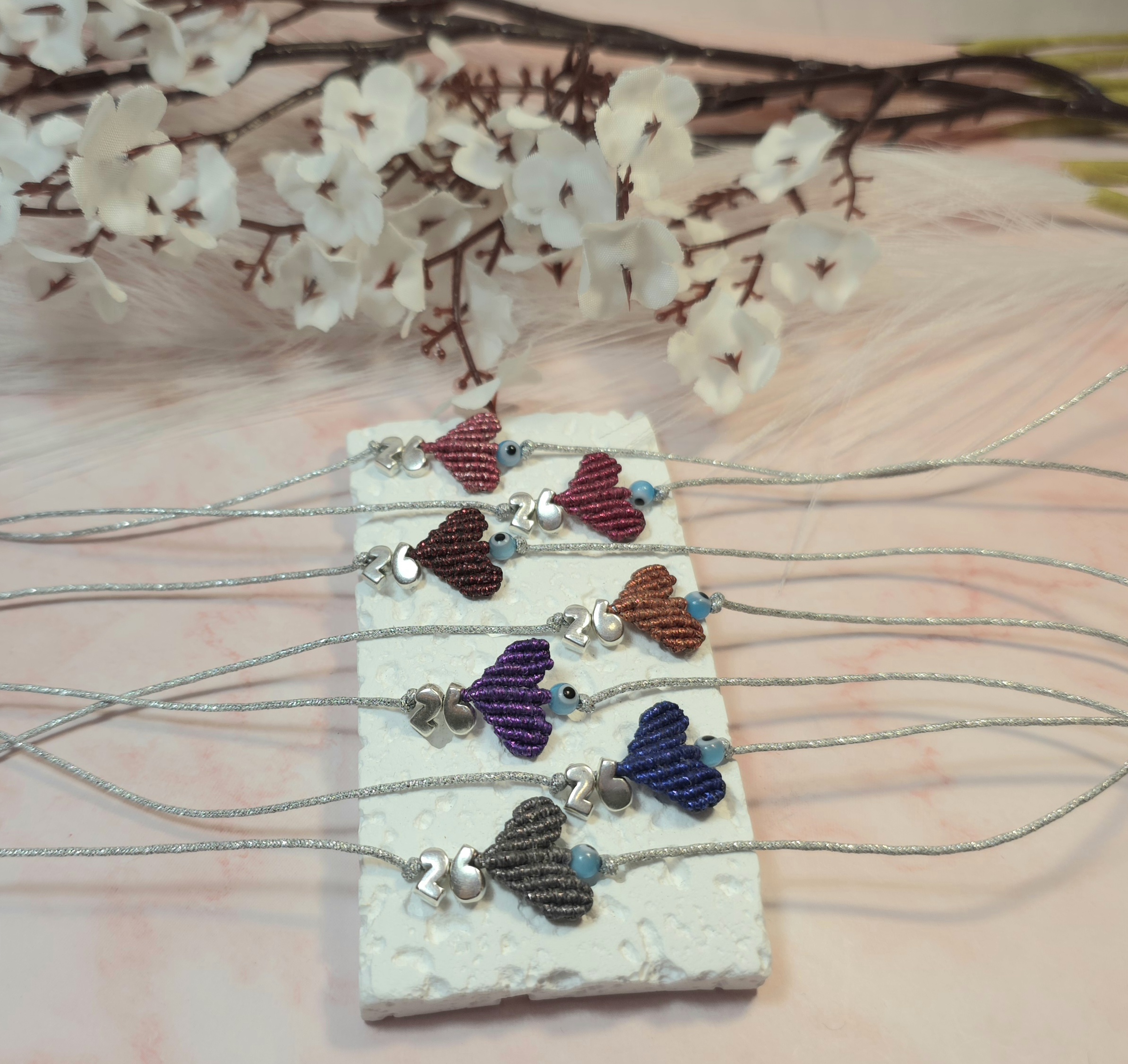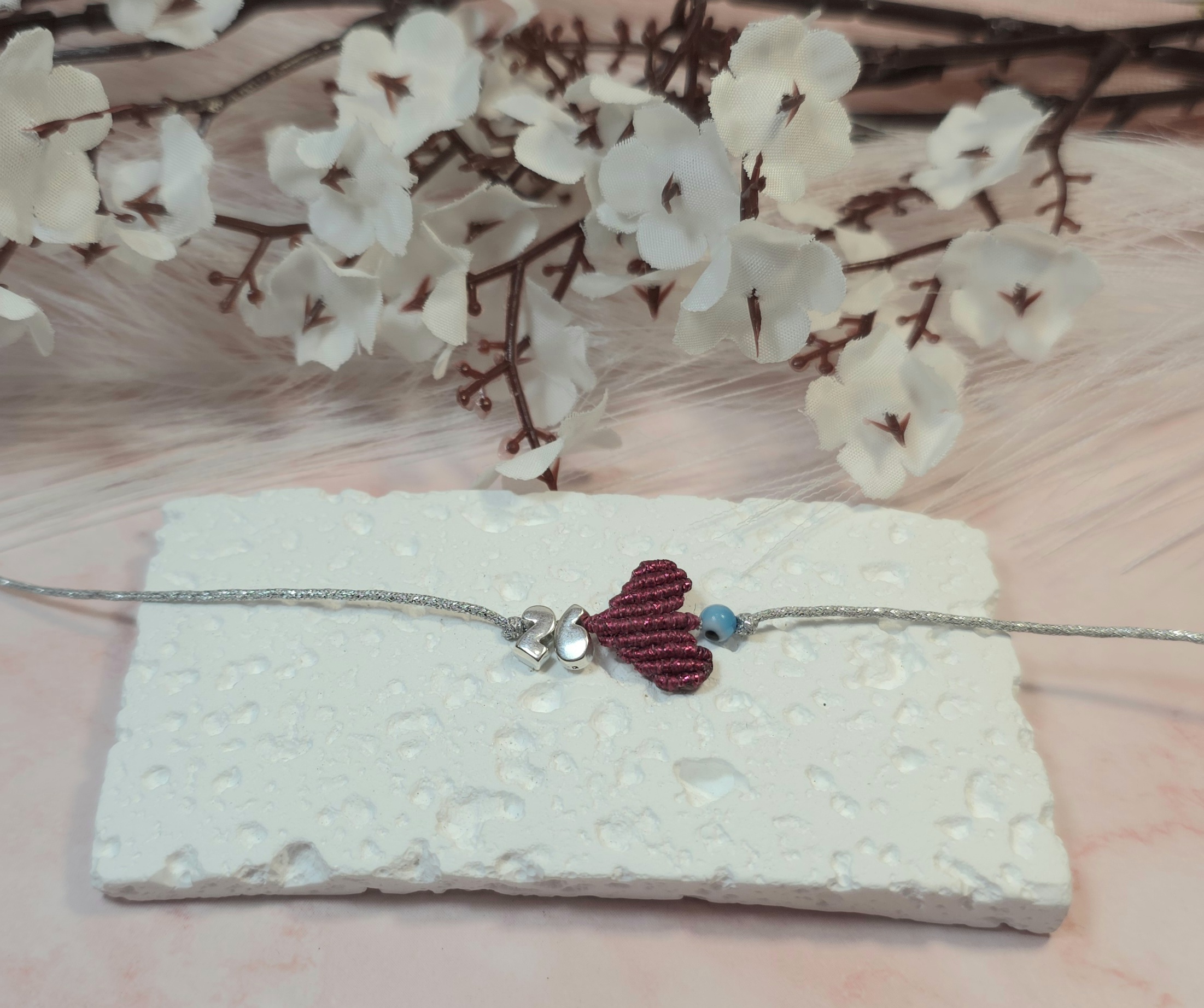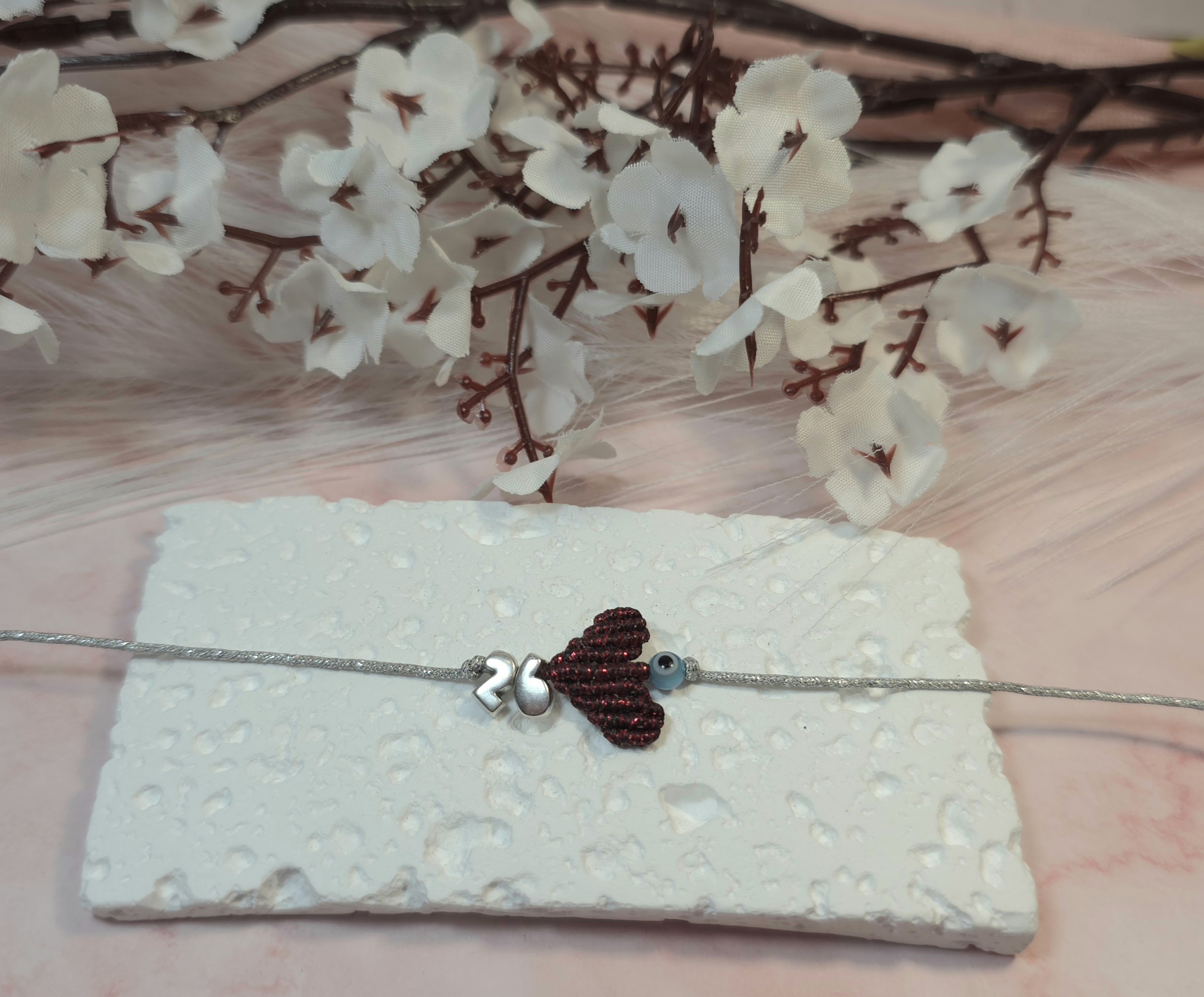 Χειροποίητο βραχιόλι γούρι, από ασημί κορδόνι με gliter, καρδιά με την τεχνική μακραμέ και επάργυρο το 26 πάνω και ματάκι. Είναι υποαλλεργικό. Έχει αυξομείωση.