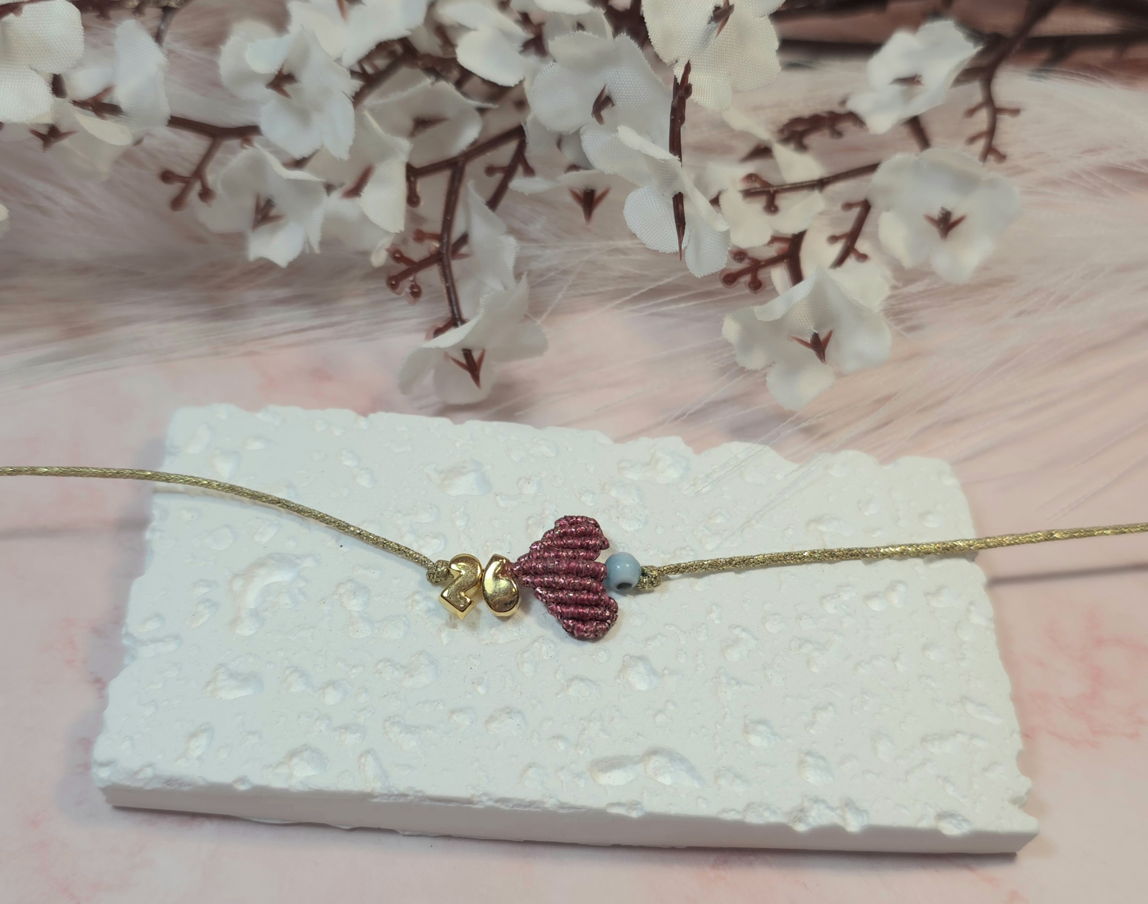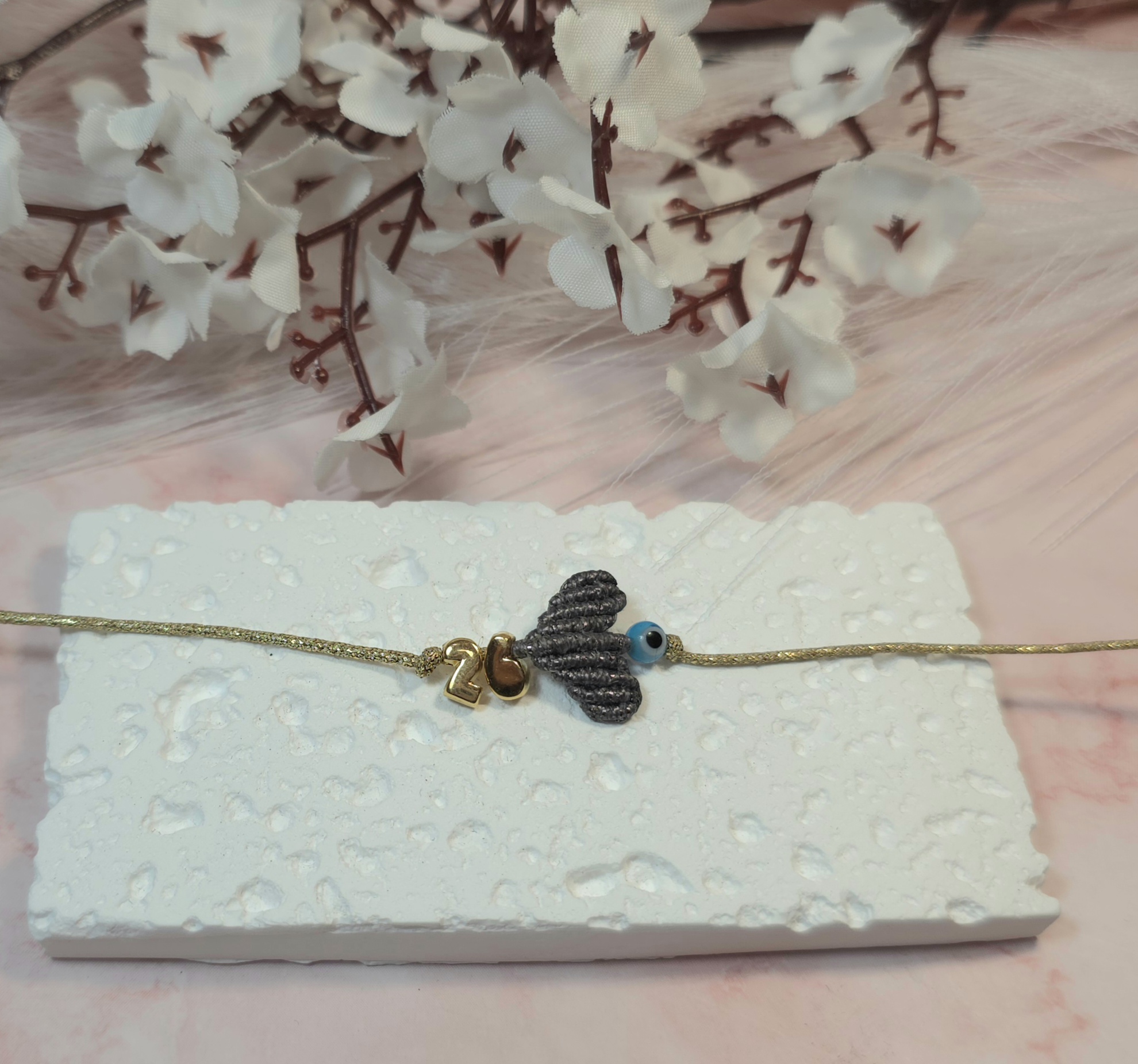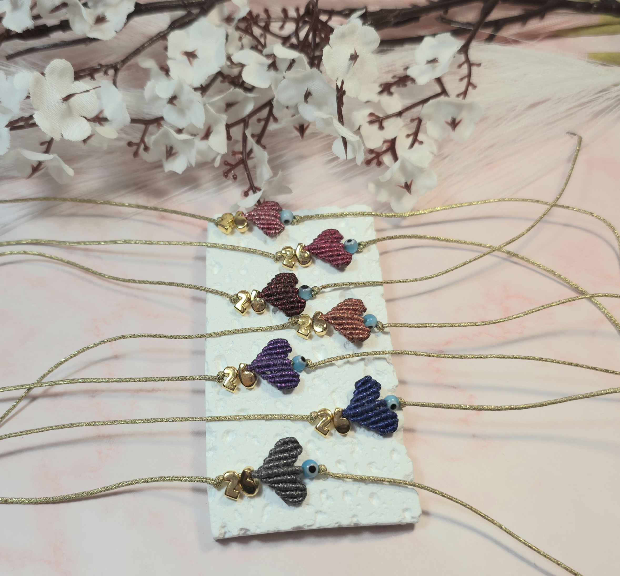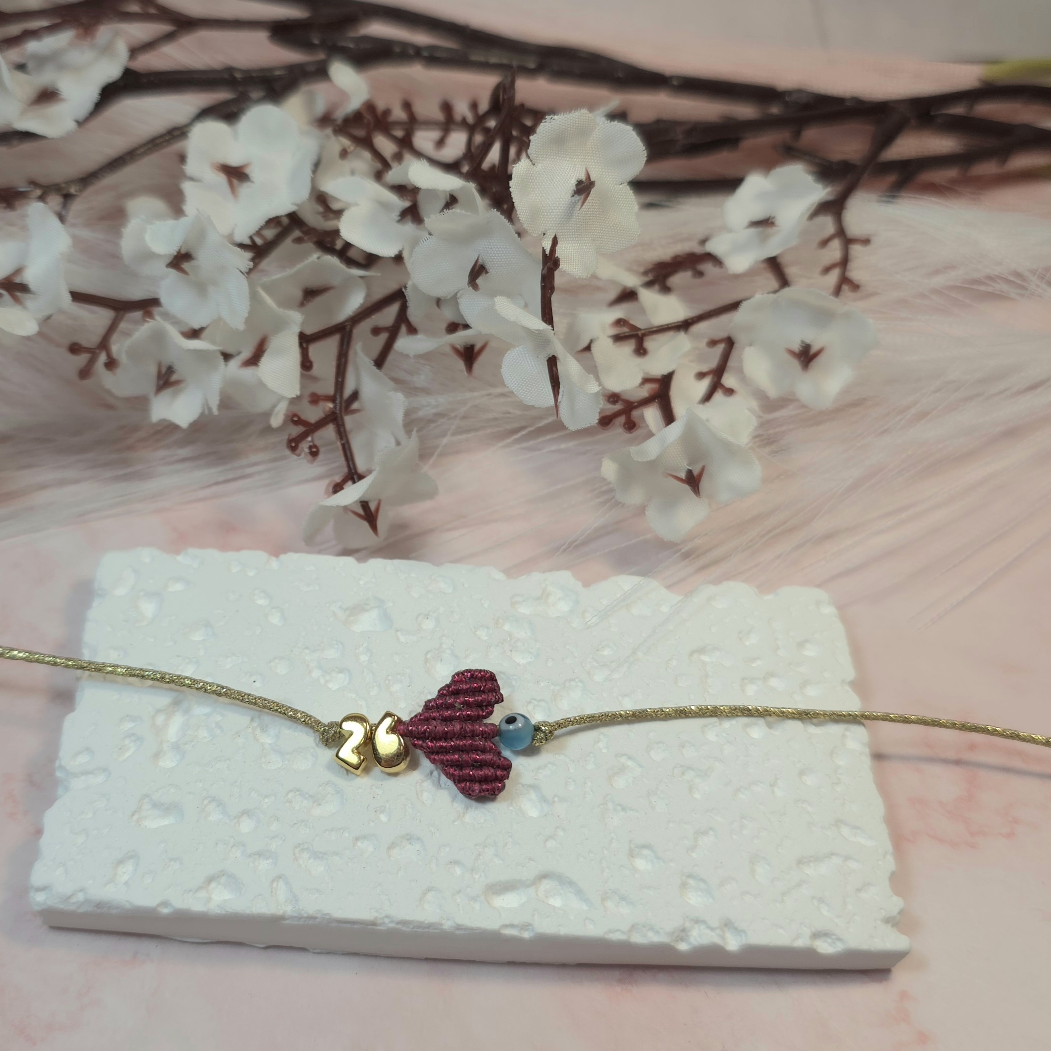 Χειροποίητο βραχιόλι γούρι, από ασημί κορδόνι με gliter, καρδιά με την τεχνική μακραμέ και επίχρυσο το 26 πάνω και ματάκι. Είναι υποαλλεργικό. Έχει αυξομείωση.