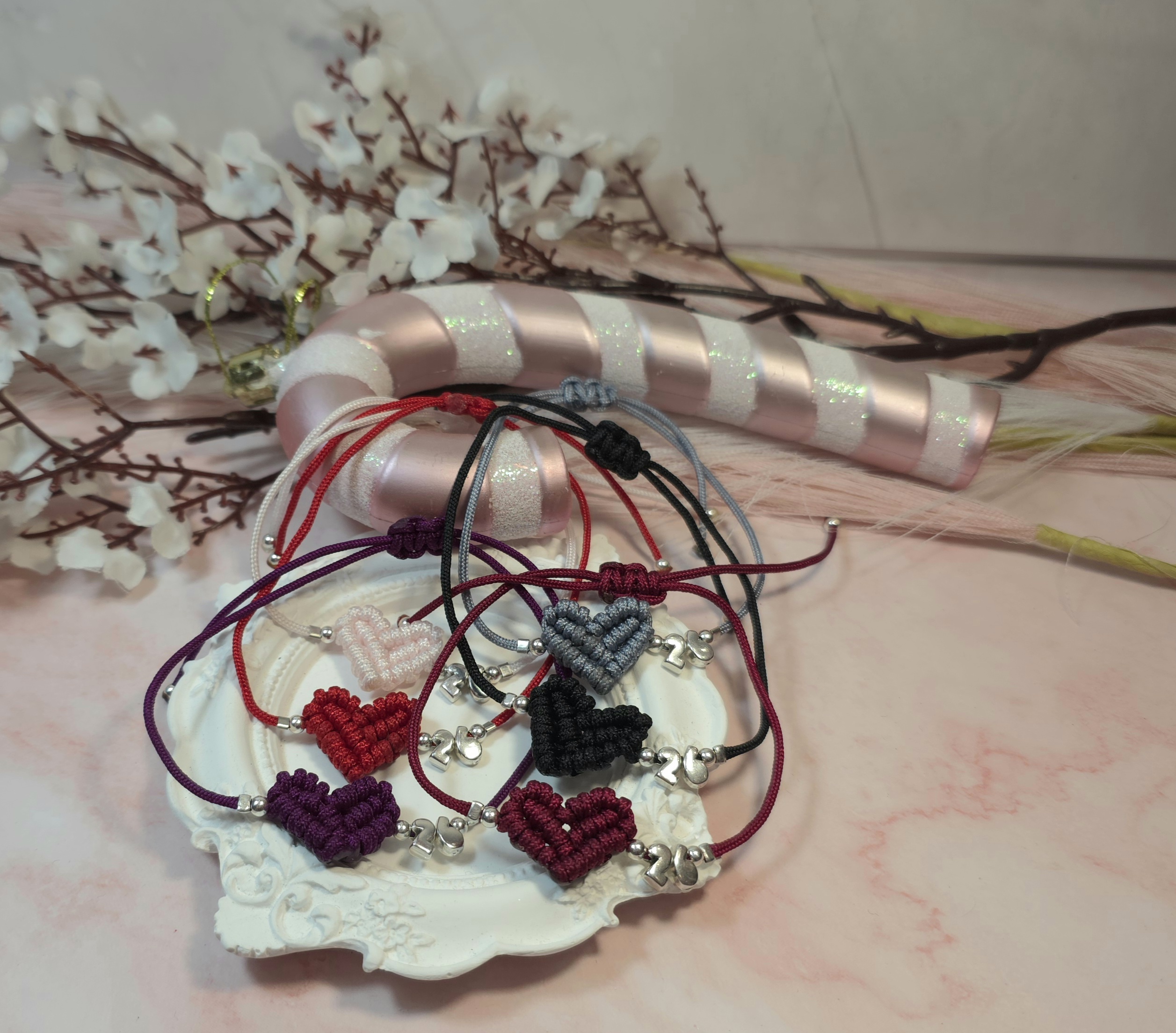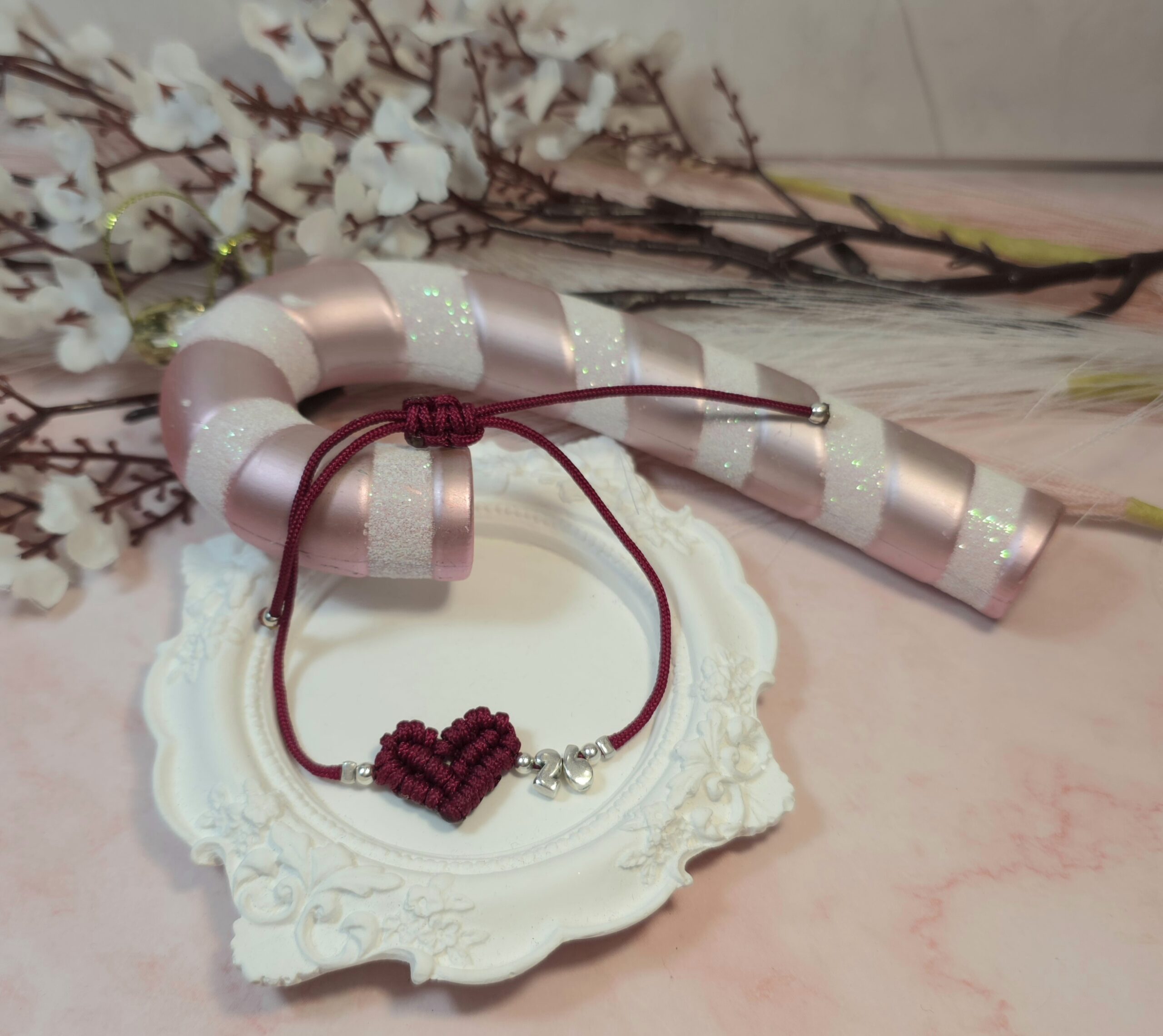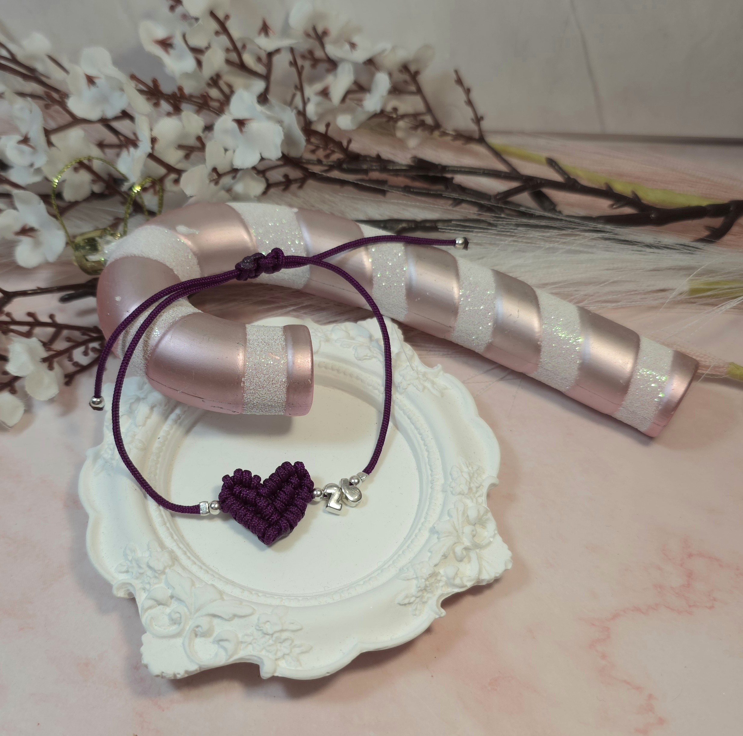 Χειροποίητο βραχιόλι γούρι με καρδιά με την τεχνική μακραμέ και επάργυρο το 26. Είναι υποαλλεργικό. Έχει αυξομείωση.