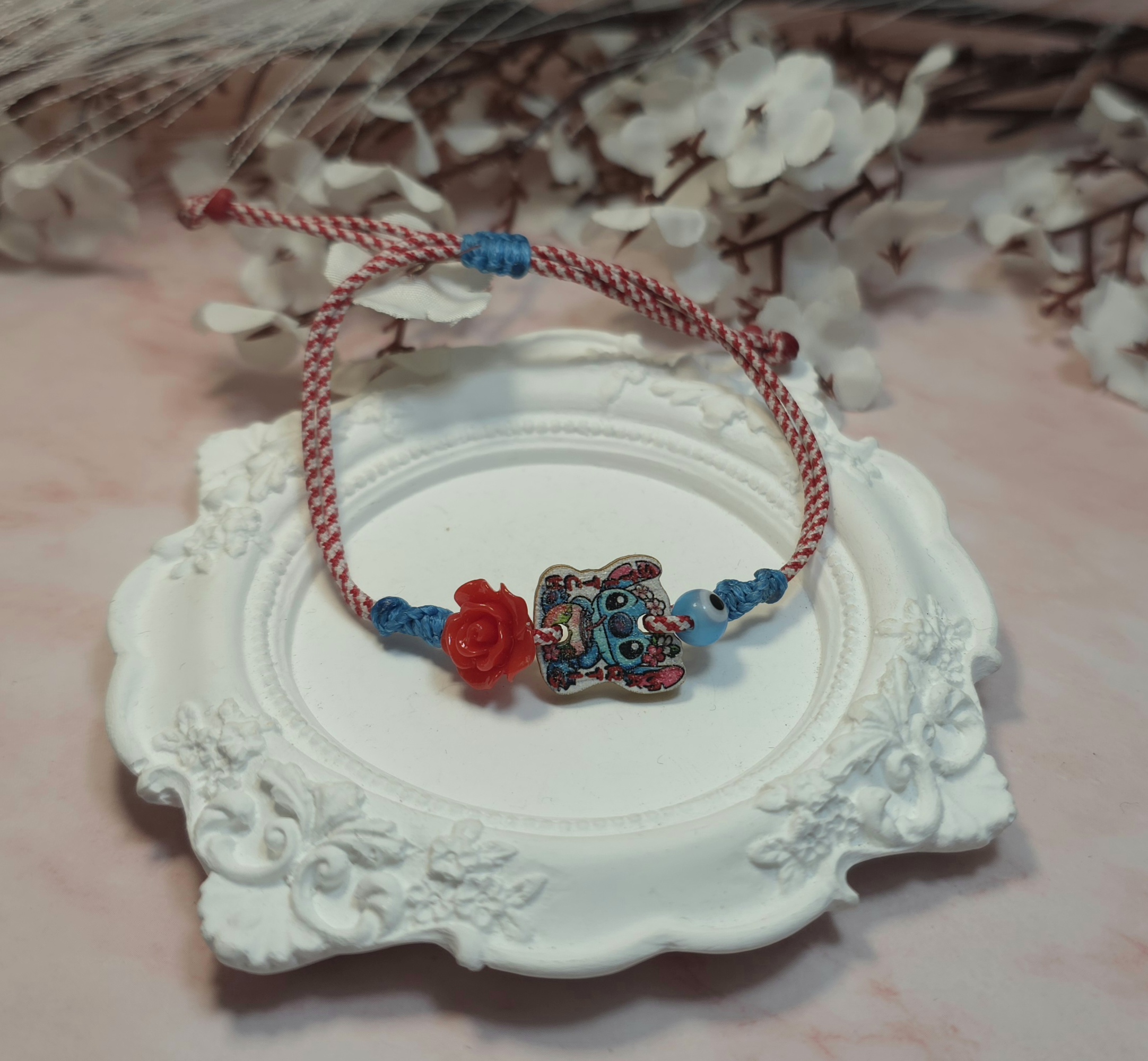 Χειροποίητο μαρτάκι με ξύλινο στοιχείο Stich, λουλουδάκι και ματάκι. Έχει αυξομείωση. Είναι υποαλλεργικό.