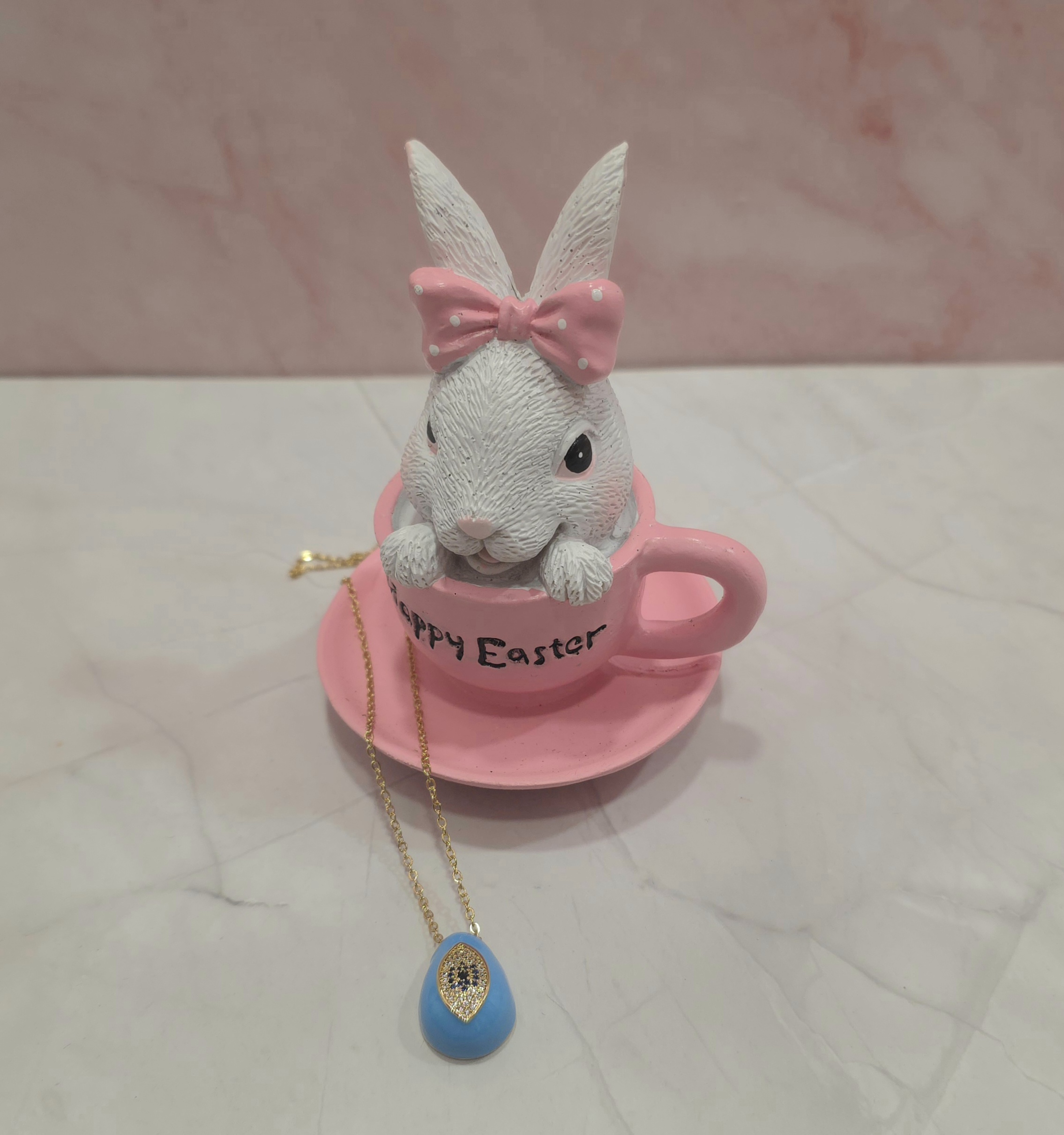 Χειροποίητο κολιέ από ατσάλινη αλυσίδα και μεταλλικό στοιχείο αυγό, σε τυρκουάζ με χρυσό χρώμα με μάτι. Έχει αυξομείωση. Είναι υποαλλεργικό.