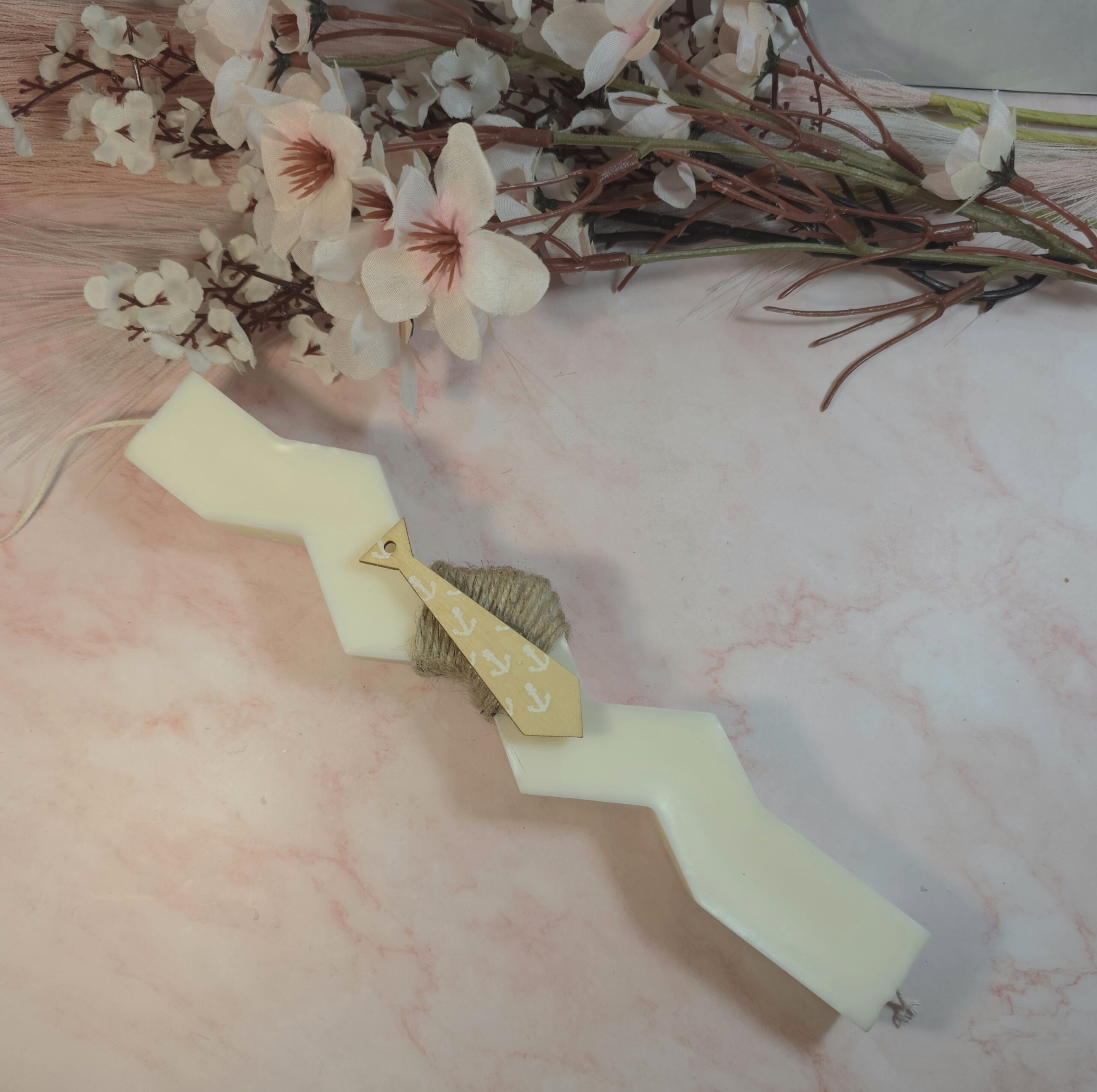 Φυτική χειροποίητη αρωματική λαμπάδα, από κερί σόγιας και άρωμα χωρίς χημικά, σε σχήμα καμπυλωτό και ξύλινη γραβάτα.