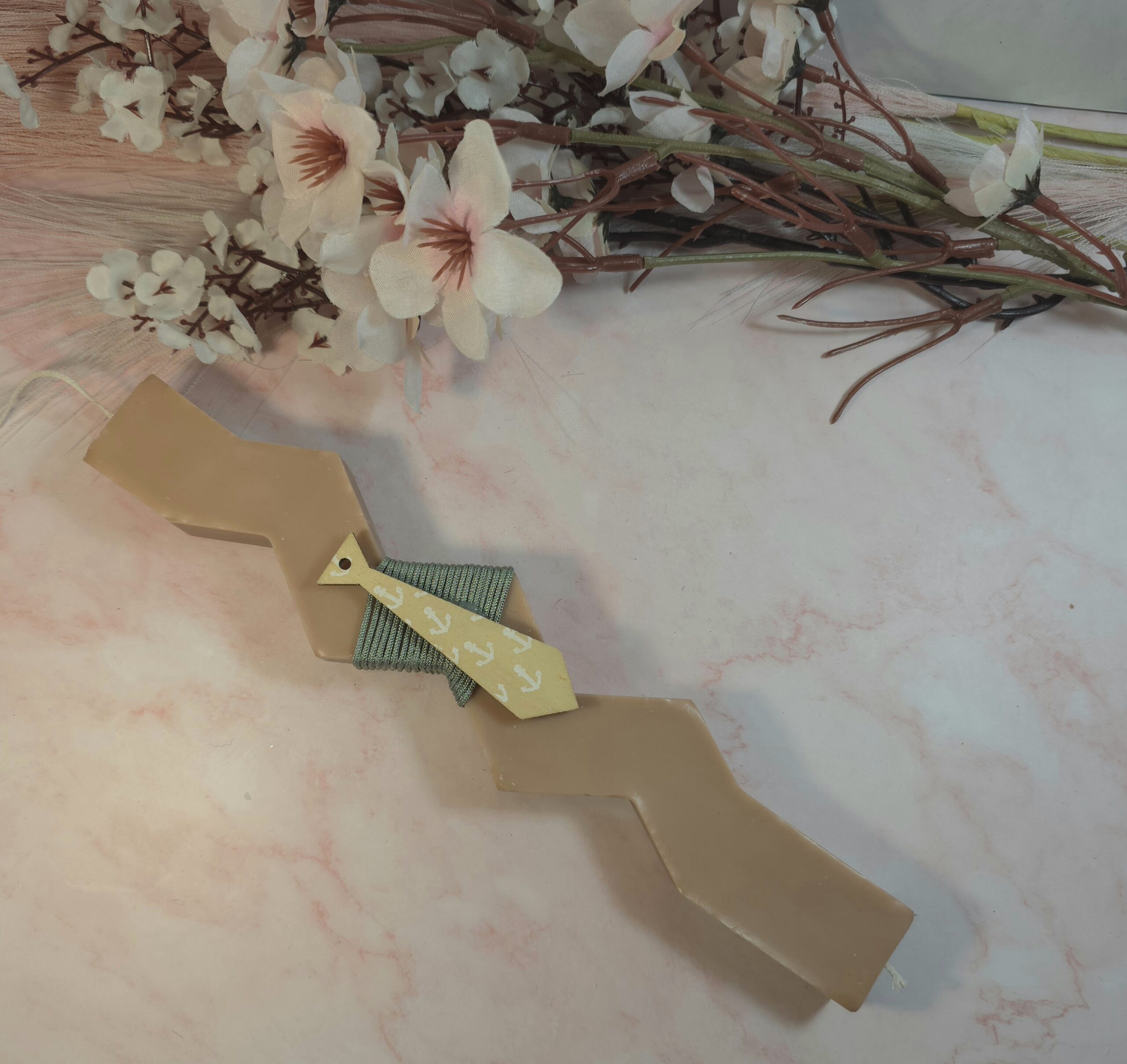 Φυτική χειροποίητη αρωματική λαμπάδα, από κερί σόγιας και άρωμα χωρίς χημικά, σε σχήμα καμπυλωτό και ξύλινη γραβάτα.