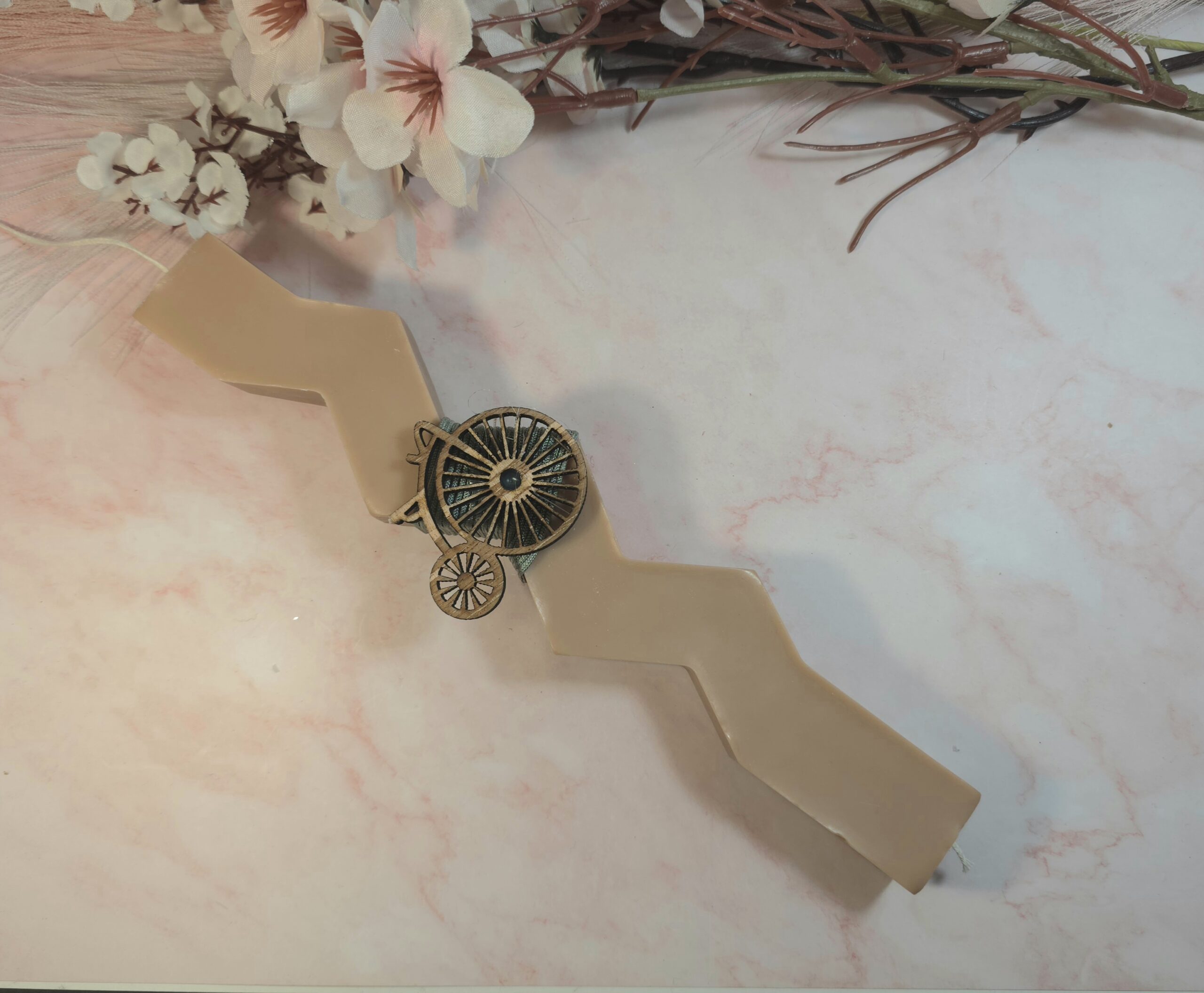 Φυτική χειροποίητη αρωματική λαμπάδα, από κερί σόγιας και άρωμα χωρίς χημικά, σε σχήμα καμπυλωτό και ξύλινο ποδήλατο.