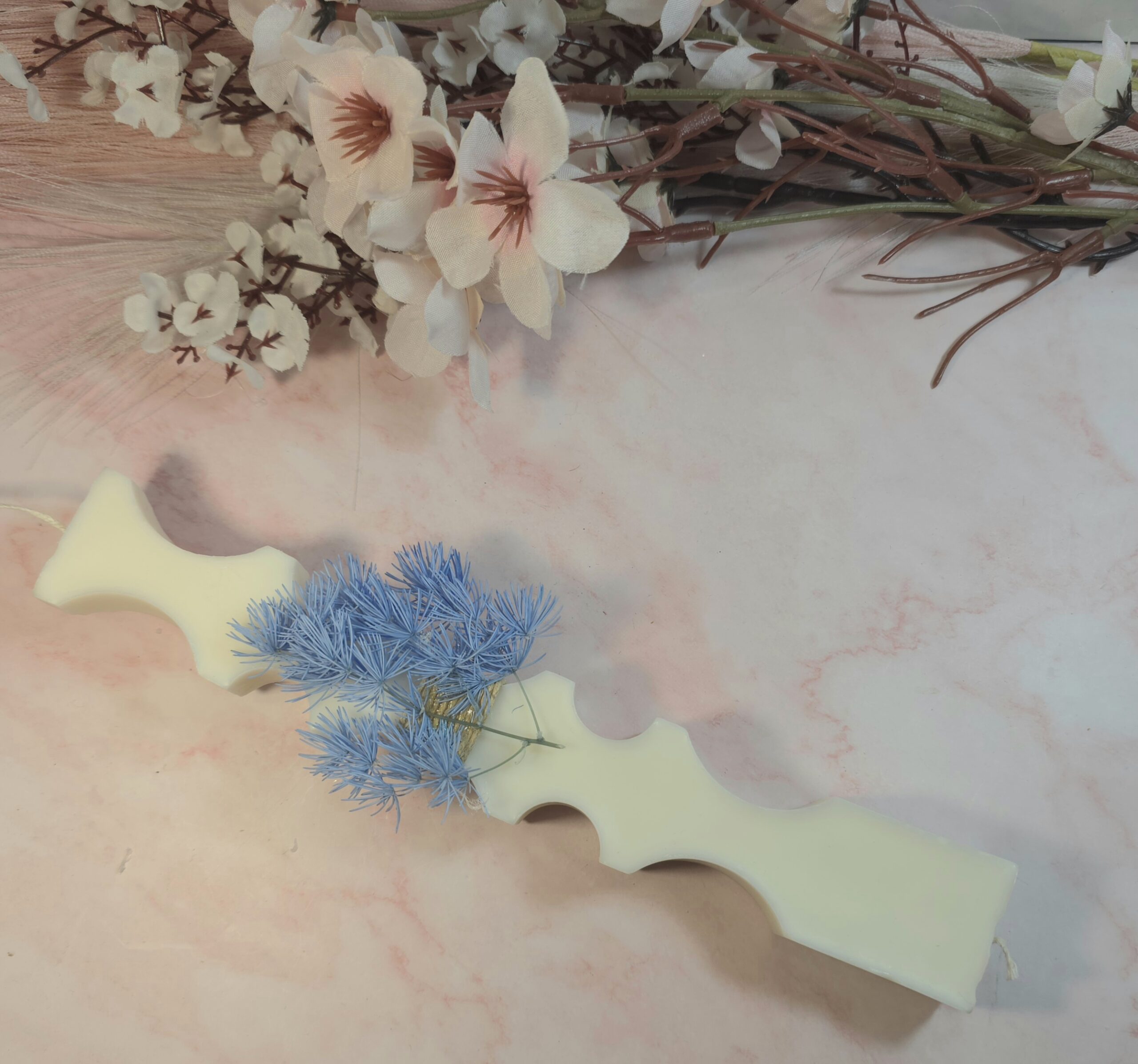 Φυτική χειροποίητη αρωματική λαμπάδα, από κερί σόγιας και άρωμα χωρίς χημικά, σχήμα καμπυλωτό και λουλούδια.