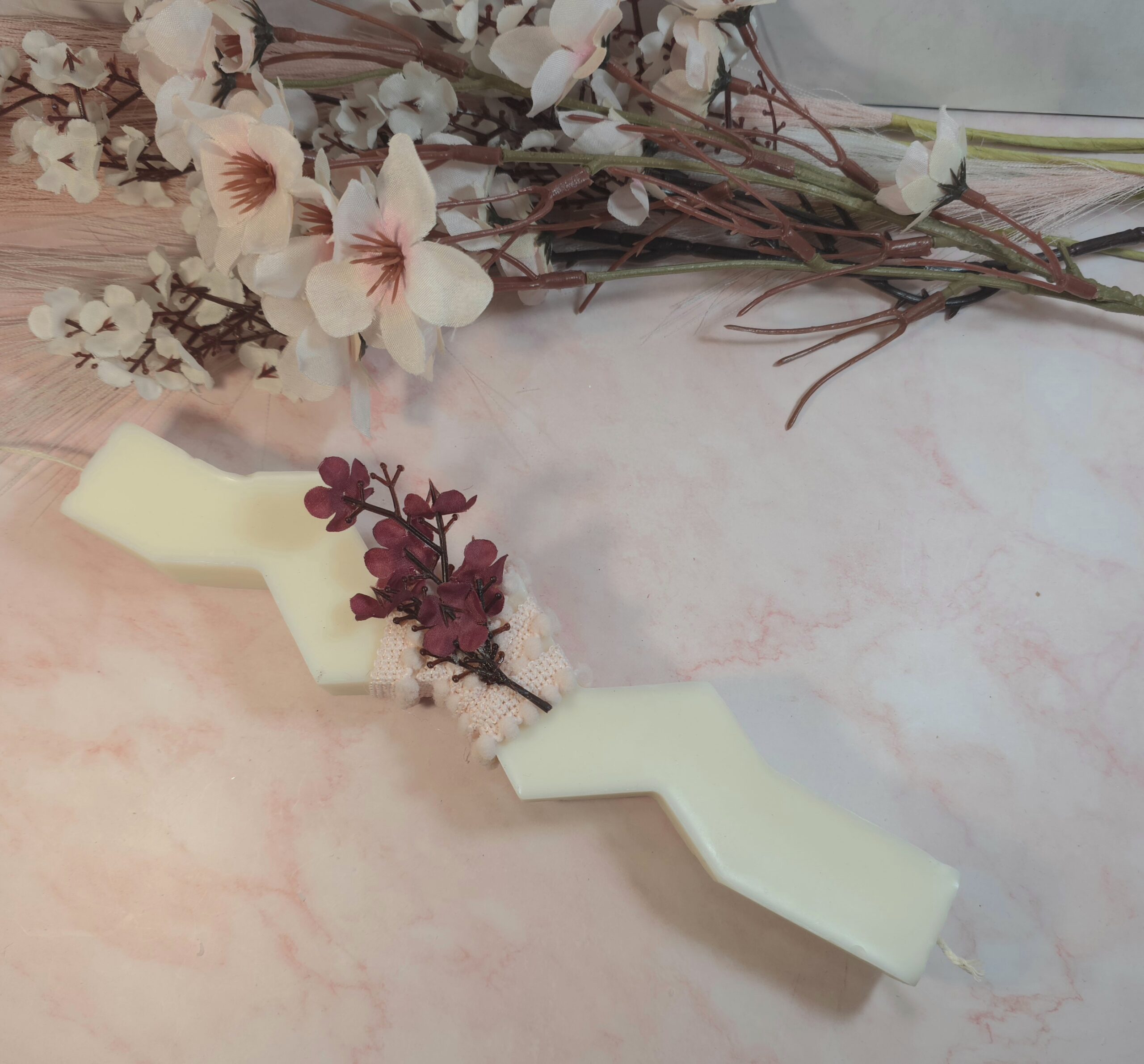 Φυτική χειροποίητη αρωματική λαμπάδα, από κερί σόγιας και άρωμα χωρίς χημικά, σε σχήμα ζικ ζακ και λουλούδια.