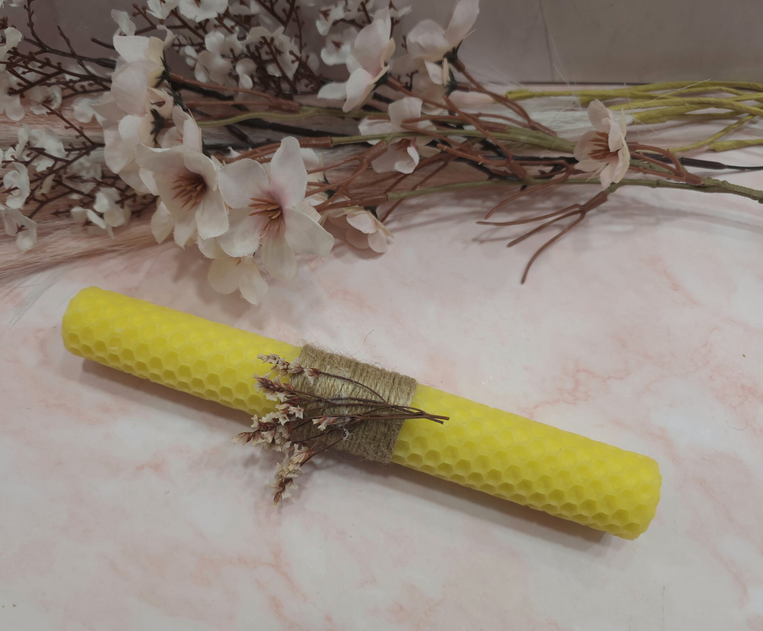 Χειροποίητη λαμπάδα από κηρήθρα μελισσών 20cm, με λουλούδια.