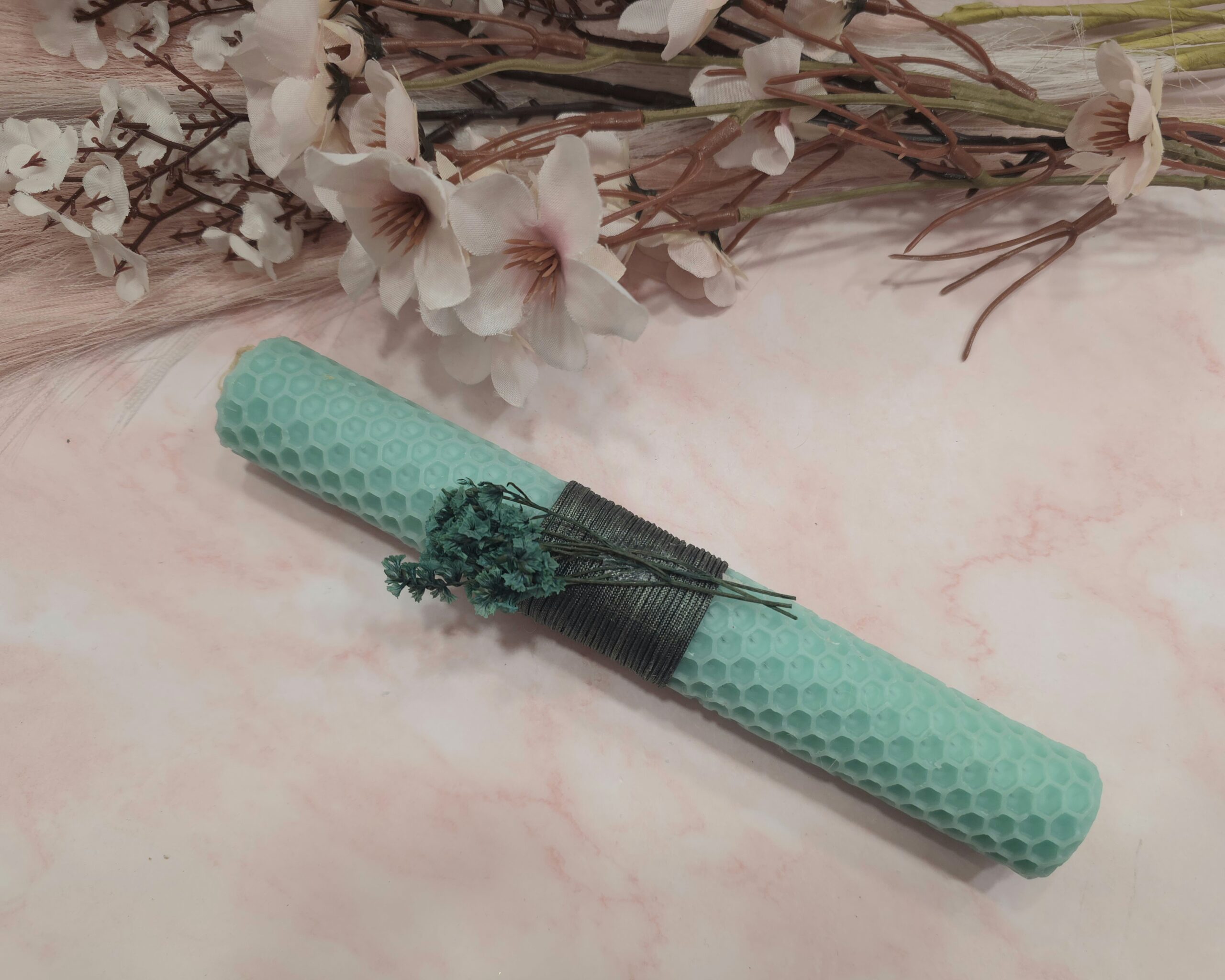 Χειροποίητη λαμπάδα από κηρήθρα μελισσών 20cm, με λουλούδια.