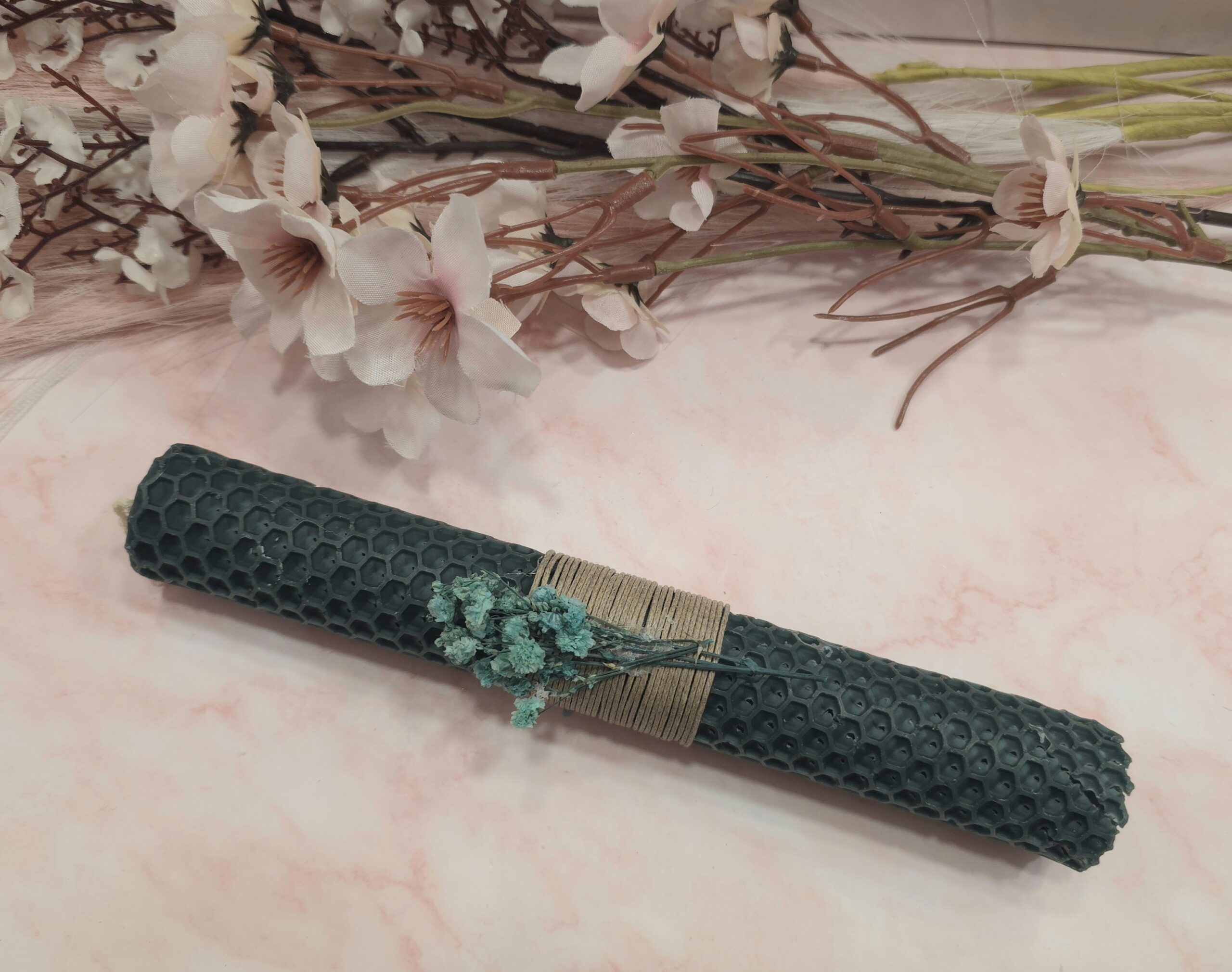 Χειροποίητη λαμπάδα από κηρήθρα μελισσών 20cm, με λουλούδια.