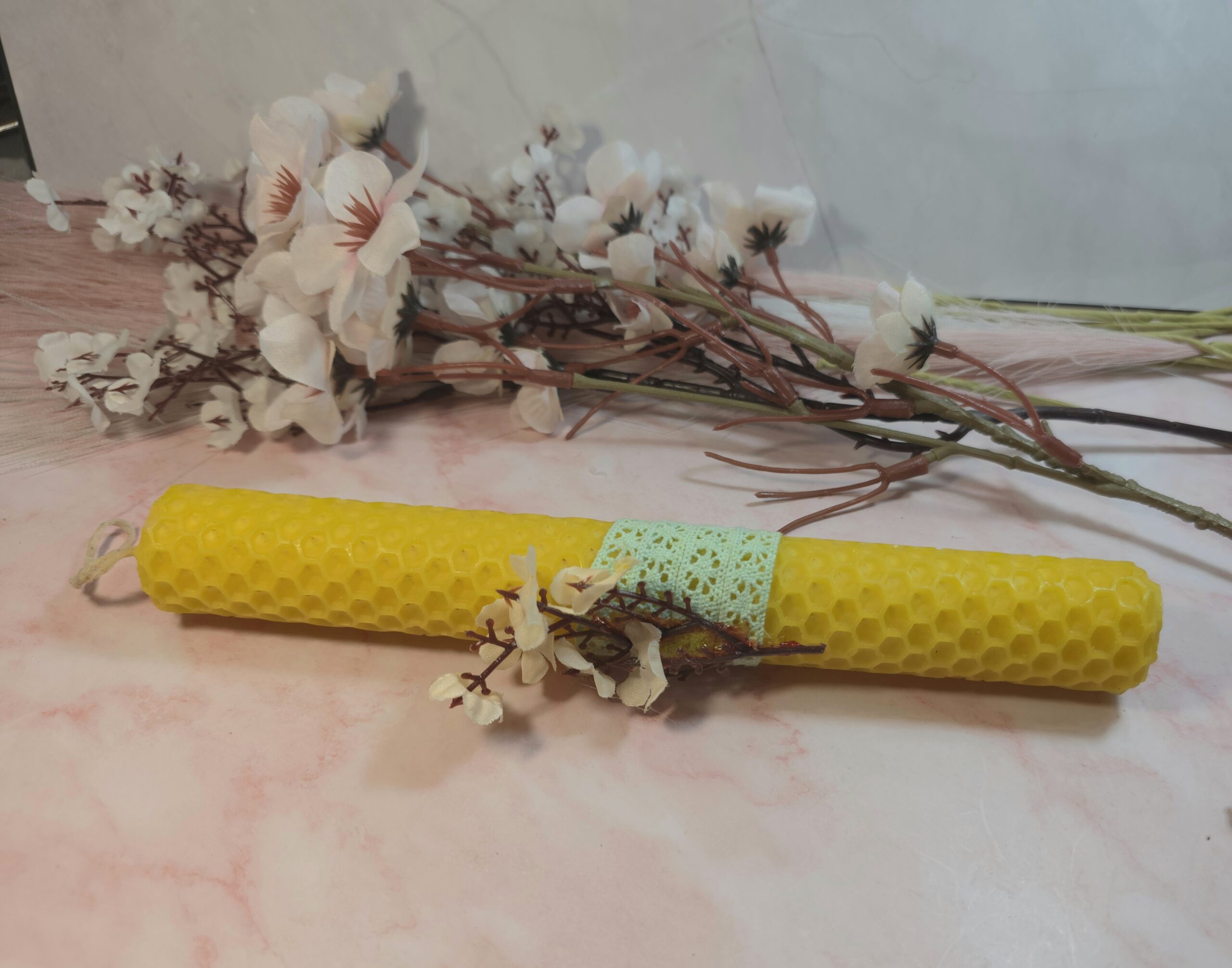 Χειροποίητη λαμπάδα από κηρήθρα μελισσών 20cm, με λουλούδια.