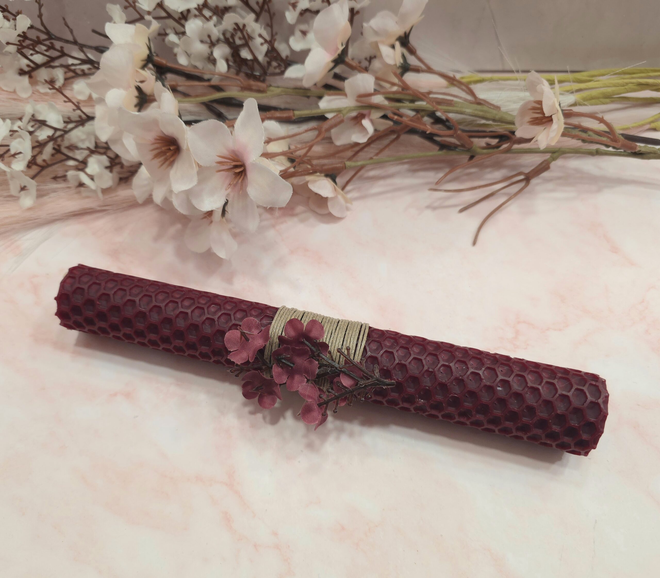 Χειροποίητη λαμπάδα από κηρήθρα μελισσών 20cm, με λουλούδια.