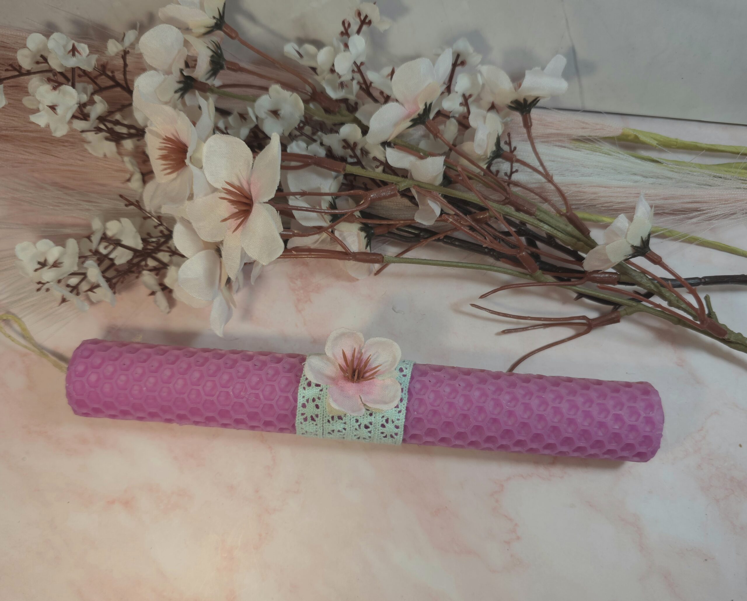 Χειροποίητη λαμπάδα από κηρήθρα μελισσών 20cm, με λουλούδια.