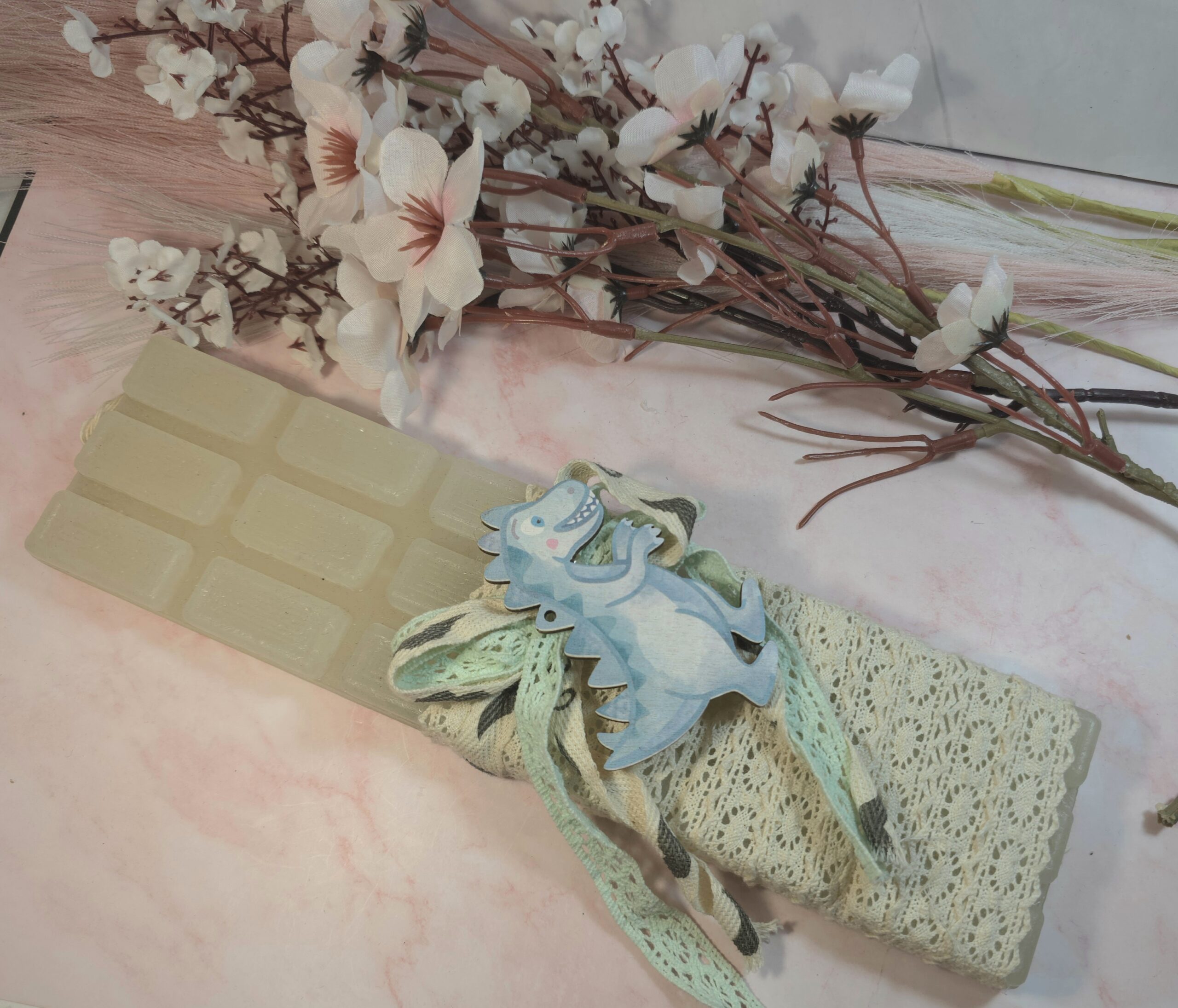 Χειροποίητη λαμπάδα σε σχήμα σοκολάτας με ξύλινο δεινόσαυρο.
