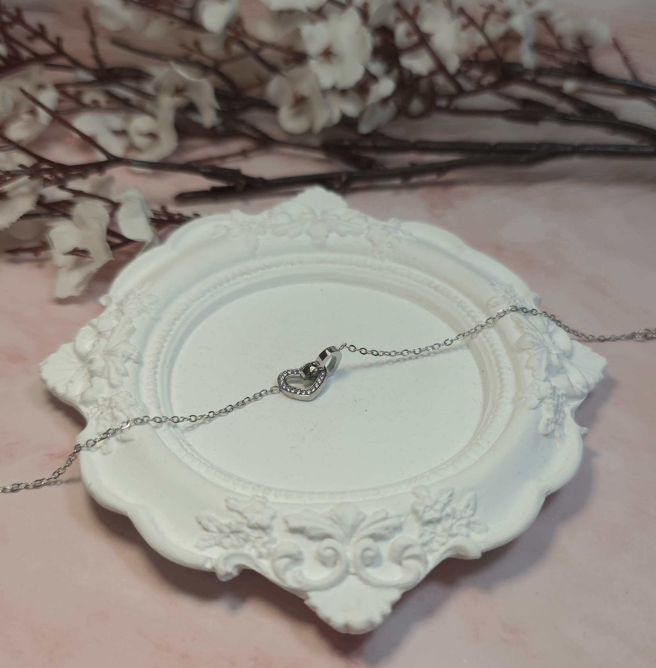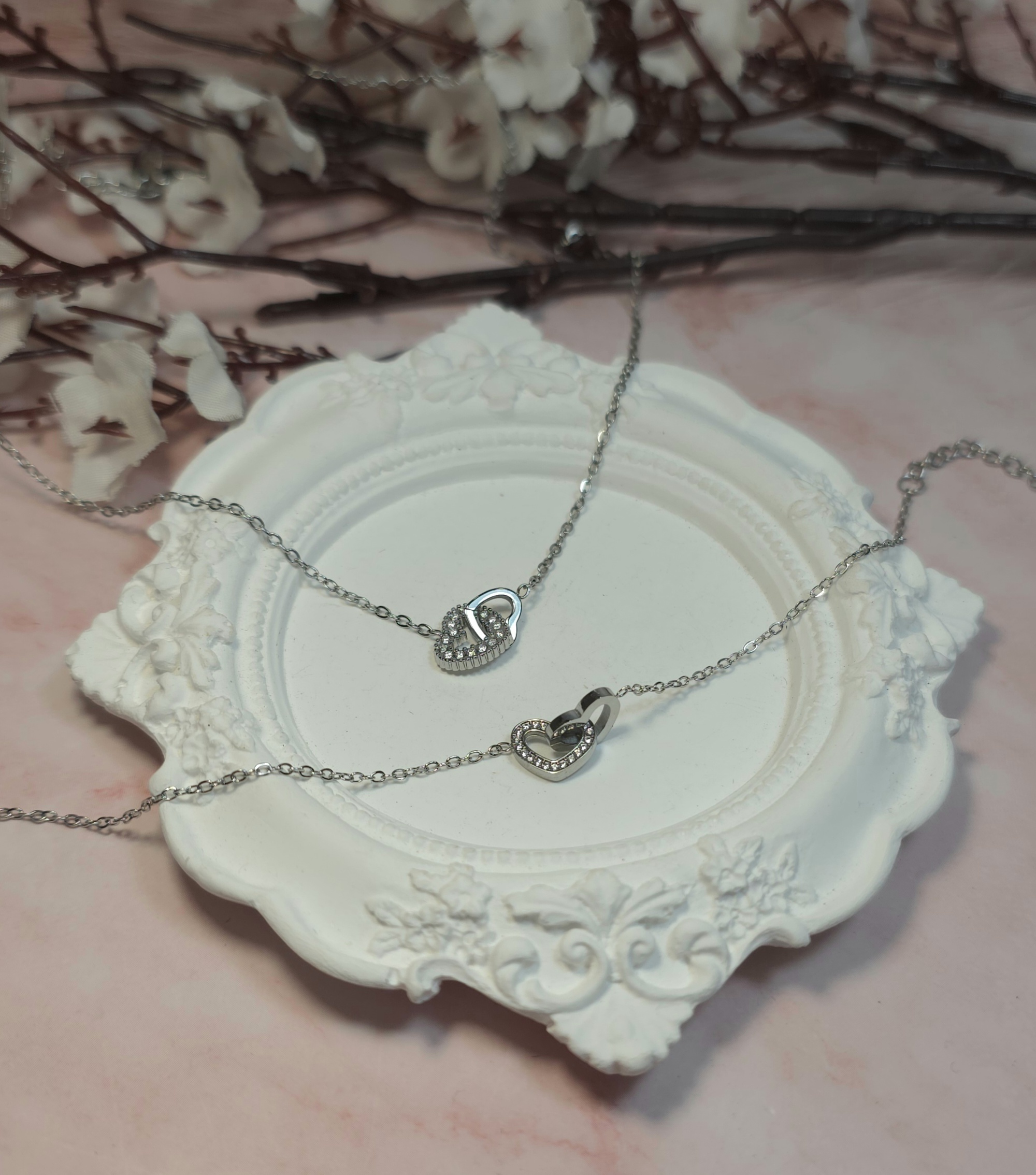 Ατσάλινο σετ σε ασημί χρώμα, αποτελούμενο από κολιέ και βραχιόλι. Έχουν αυξομείωση. Είναι υποαλλεργικά.