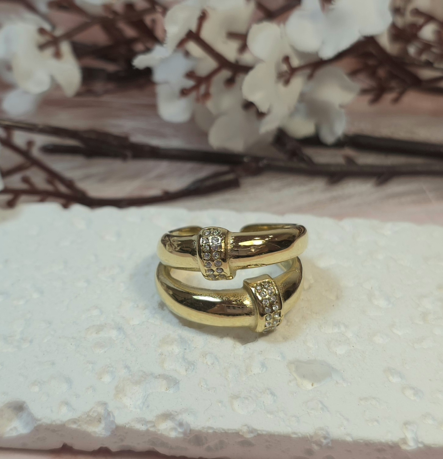 Ατσάλινο δαχτυλίδι σαν δύο βέρες. Είναι υποαλλεργικό. Ανοιγοκλείνει. Υπάρχει σε χρυσό χρώμα.