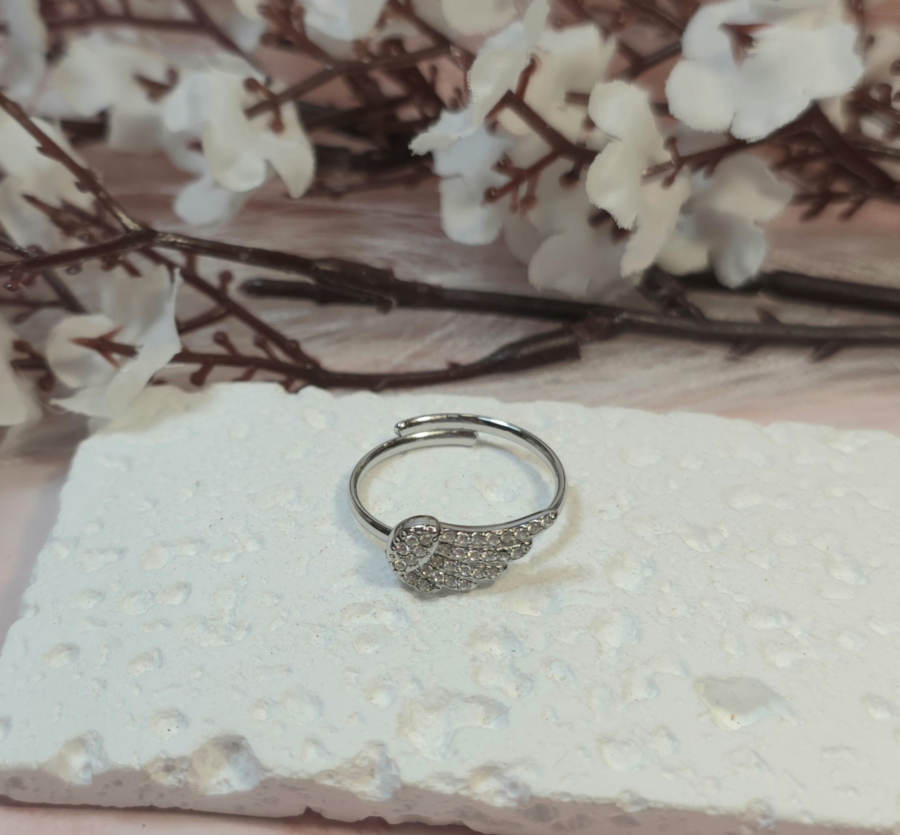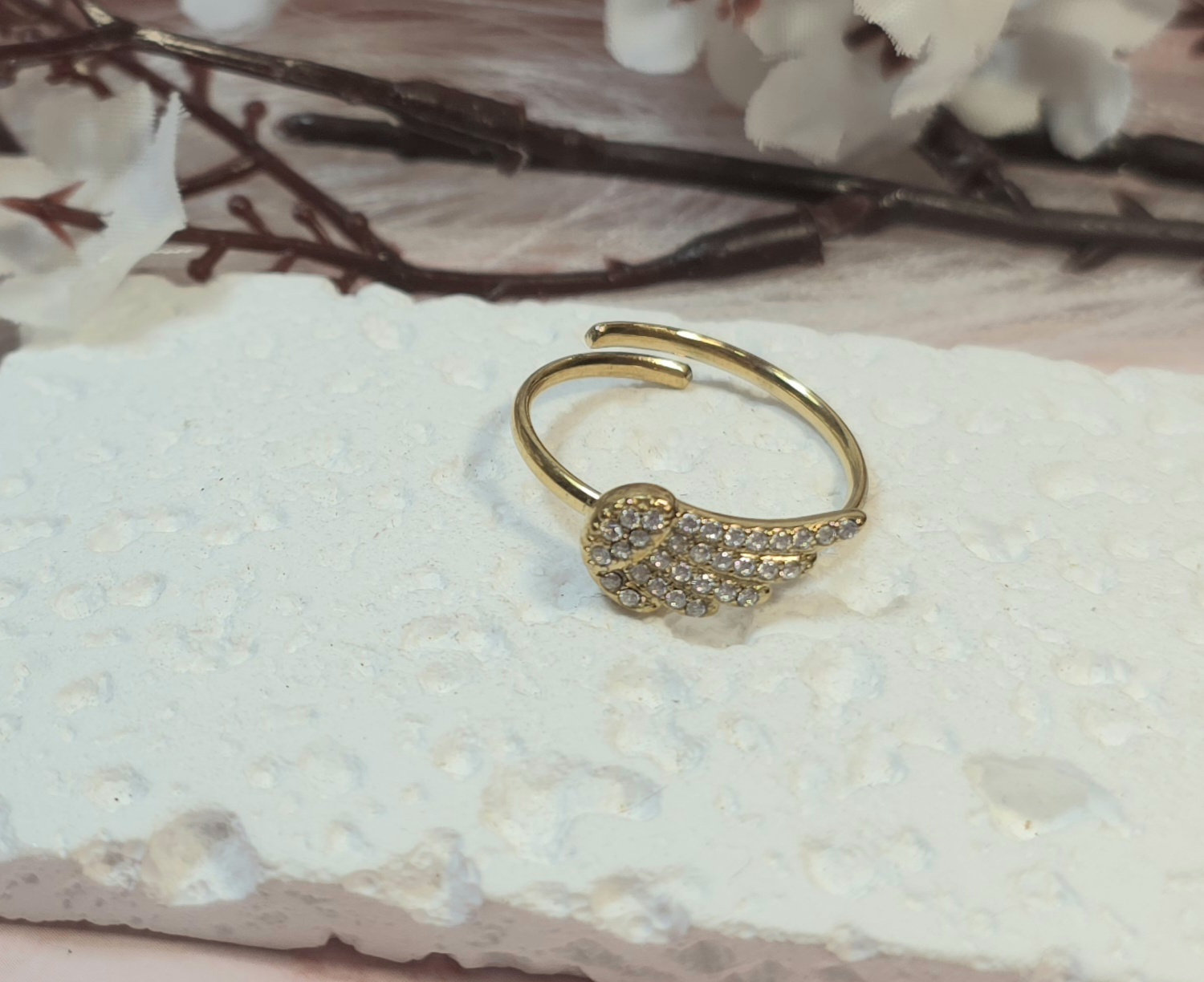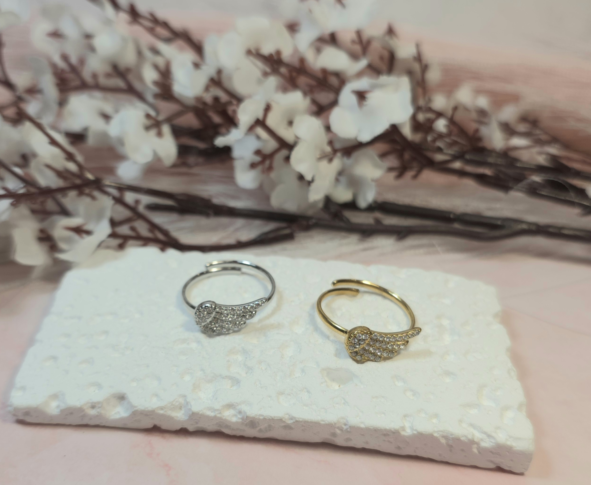 Ατσάλινο δαχτυλίδι σε σχήμα φτερό αγγέλου με στρας. Είναι υποαλλεργικό. Ανοιγοκλείνει. Υπάρχει σε ασημί και χρυσό χρώμα.