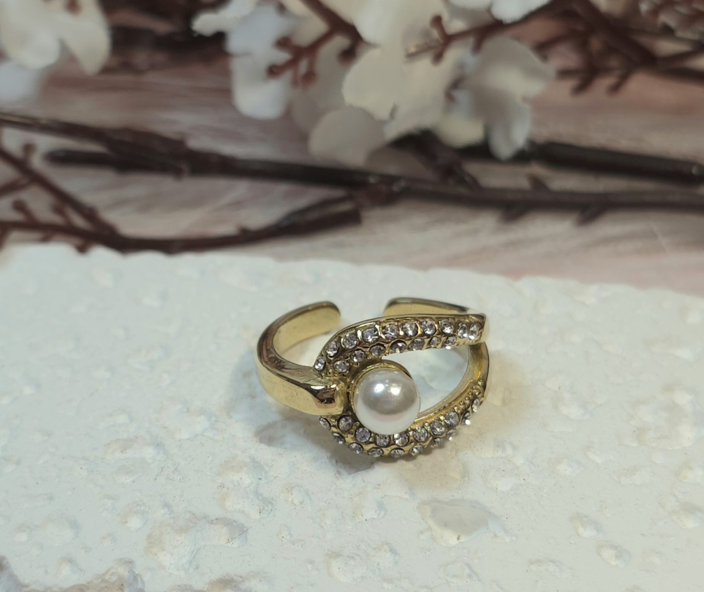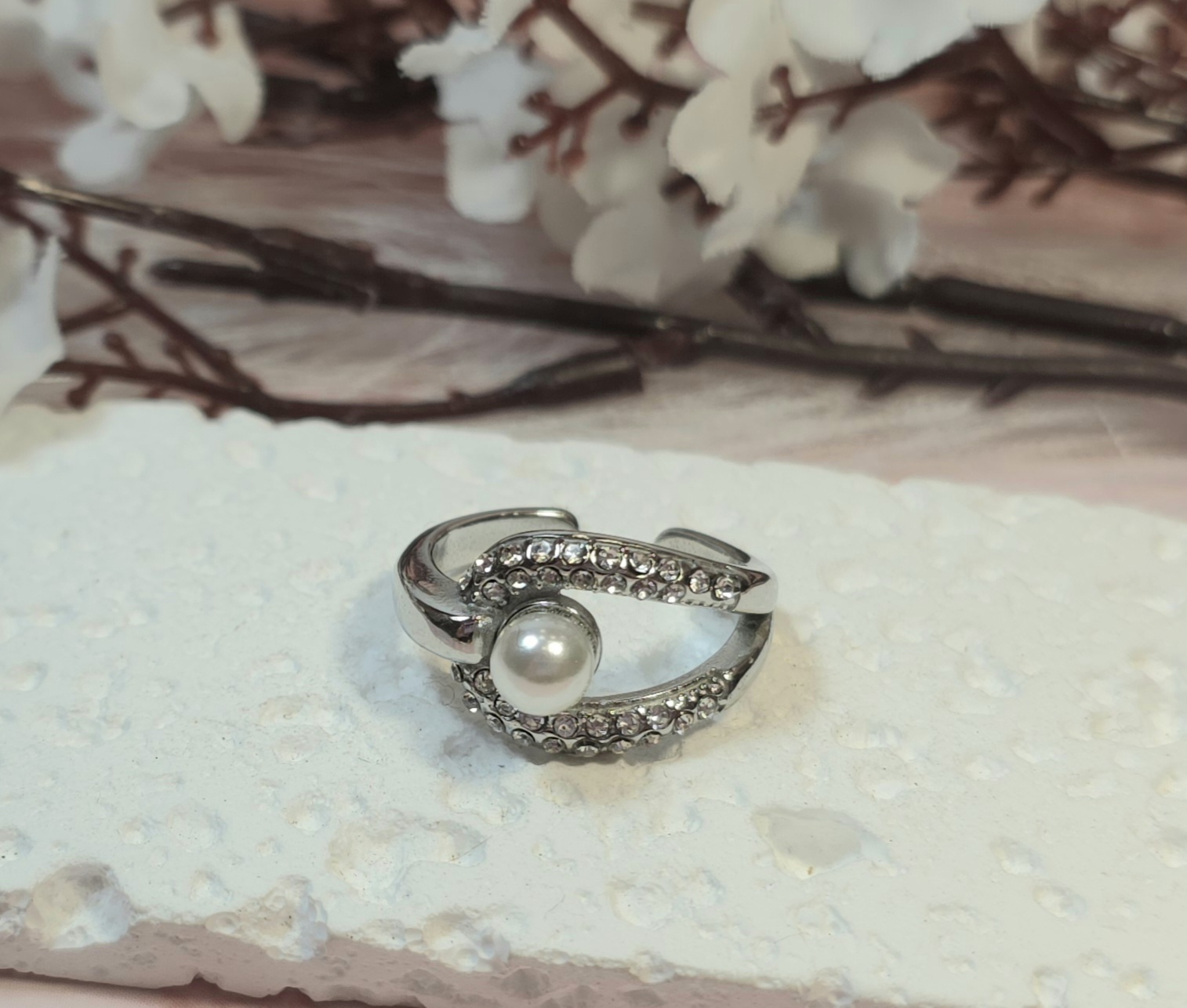 Ατσάλινο δαχτυλίδι με στρας και πέρλα. Είναι υποαλλεργικό. Ανοιγοκλείνει. Υπάρχει σε ασημί και χρυσό χρώμα.