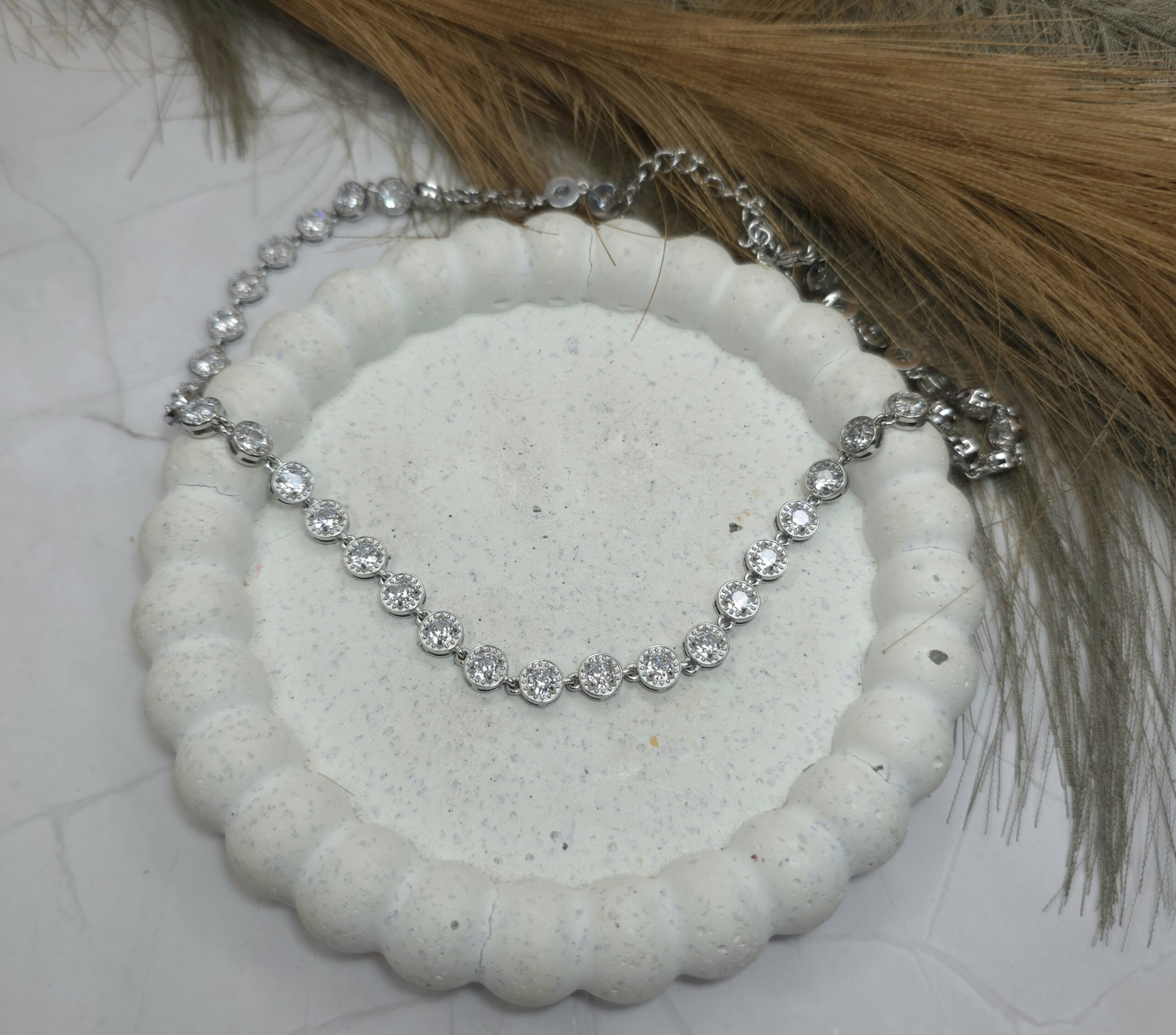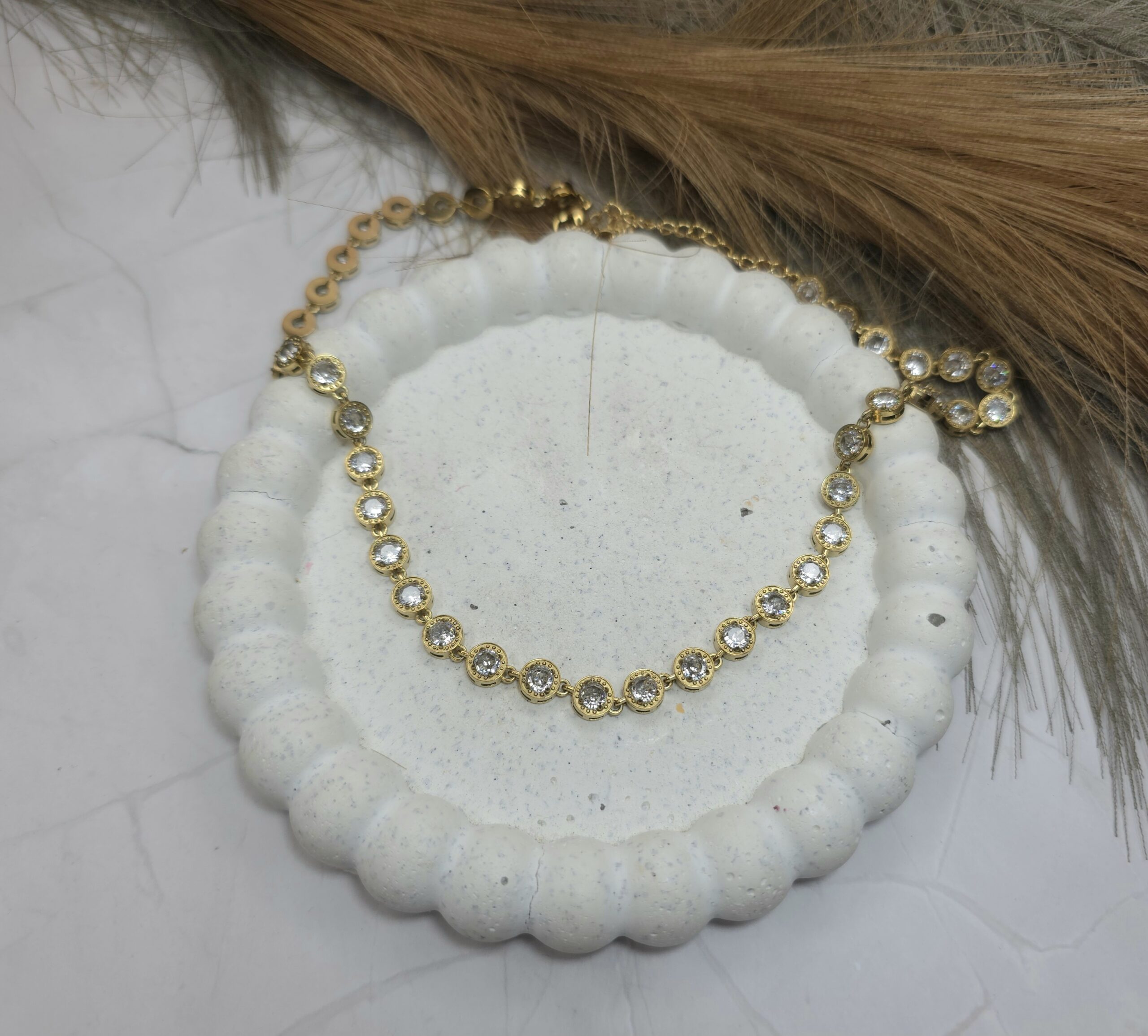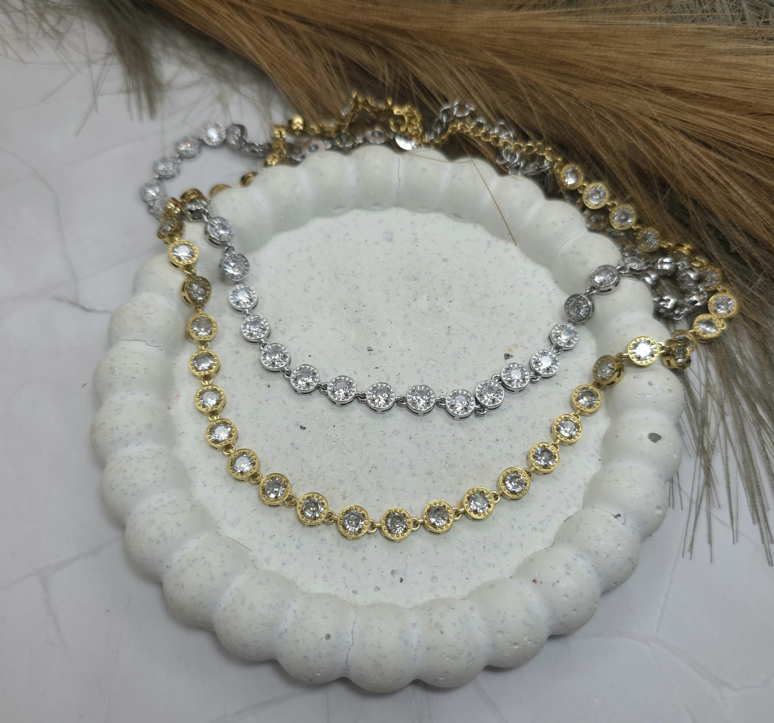 Ατσάλινο κολιέ ριβιέρα. Έχει αυξομείωση. Είναι υποαλλεργικό. Υπάρχει σε ασημί και χρυσό χρώμα με διάφανες πέτρες.