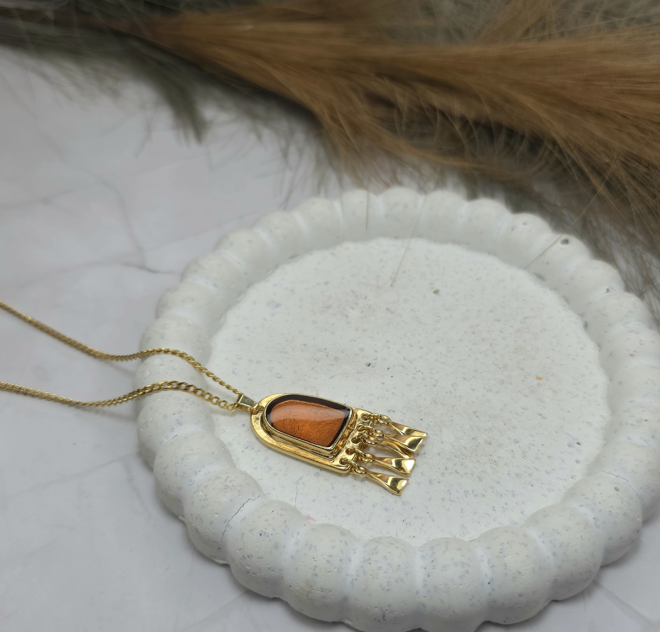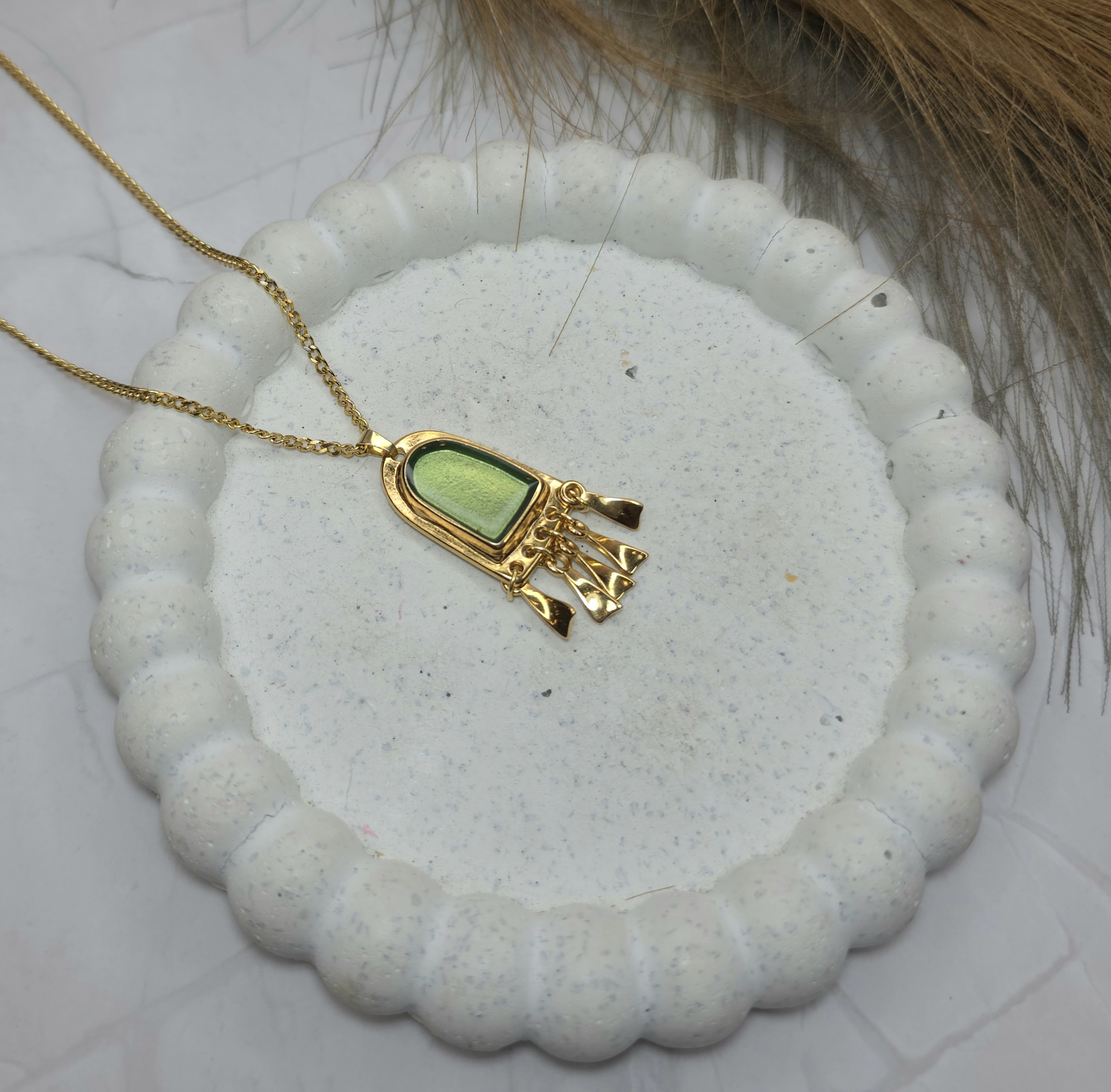 Κολιέ από ατσάλινη αλυσίδα και επίχρυσο στοιχείο με πράσινο ή καφέ σμάλτο. Έχει αυξομείωση. Είναι υποαλλεργικό. Υπάρχει σε χρυσό χρώμα.