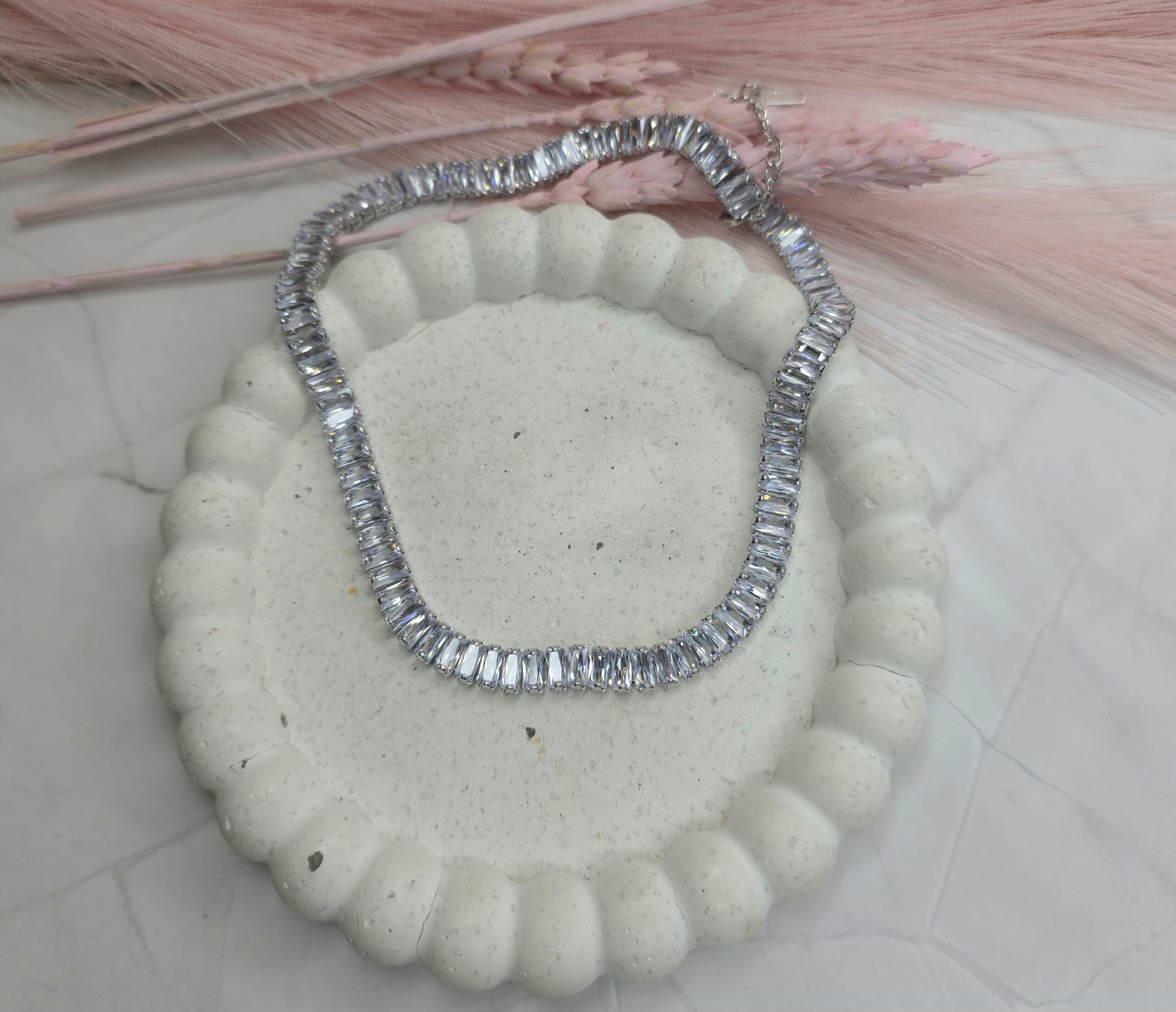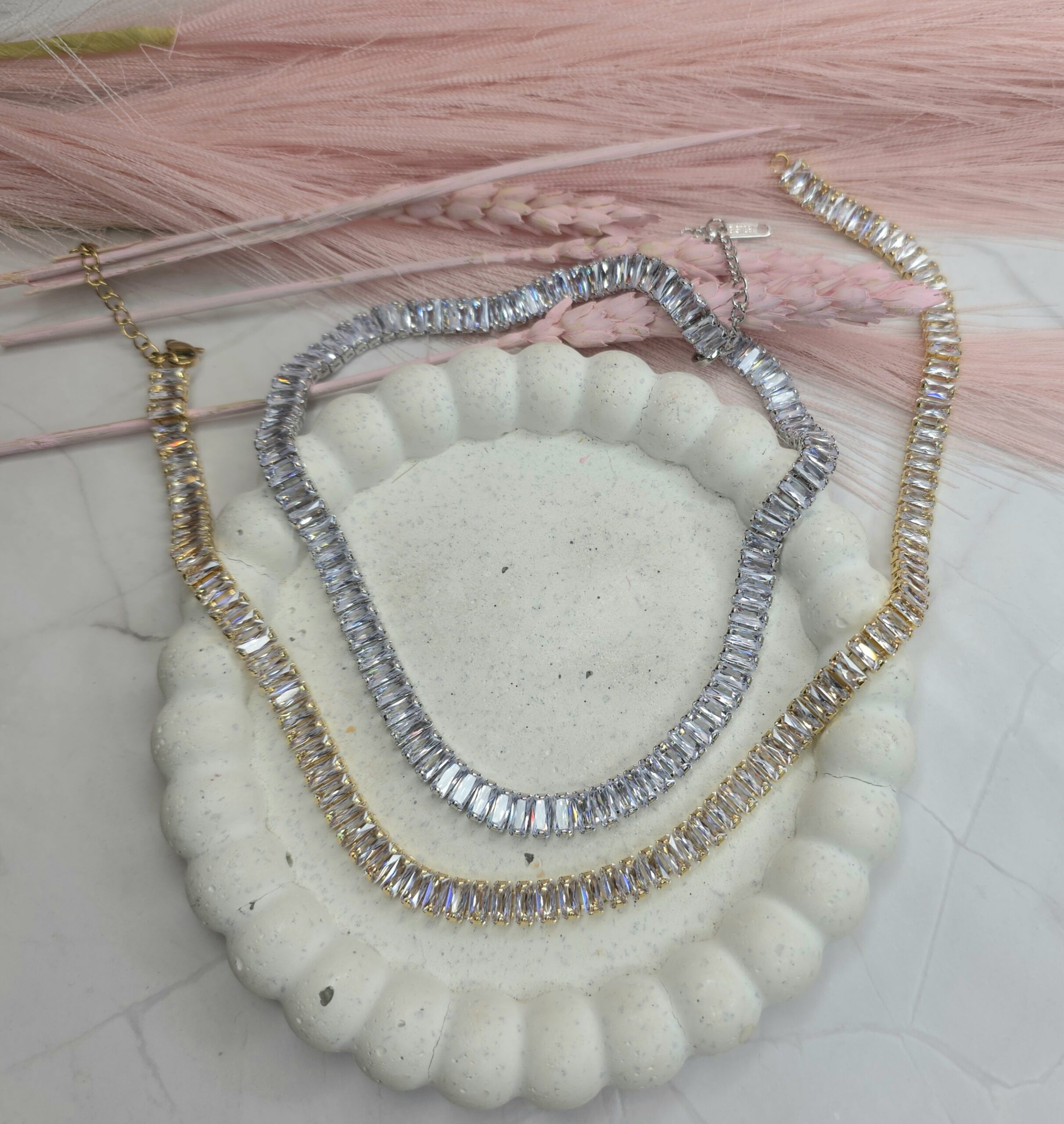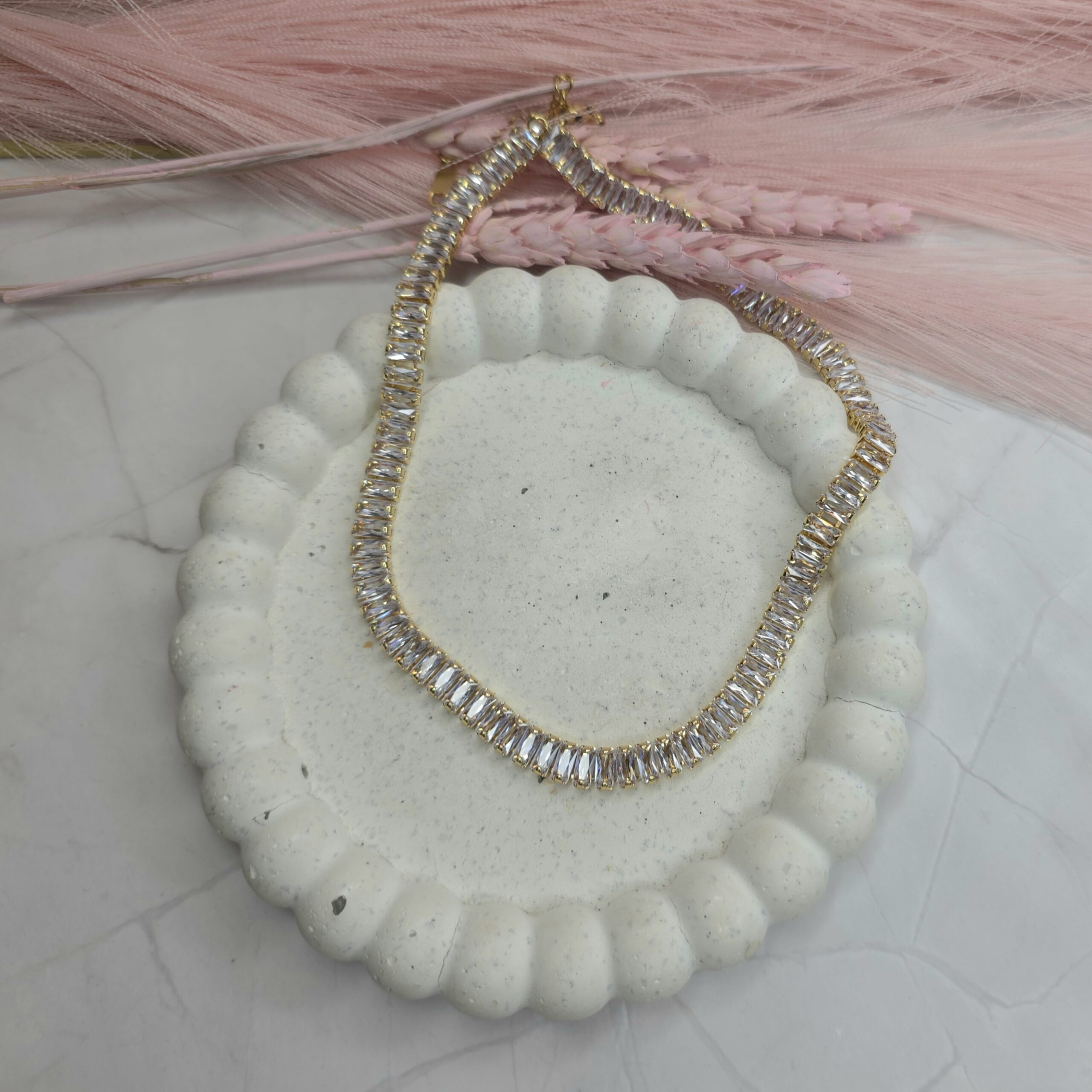 Ατσάλινο κολιέ ριβιέρα. Έχει αυξομείωση. Είναι υποαλλεργικό. Υπάρχει σε χρυσό χρώμα με διάφανες πέτρες.