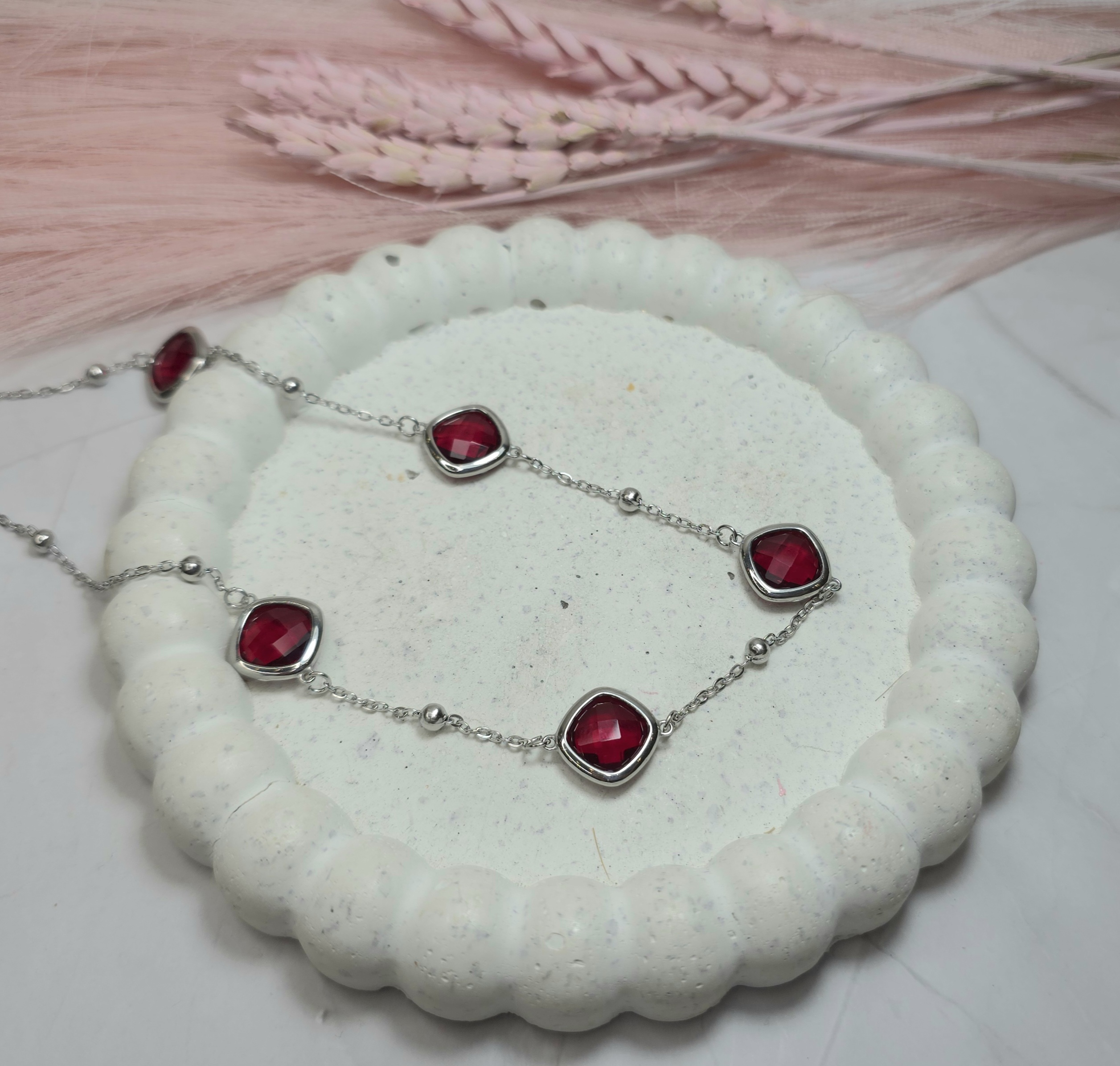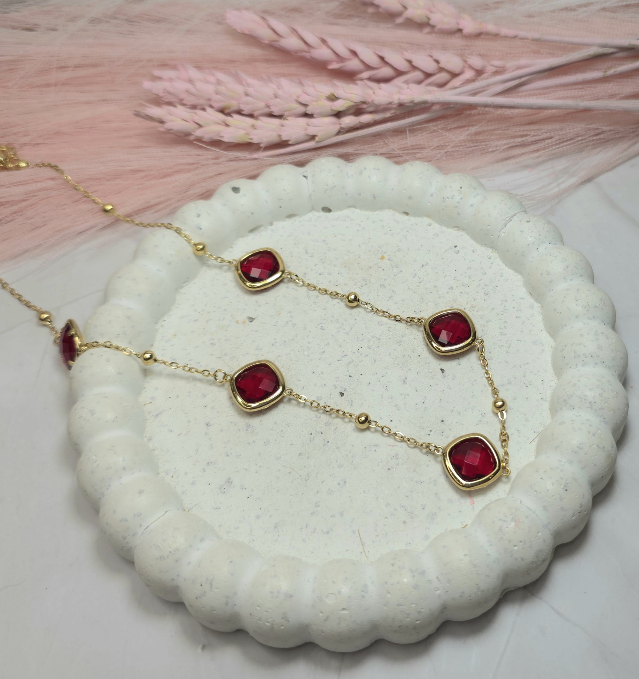 Ατσάλινο κολιέ με πέτρες. Έχει αυξομείωση. Είναι υποαλλεργικό. Υπάρχει σε ασημί και χρυσό χρώμα με κόκκινες πέτρες.