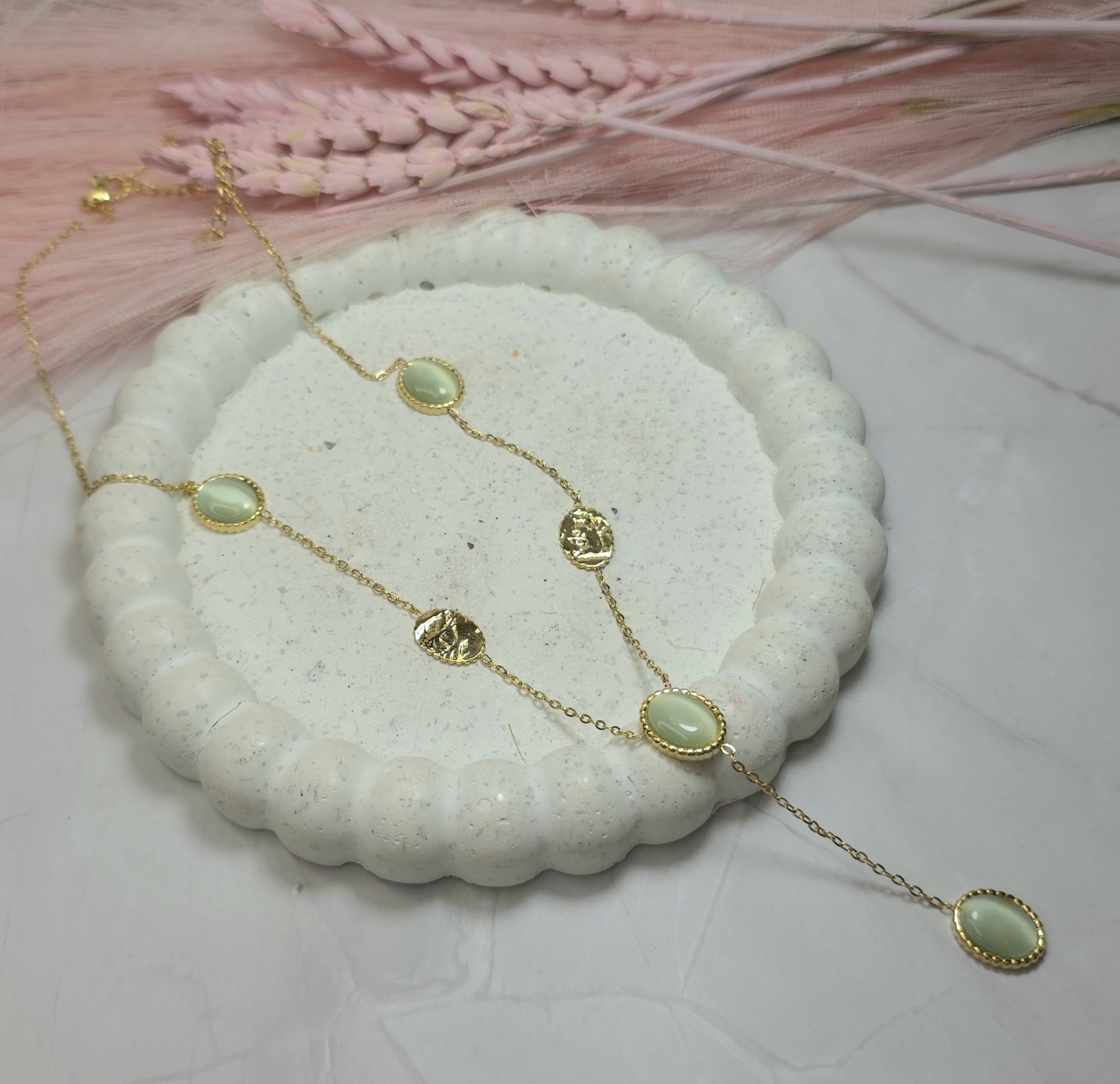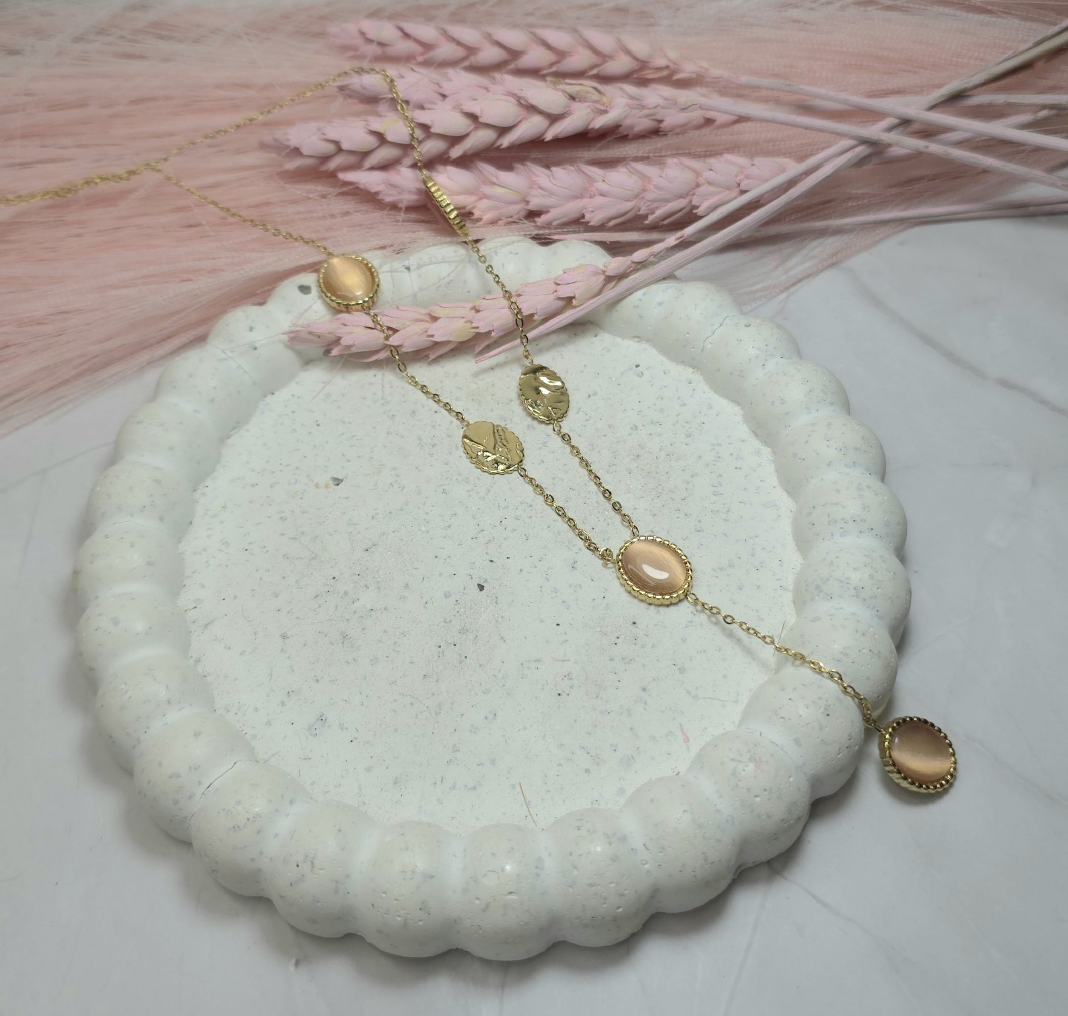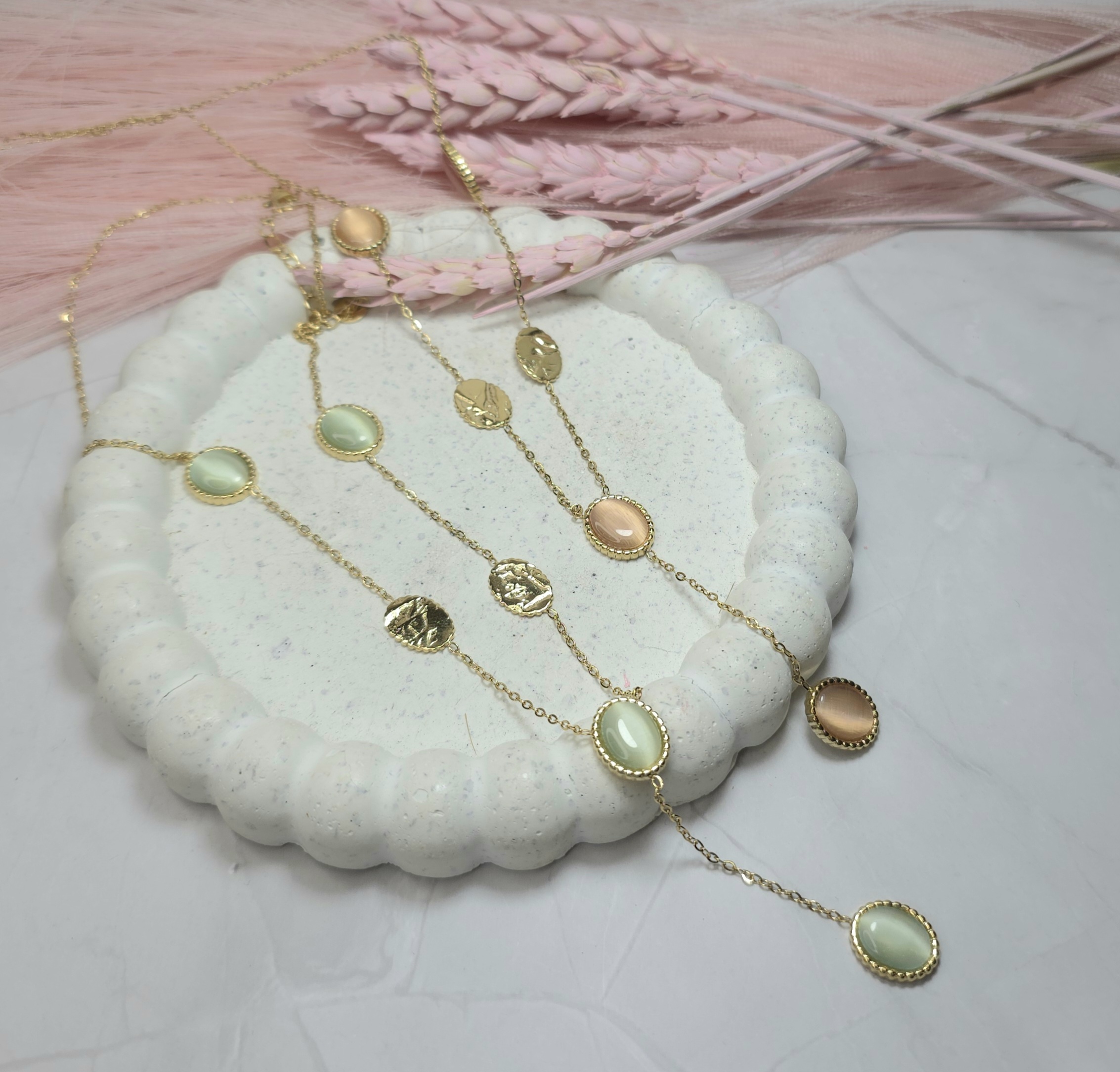 Ατσάλινο κολιέ με πέτρες σε σχήμα σταγόνας. Έχει αυξομείωση. Είναι υποαλλεργικό. Υπάρχει σε χρυσό χρώμα με ροζ ή πράσινες πέτρες.